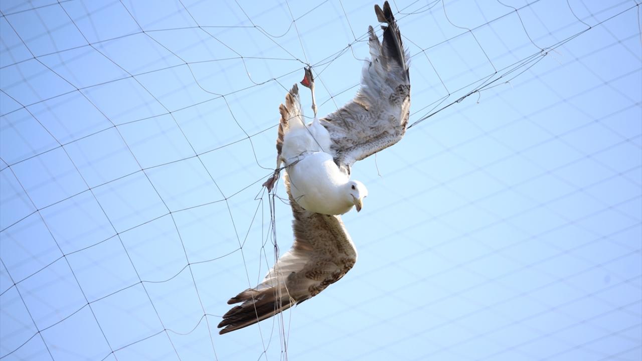 Kırklareli'nde halı sahanın filesine takılarak mahsur kalan martı, itfaiye ekiplerince kurtarıldı.