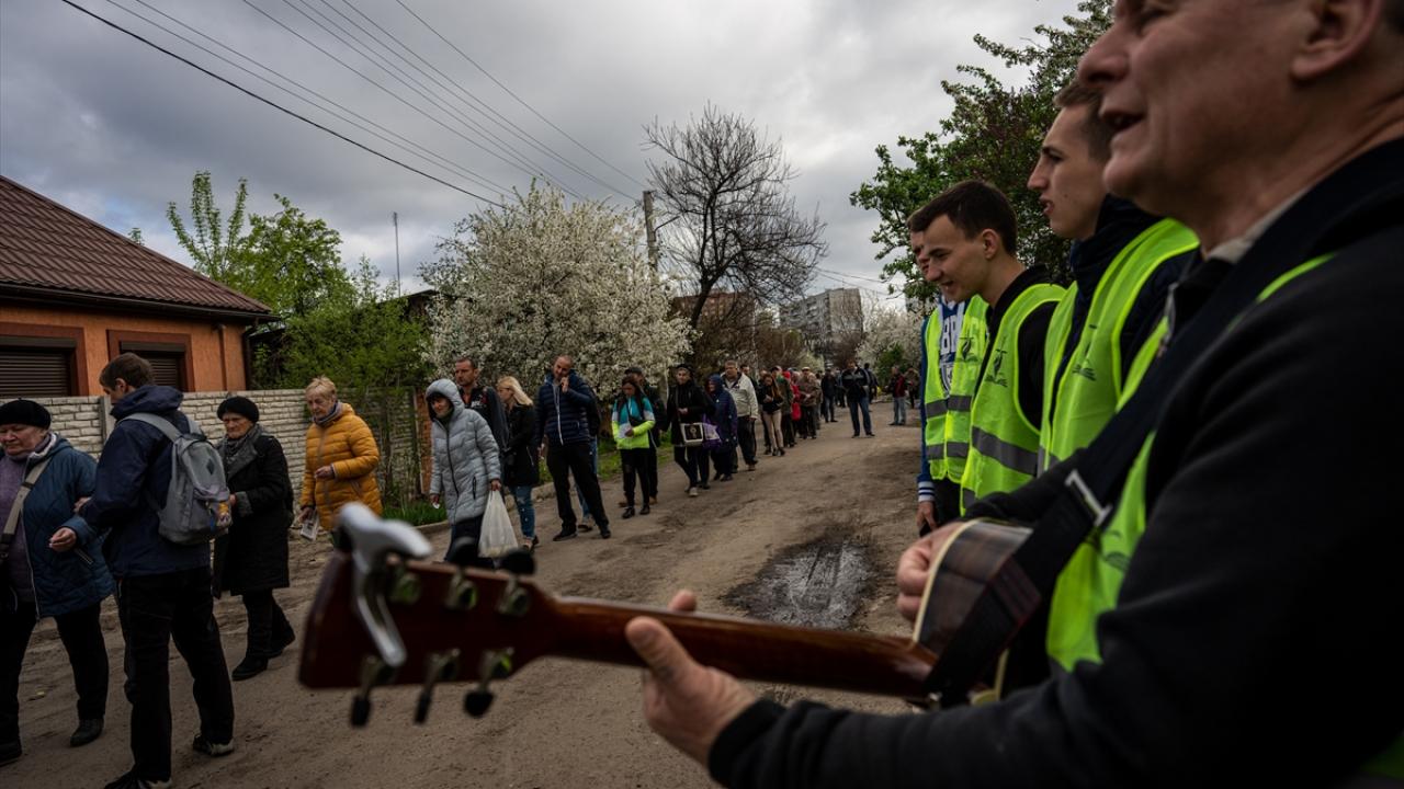 Savaştan etkilenen sivillerin moralini düzeltmek isteyen gönüllüler, yiyecek dağıtımı sırasında Harkivlilere canlı müzik dinletisi de sundu.