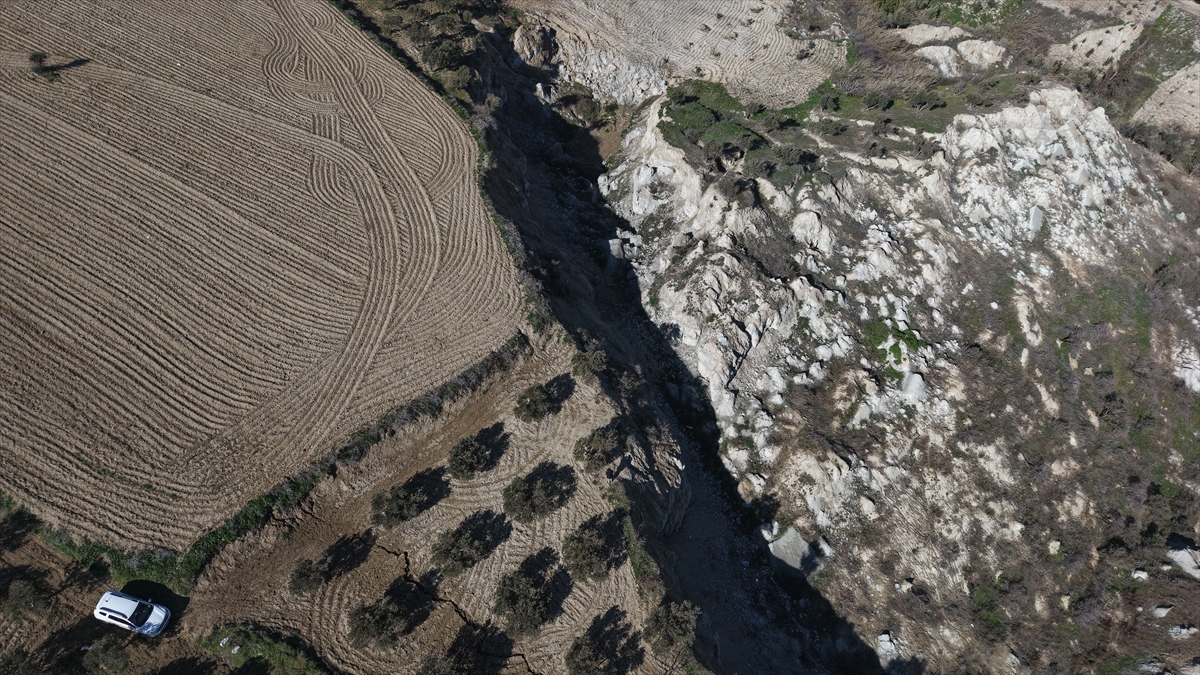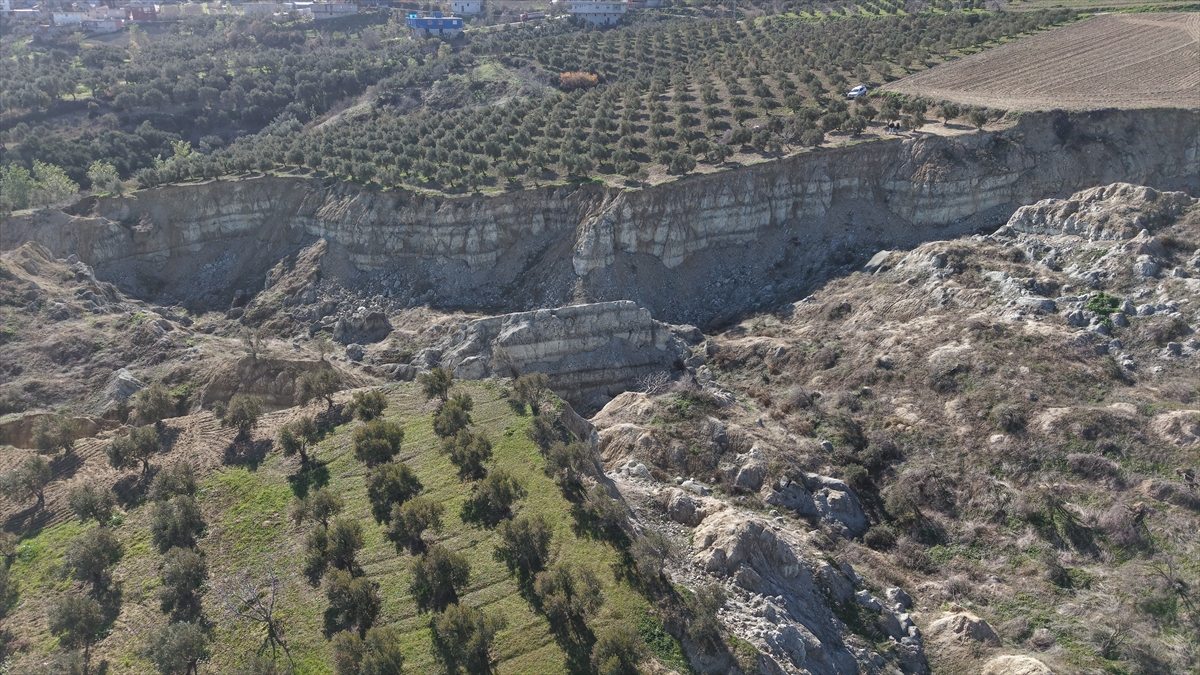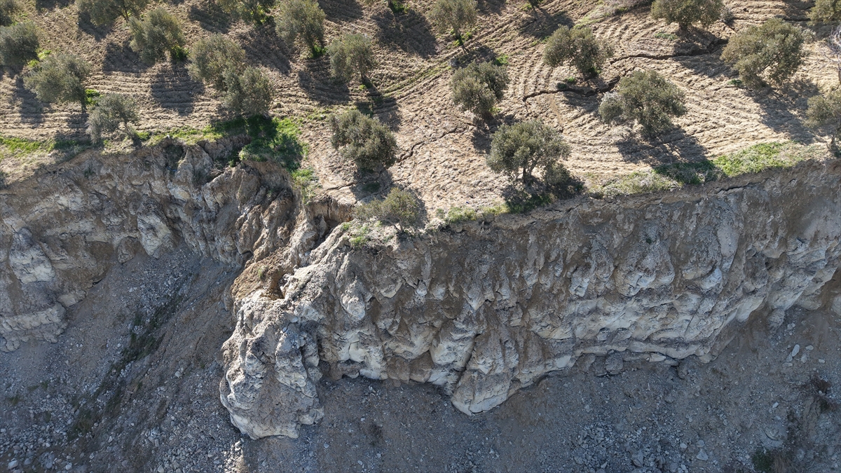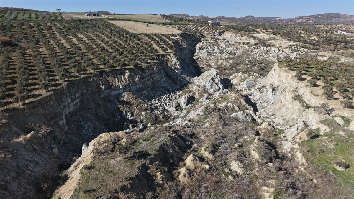 Kahramanmaraş`ın Pazarcık ve Elbistan ilçeleri merkezli 7,7 ve 7,6 büyüklüğündeki depremlerin ardından Tepehan Mahallesi`ndeki zeytin bahçesinde meydana gelen 400 metre uzunluktaki yarık, afetin yıkıcı etkisinin görüldüğü yerler arasında bulunuyor.