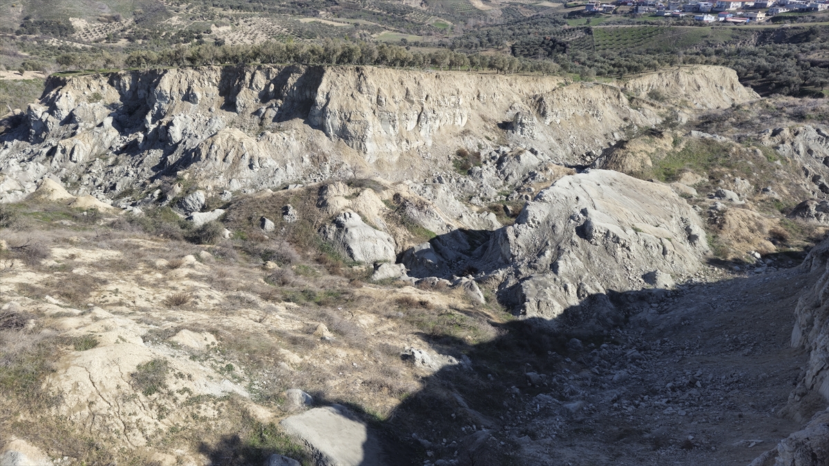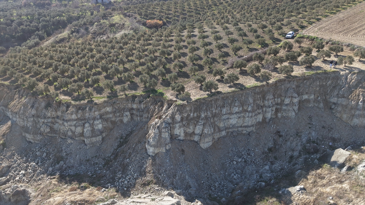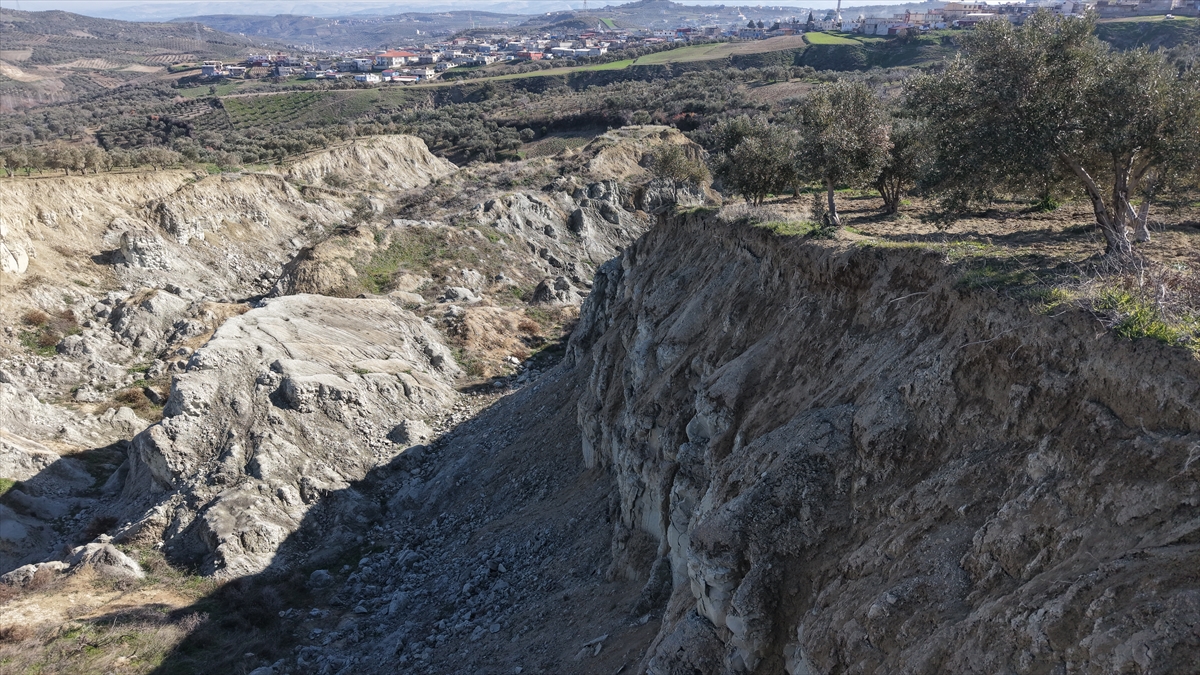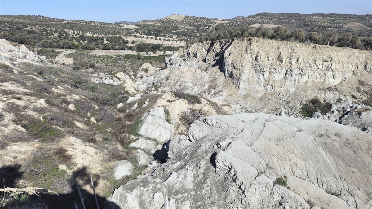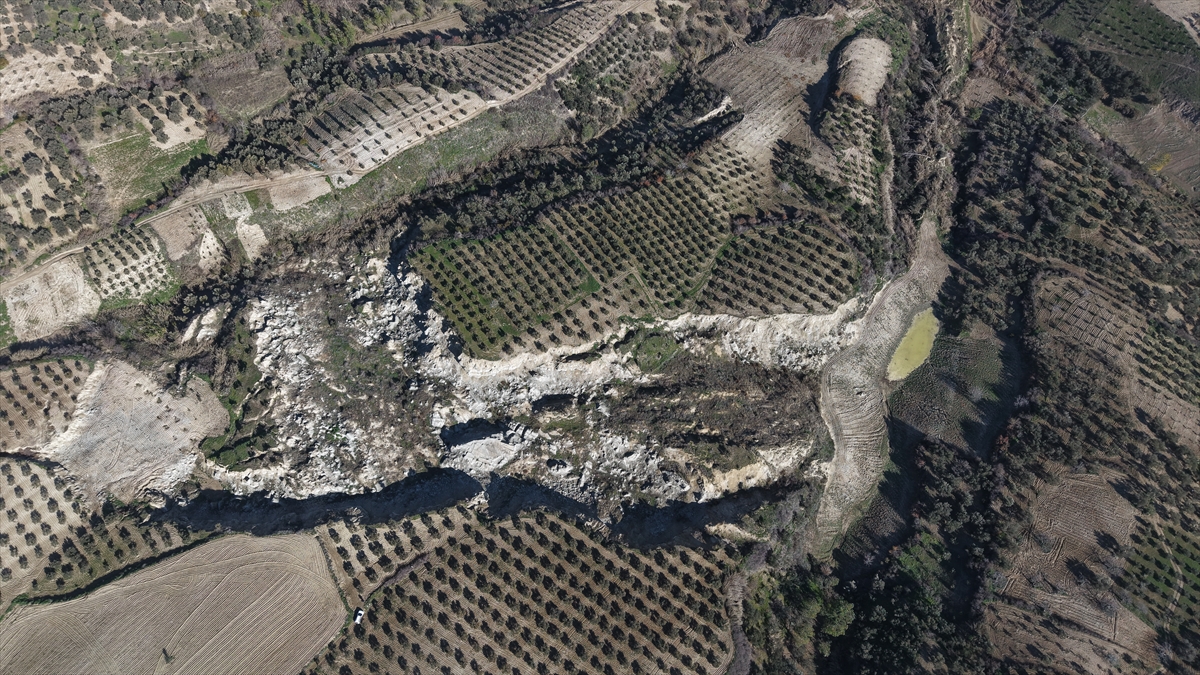 Kahramanmaraş`ın Pazarcık ve Elbistan ilçeleri merkezli 7,7 ve 7,6 büyüklüğündeki depremlerin ardından Tepehan Mahallesi`ndeki zeytin bahçesinde meydana gelen 400 metre uzunluktaki yarık, afetin yıkıcı etkisinin görüldüğü yerler arasında bulunuyor.