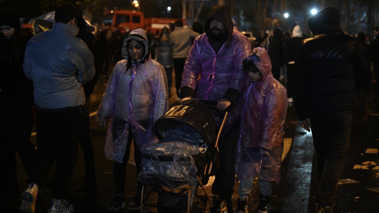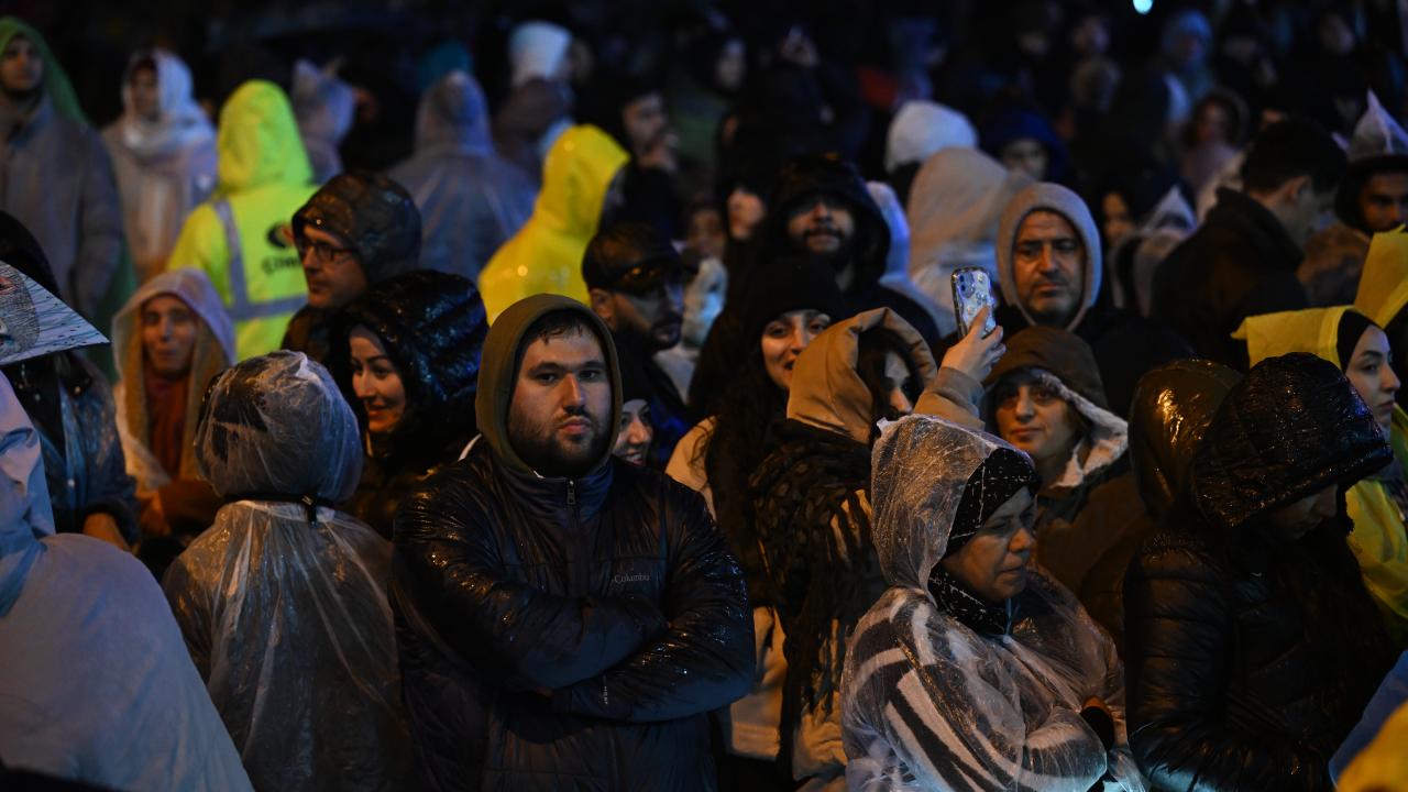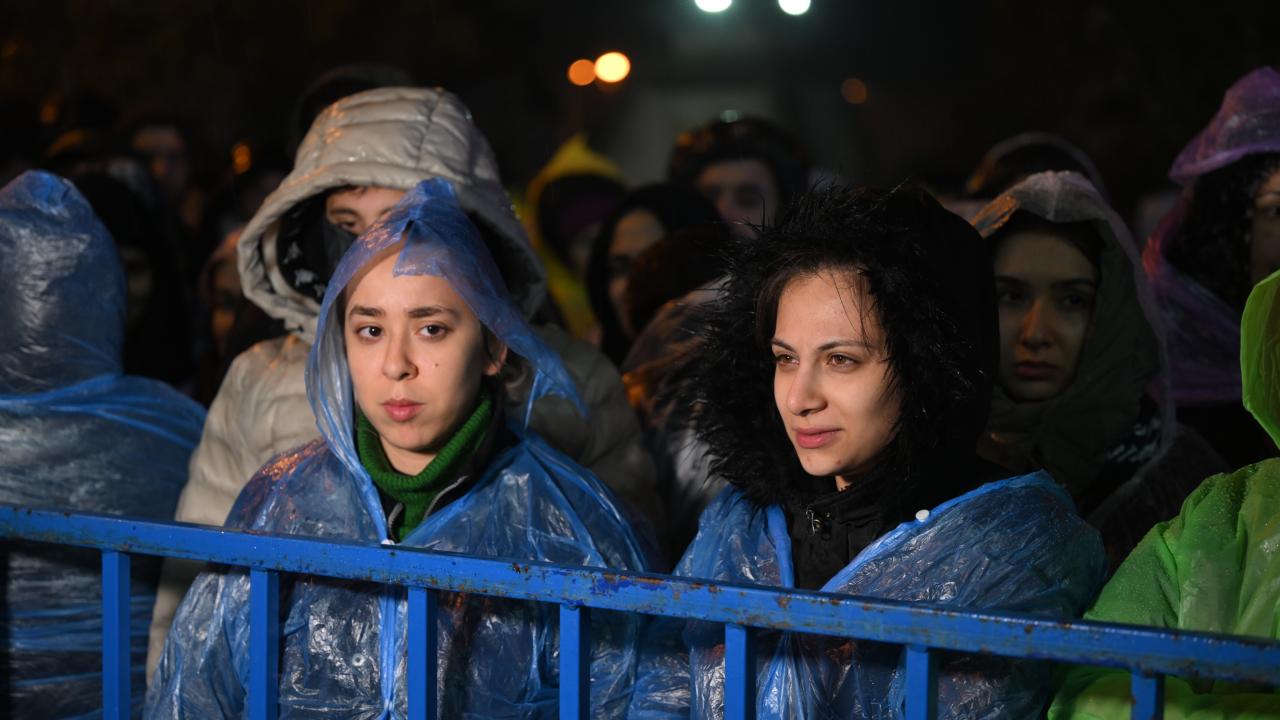 Ailecek meydana gidenler, yağışlı havaya rağmen ellerinde şemsiyelerle anma saatini bekledi.