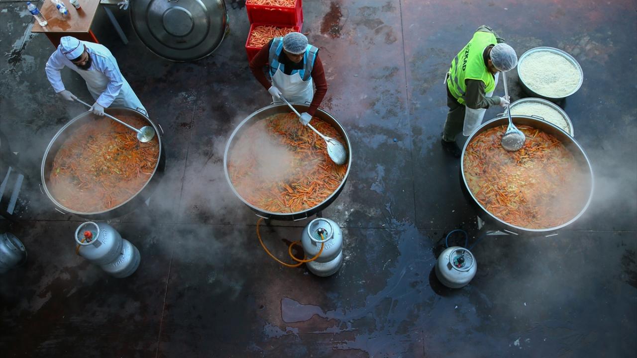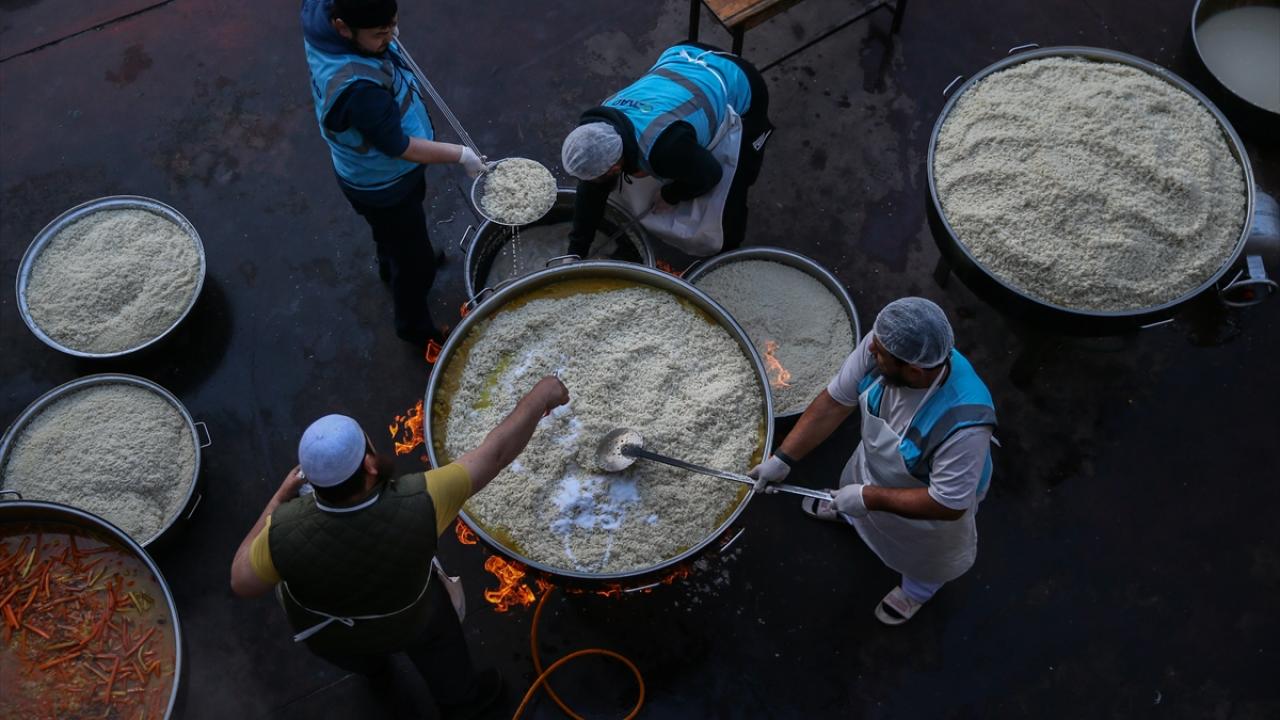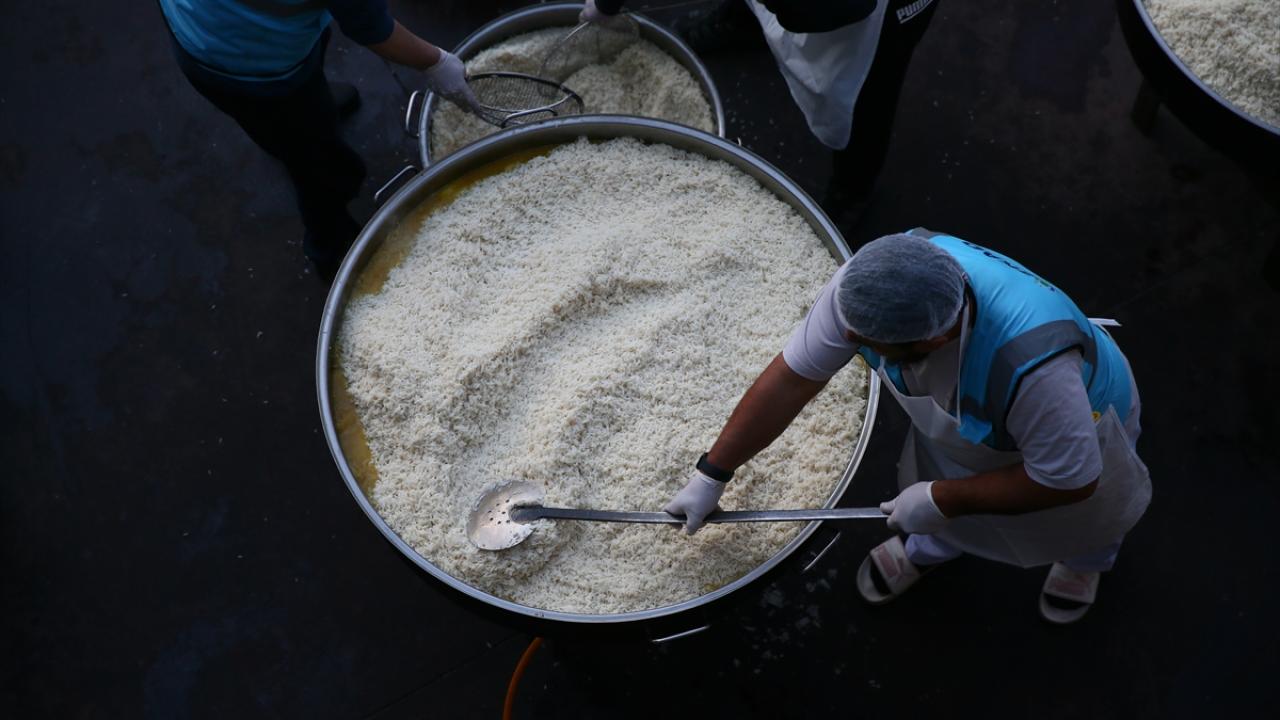 Hatay'da depremzedeler için dev kazanlarda Özbek pilavı pişiriliyor