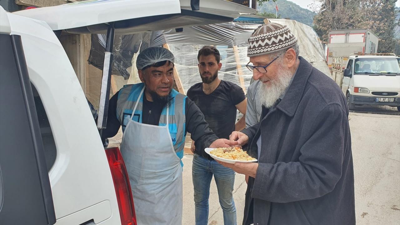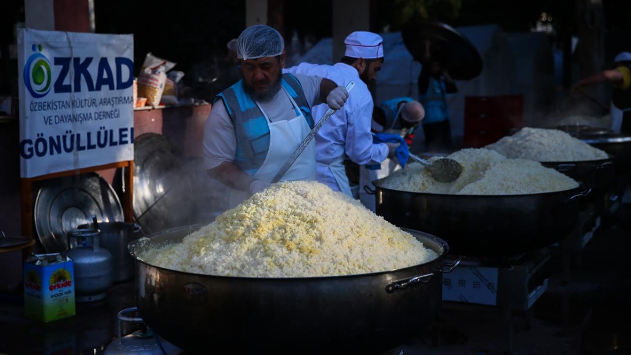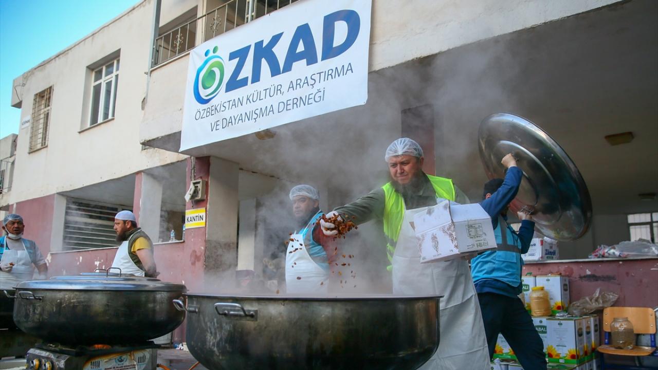Dev kazanlarda, başta Özbek pilavı olmak üzere günlük 16 bin kişilik yemek pişirmek için sabahın erken saatlerinde kolları sıvayan Özbek aşçılar, bunları gönüllüler aracılığıyla İskenderun, Kırıkhan ve Antakya`da depremzedelere ulaştırıyor.