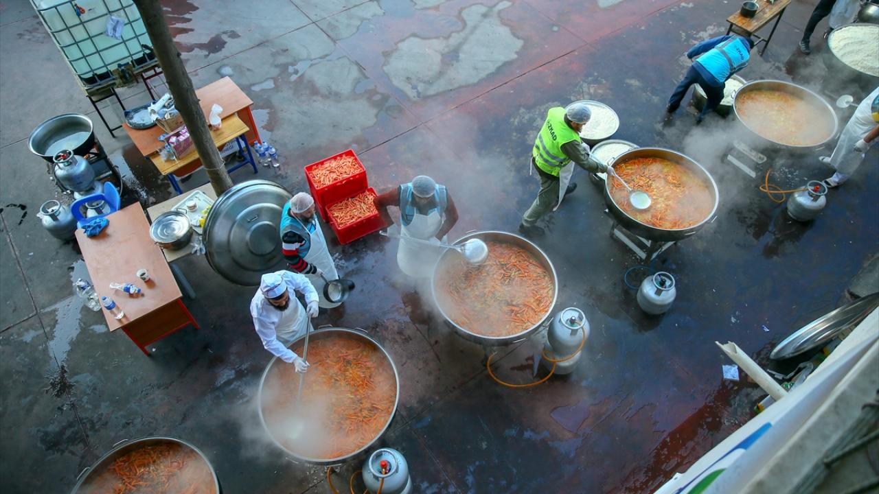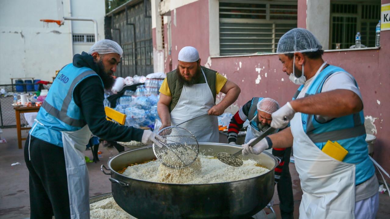 Çok sayıda insani yardım malzemesini ihtiyaç sahiplerine dağıtan gönüllüler, İHH İnsani Yardım Vakfının koordinesinde, İskenderun`da oluşturdukları mutfakta depremzedeler için yemek hazırlıyor.