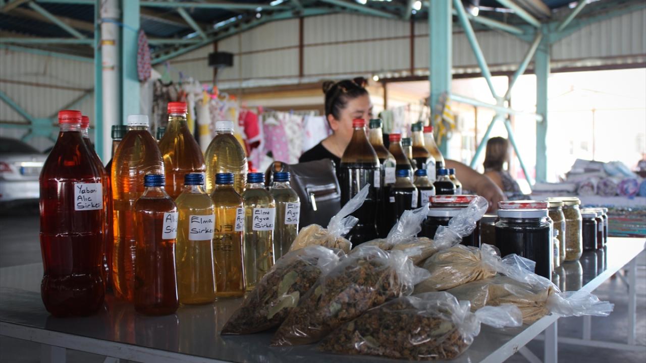 Kadınlar, evlerinde ve yaşadıkları konteyner kentlerde imece usulü hazırladıkları, turşudan nar ekşisi ve zeytine, takıdan çeşitli süs eşyalarına çok sayıda ürünü haftanın iki günü pazara getiriyor.