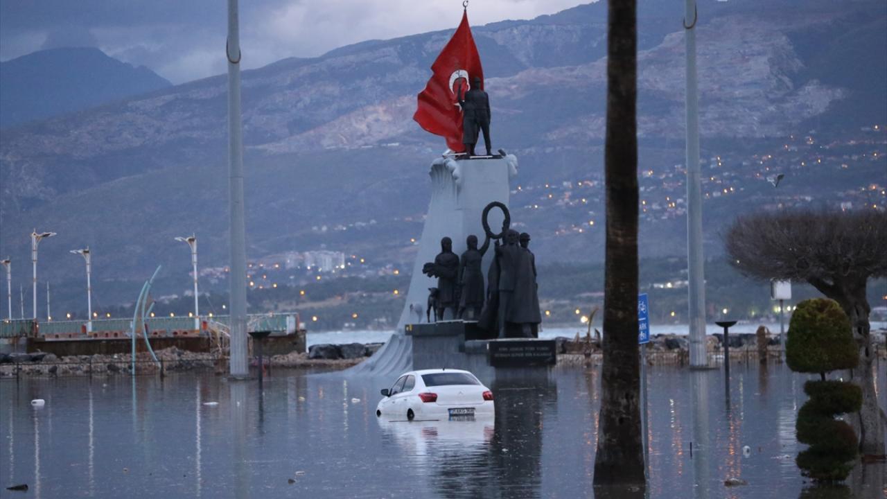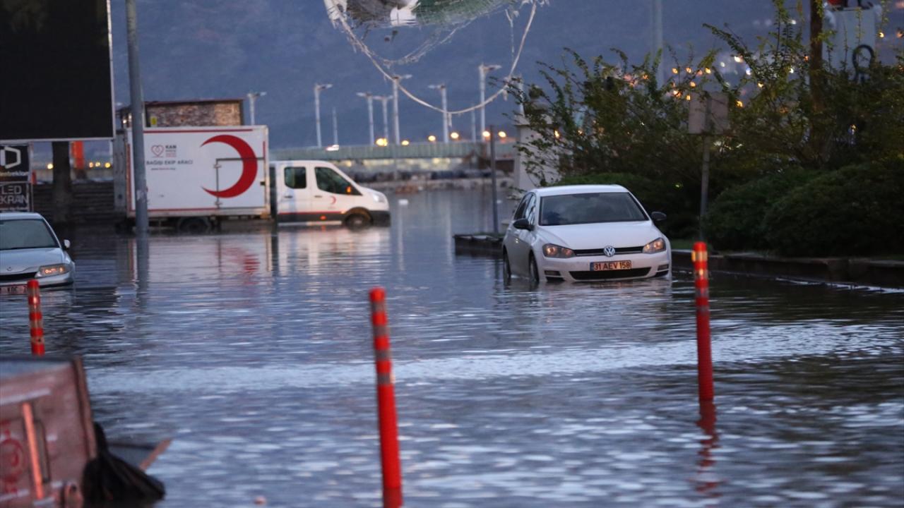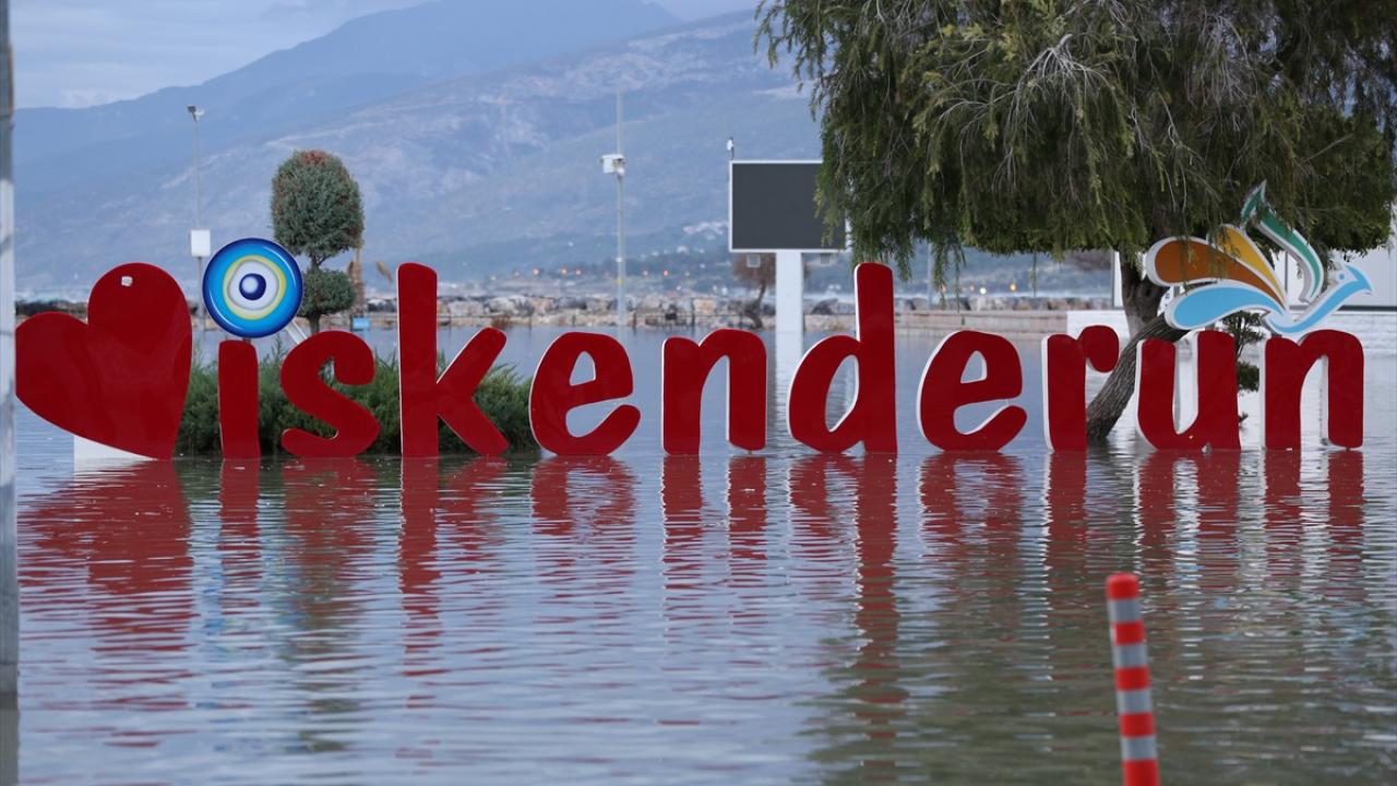 Hatay'ın İskenderun ilçesi sahilinde, sağanak ve kuvvetli rüzgar nedeniyle denizin taşması sonucu yollar su altında kaldı, bazı ev ve iş yerlerini su bastı.
