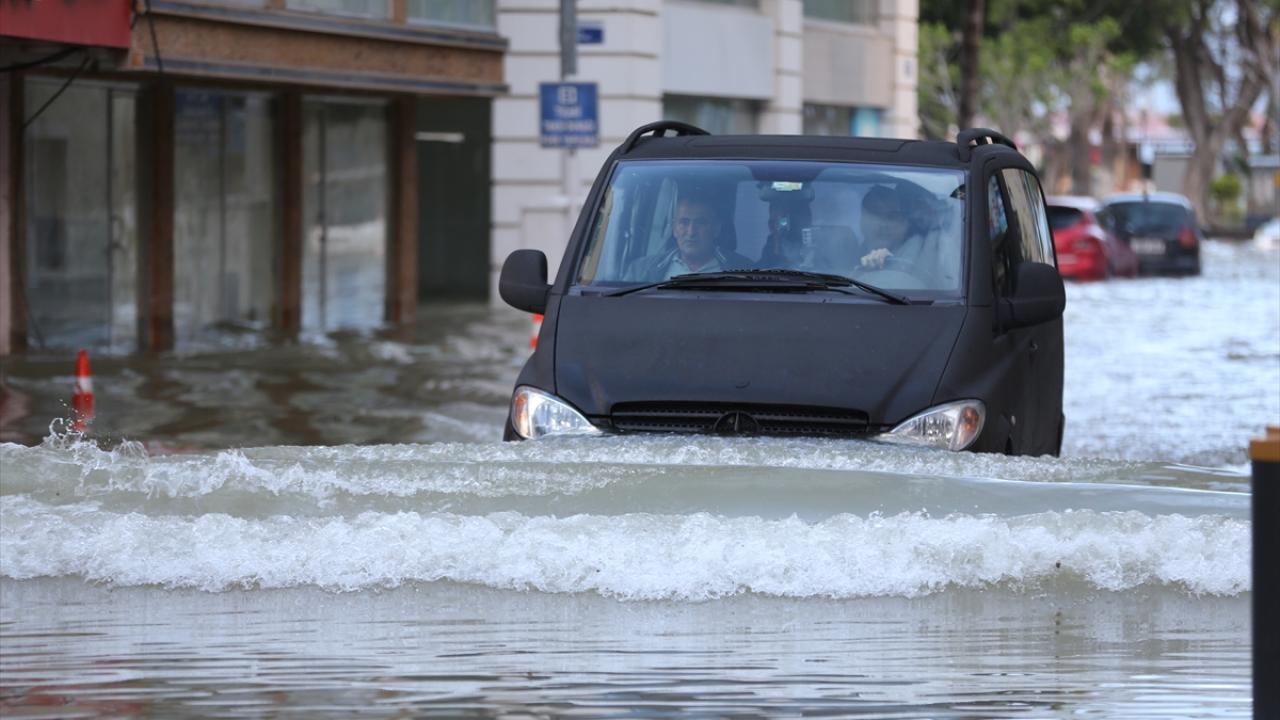 Yağış ve kuvvetli rüzgar nedeniyle deniz taşması sonucu sahil kısmındaki Anıt Meydanı ile Atatürk Bulvarı`nda su birikintileri oluştu.