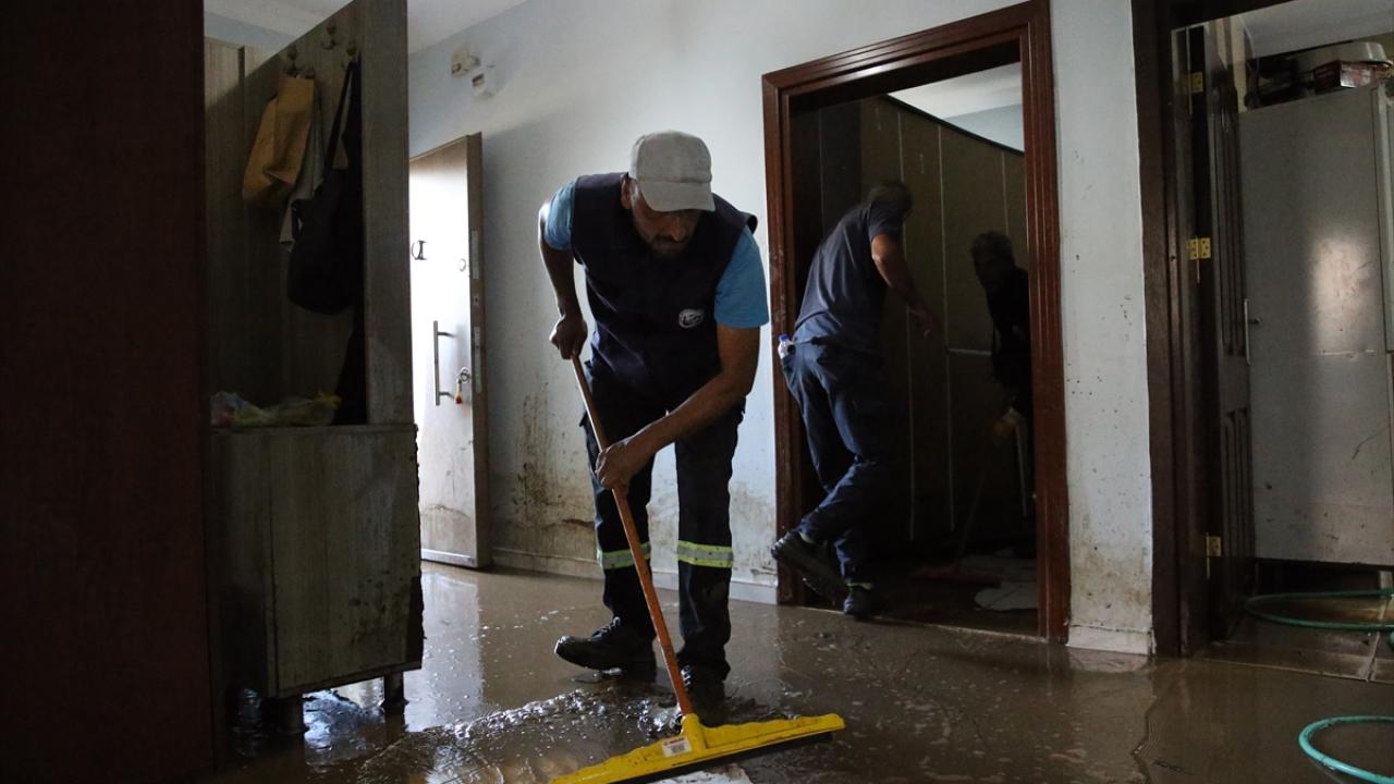 Ev ve iş yerlerindeki çamuru temizleyen vatandaşlara destek olan ekipler, biriken suları tahliye etti.