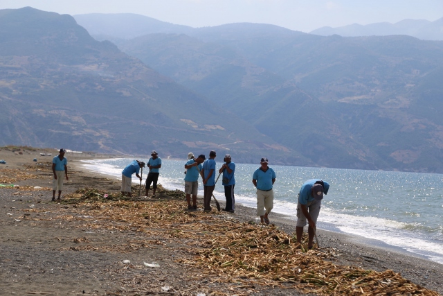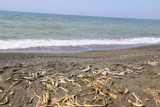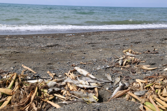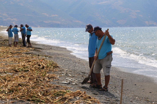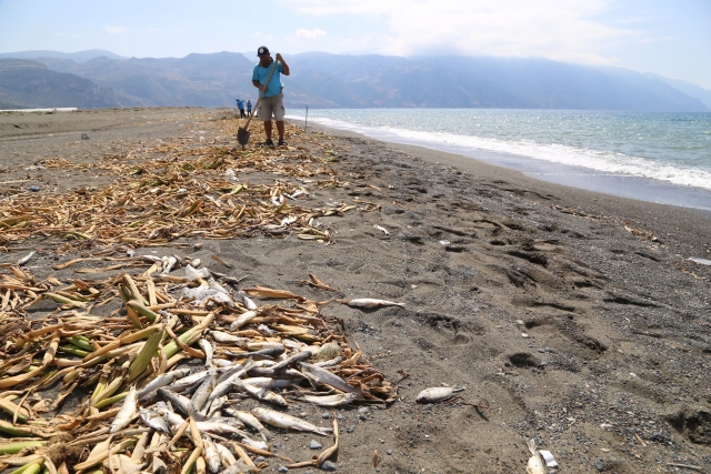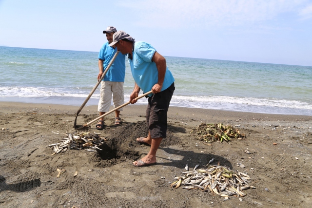 Hatay'ın Samandağ ilçesinde Asi Nehri'nin denize döküldüğü noktada bulunan çok sayıda ölü balık, belediye ekiplerince toplandı. Nehrin denizle buluştuğu bölgede dün görülen ölü balıkların kaldırılması için çalışma başlatıldı.