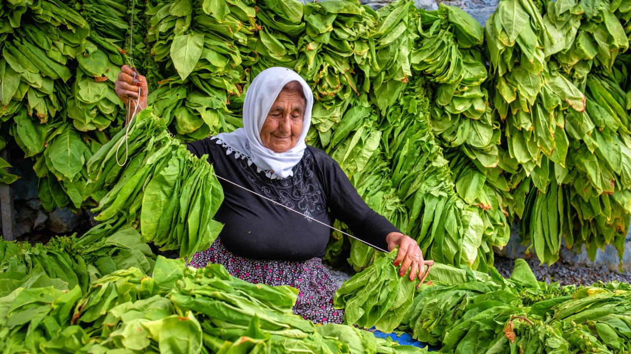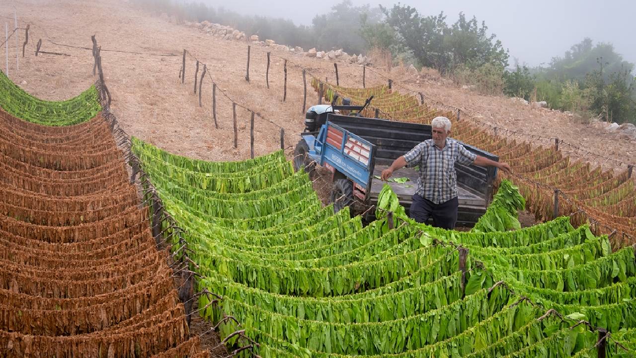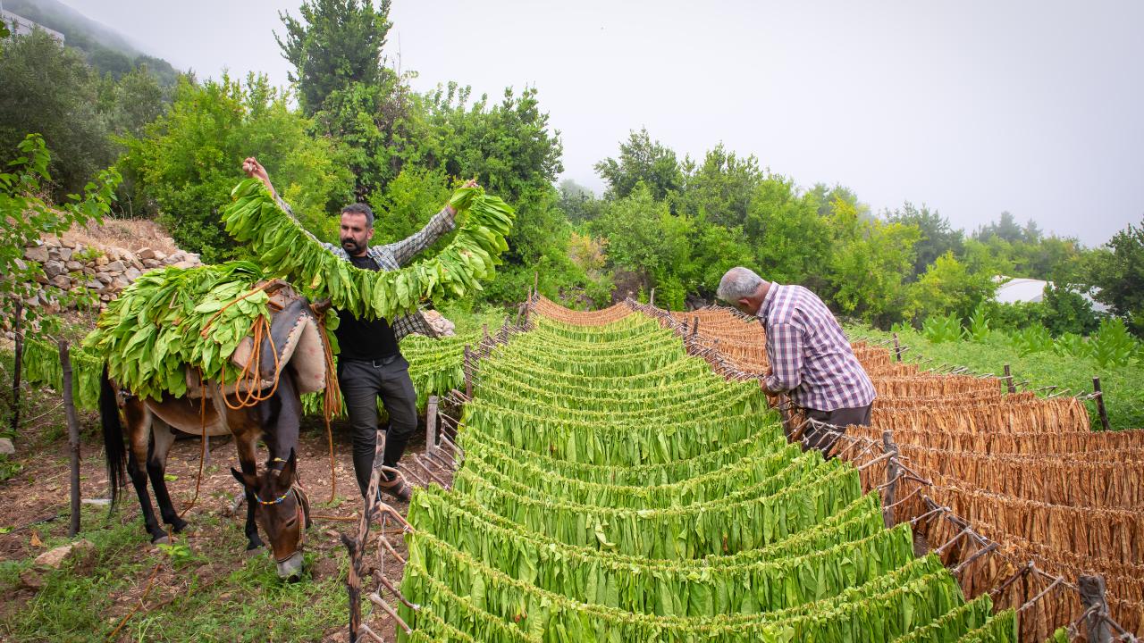 Çiftçiler, günün ilk ışıklarıyla topladıkları tütün yapraklarını iğne yardımıyla tek tek iplere dizerek kurutmaya bırakıyor.