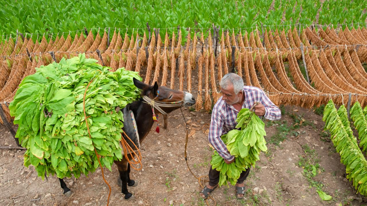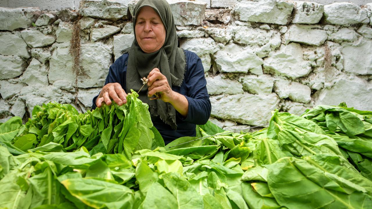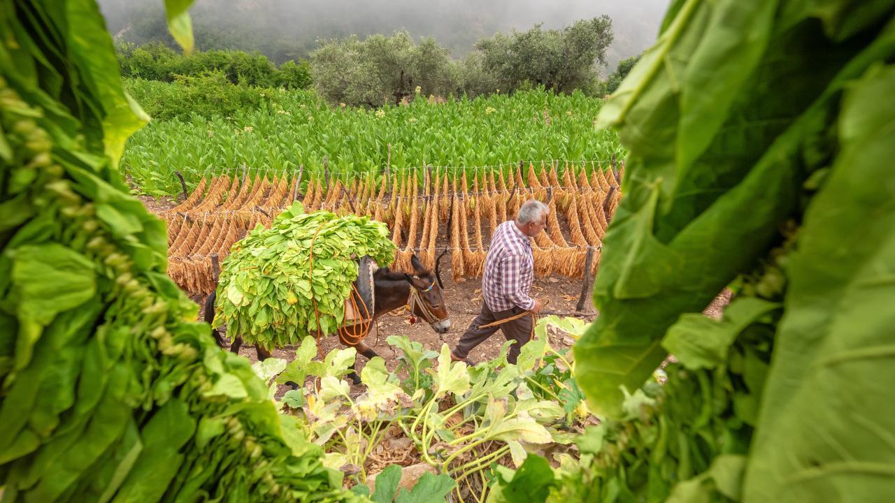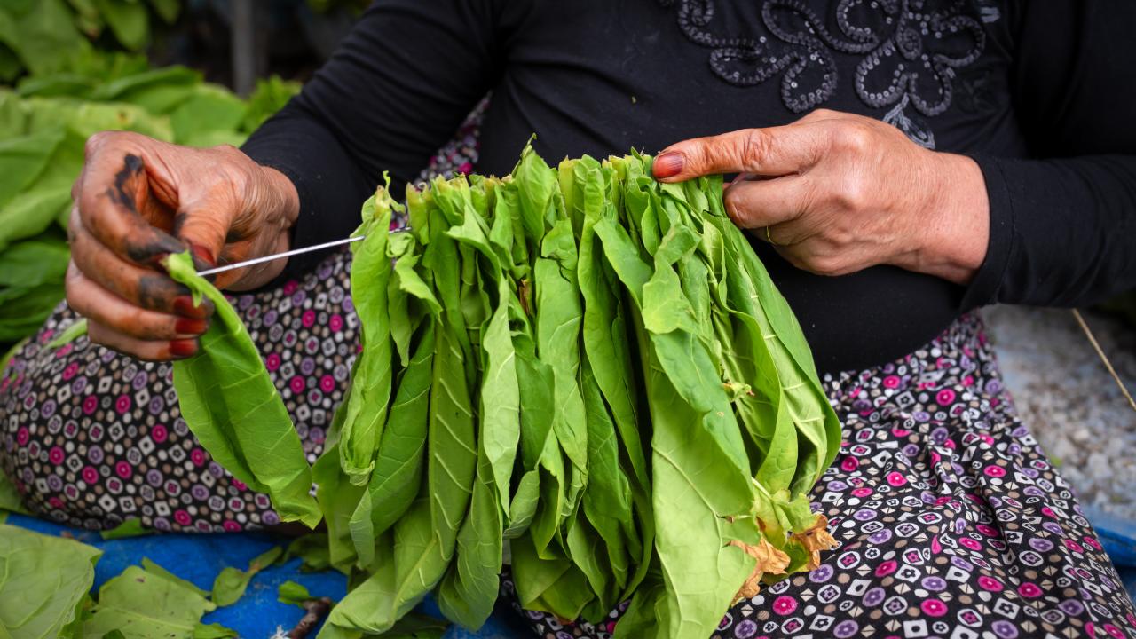 Çiftçiler, günün ilk ışıklarıyla topladıkları tütün yapraklarını iğne yardımıyla tek tek iplere dizerek kurutmaya bırakıyor.