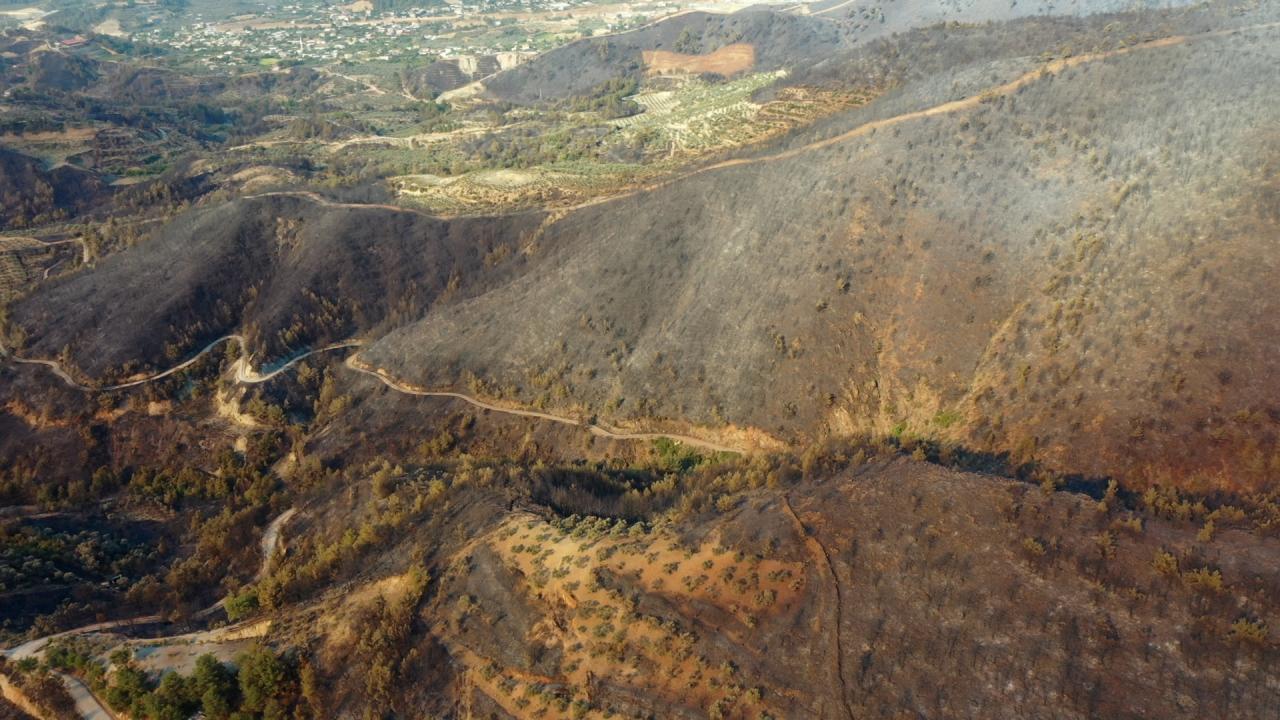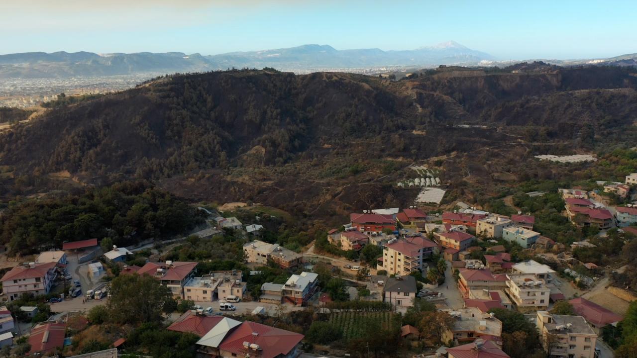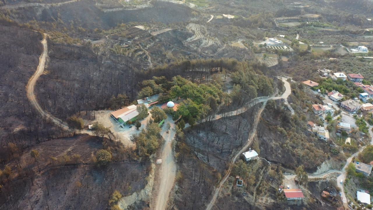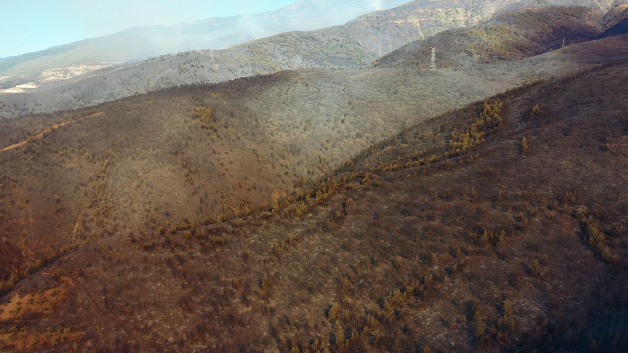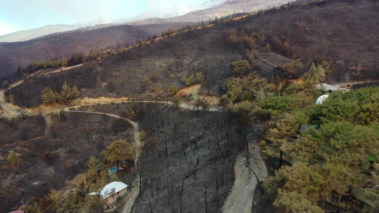 Yangının etkili olduğu 3 mahallede zarar gören alanlar dronla görüntülendi. Görüntülerde, yanan alanların yerleşim yerlerine yakınlığı ve alandaki birçok ağacın küle dönmesi yer alıyor.