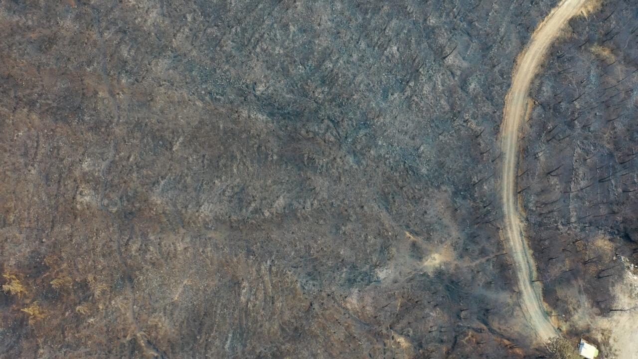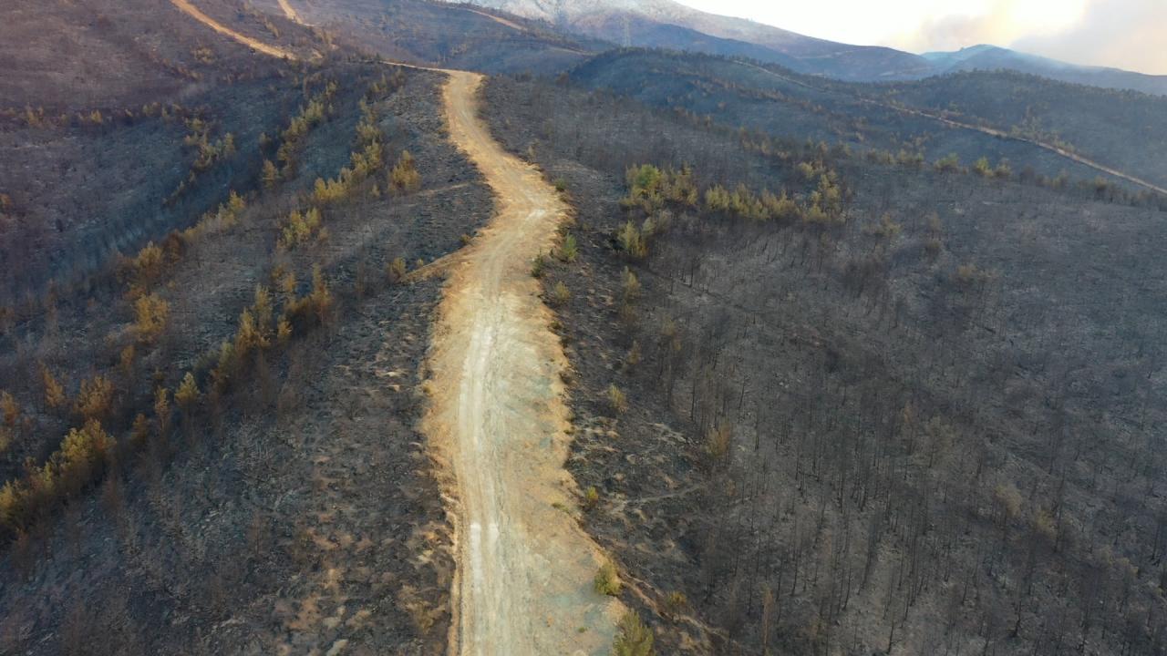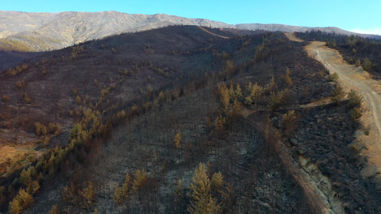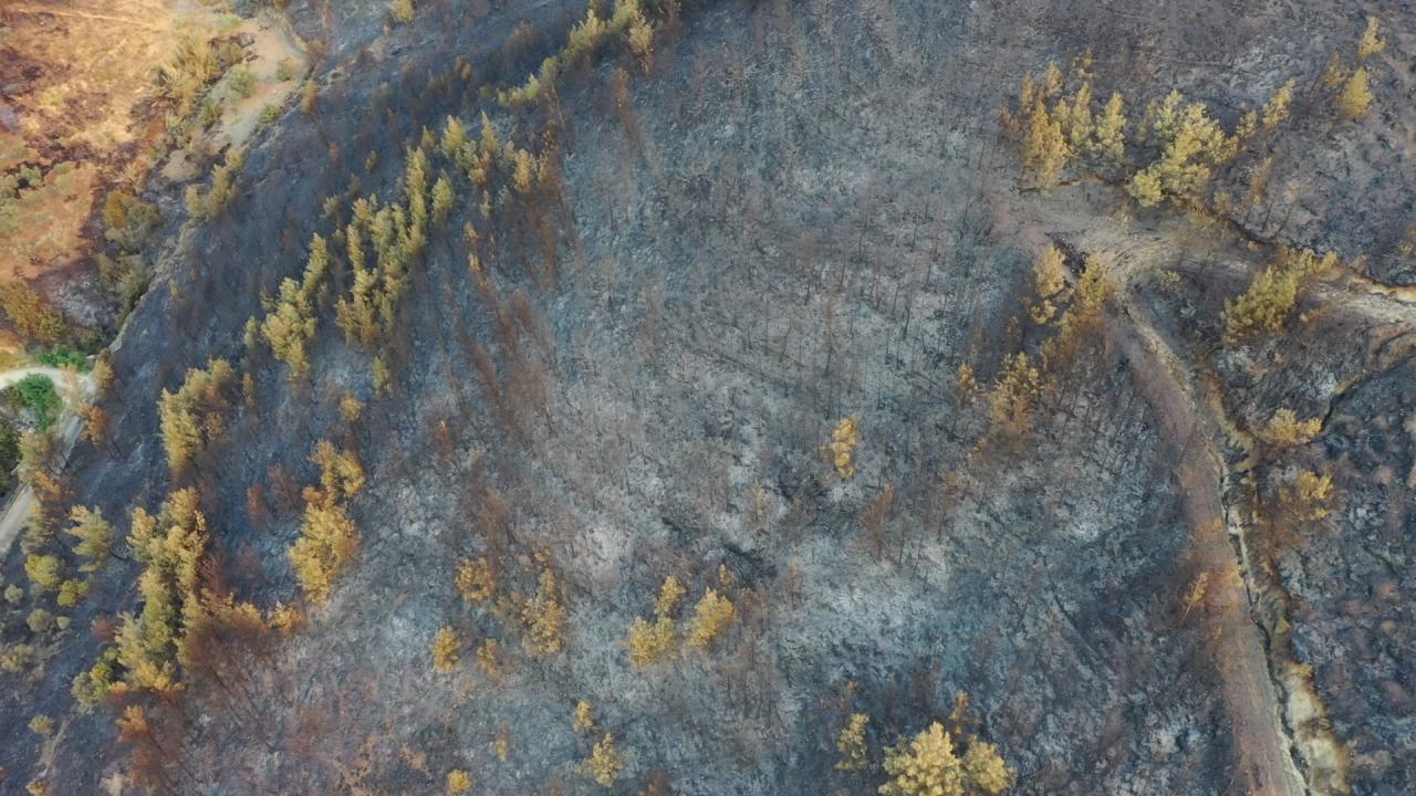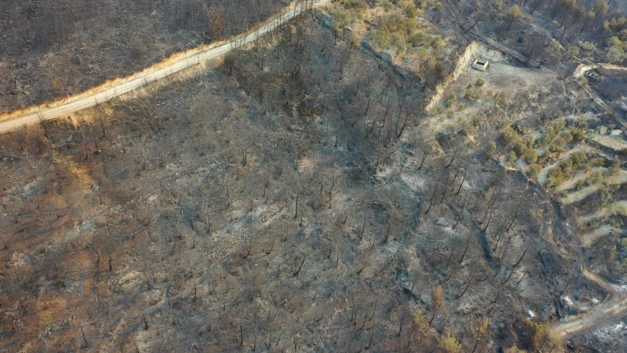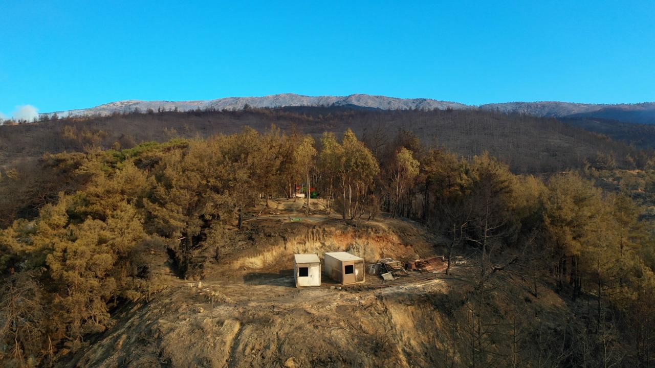 Yangının etkili olduğu 3 mahallede zarar gören alanlar dronla görüntülendi. Görüntülerde, yanan alanların yerleşim yerlerine yakınlığı ve alandaki birçok ağacın küle dönmesi yer alıyor.