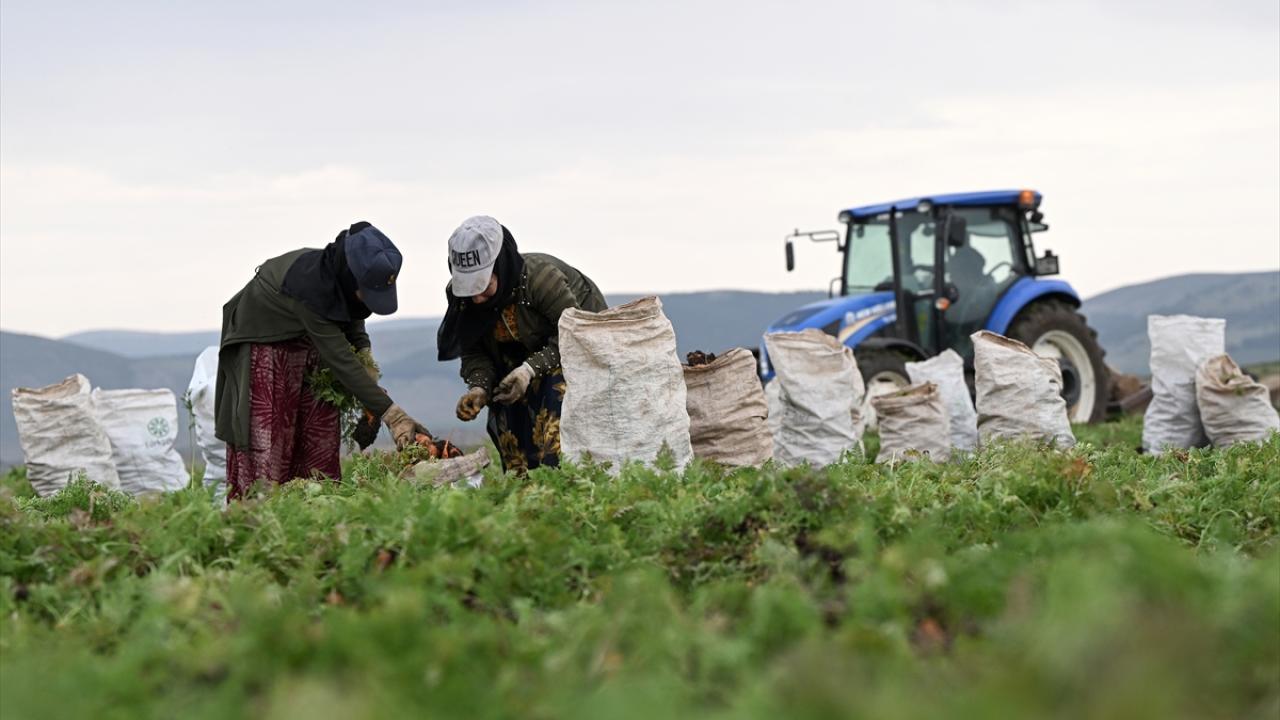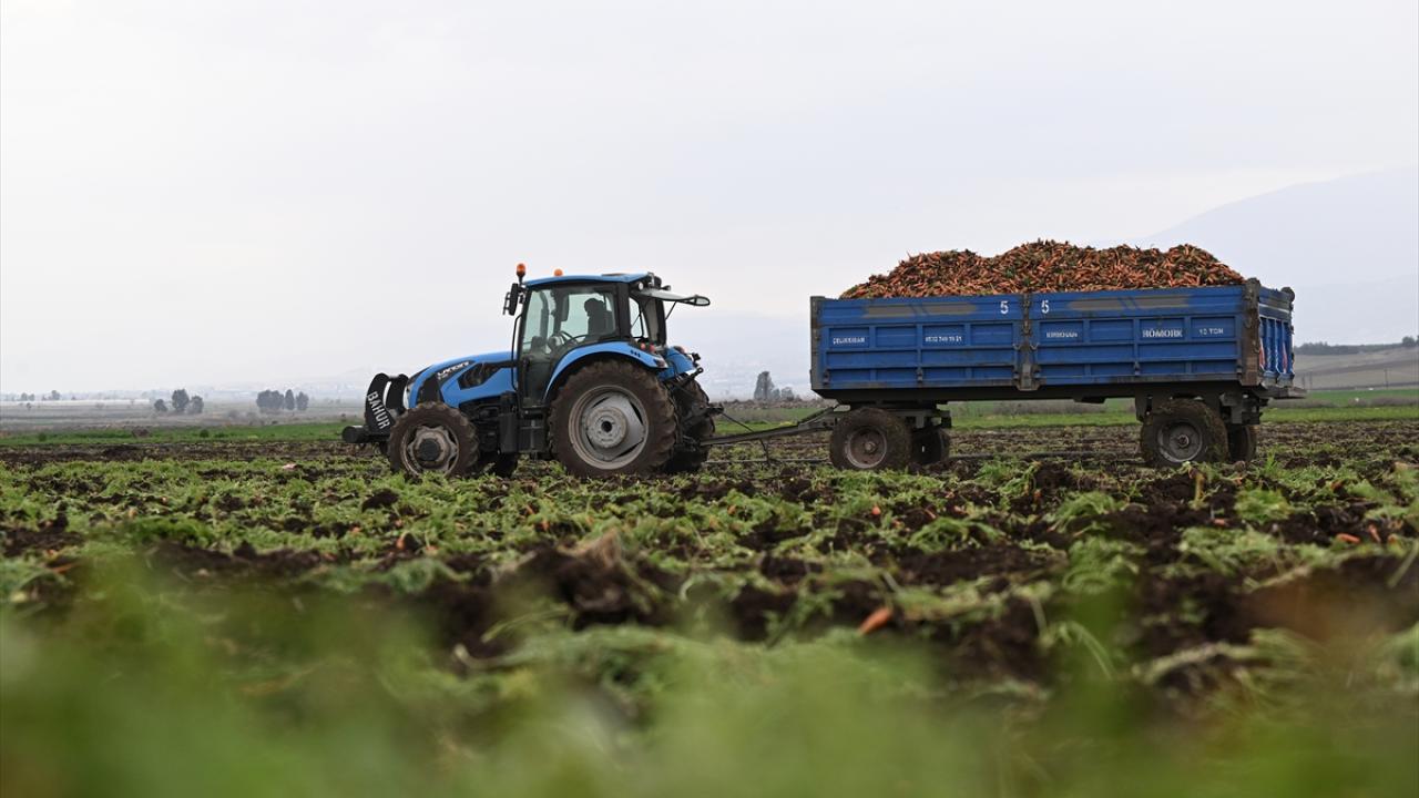 Traktörlerin arkasına takılan makineyle sökülen havuçlar, elle topraktan çıkarılıp kasalara yerleştiriyor. Tarlalarda işçiler tüm gün çalışıyor.