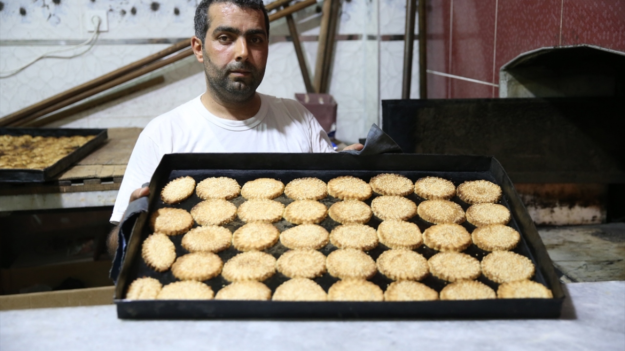 Hatay'ın Reyhanlı ve Hassa ilçelerinde kadınlar, geleneksel bayram lezzetlerinden kömbe kurabiyesini imece usulü hazırlıyor.