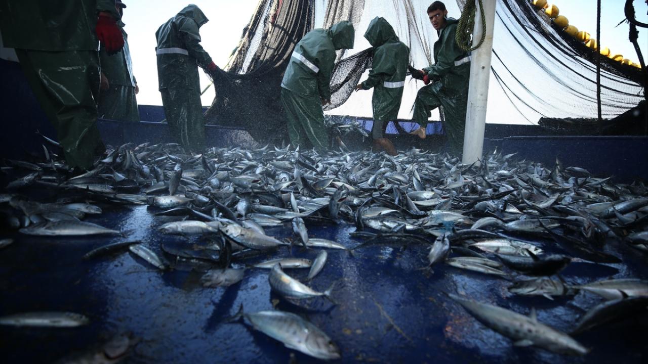 Radardan tespit edilen balıklar, geniş bir alana atılan ağla çevrilerek, teknedeki tayfalar tarafından hummalı bir çalışma sonucunda güverteye alınıyor.