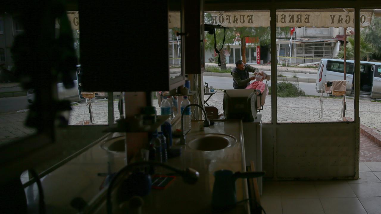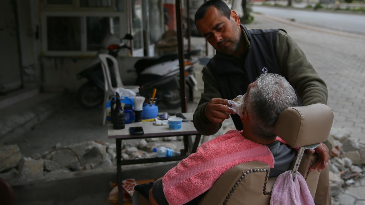 Depremlerin büyük yıkıma yol açtığı Hatay'ın Defne ilçesinde, berber Olcay Duman, müşterilerini iş yerinin önünde tıraş etmeye başladı.