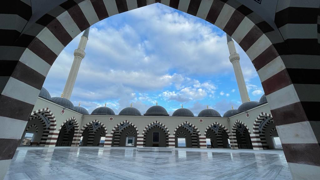 22 kubbe ile kare formunda tasarlanan avlu kısmına 3 farklı yönden açılan kapılar ile ulaşılan camide, 2 bin 772 metrekare alana sahip iç avlu bulunuyor.