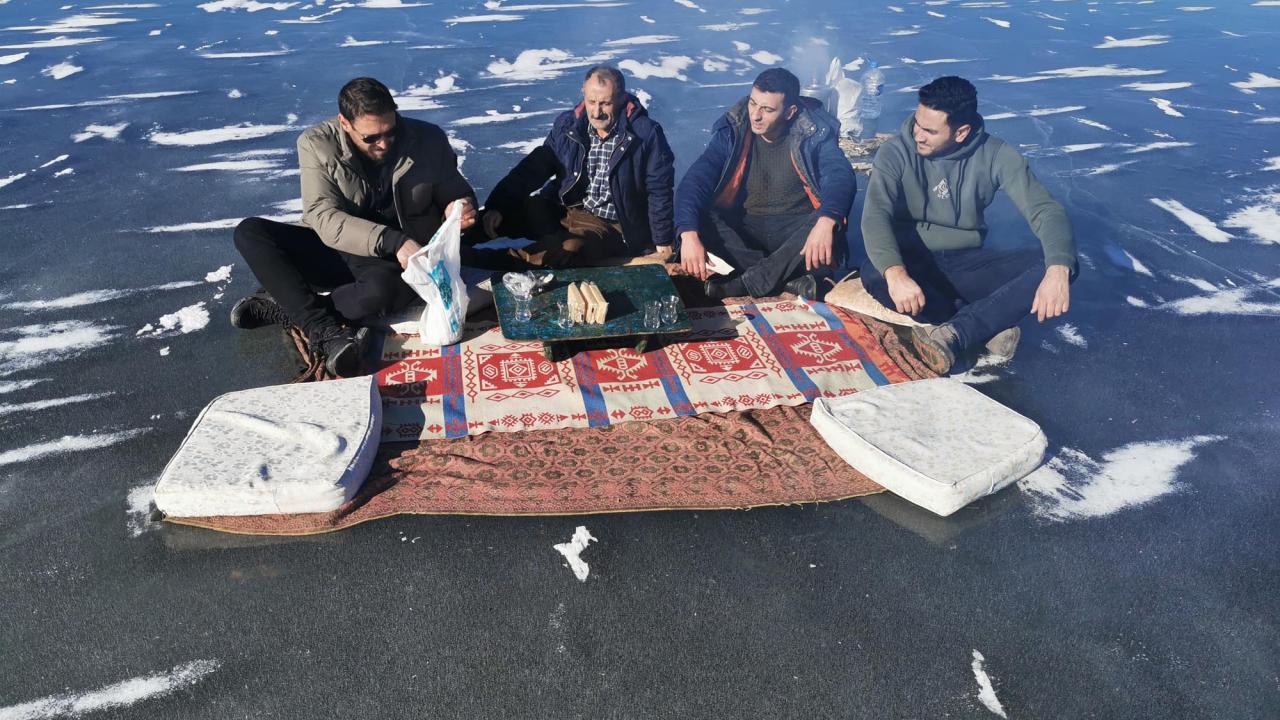 Bu arada soğuk havaya rağmen güneşli bir gün yaşanan göle gelen vatandaşlar, buz yüzeyinde kilim serip oturarak semaver yaktı.