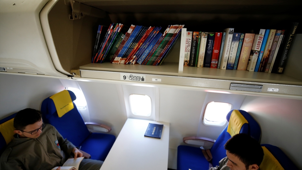 Öğrenciler uçak içerisinde oluşturulan kütüphanede ders aralarında kitap okuyor.