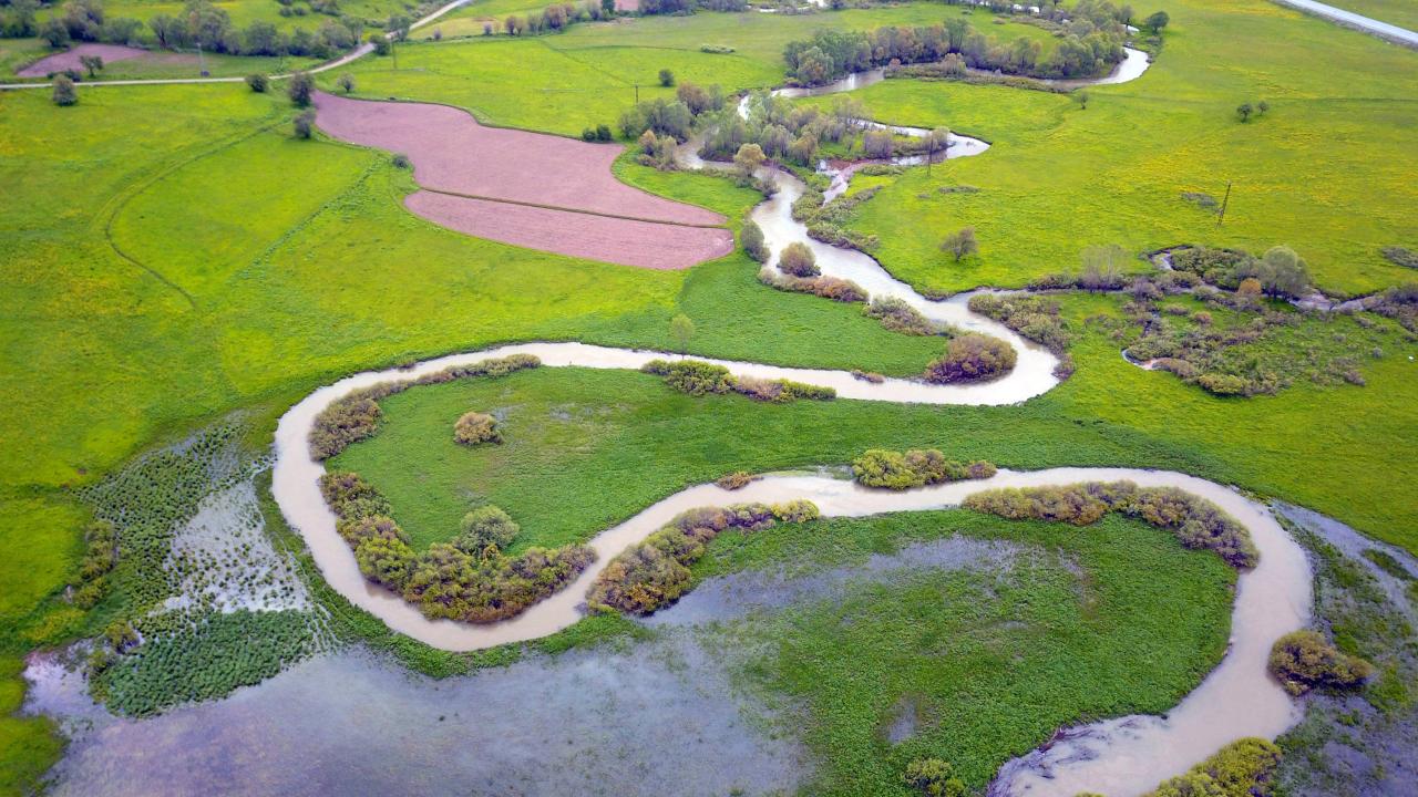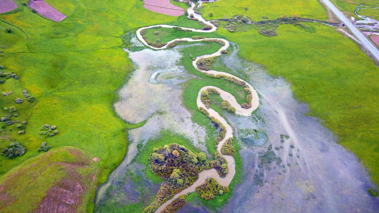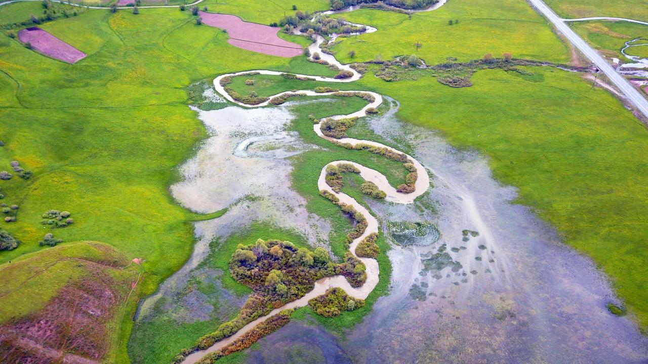 Yağışlarla birlikte debisi yükselen mendereslerin kilometrelerce uzanan kıvrımlı yapısının oluşturduğu manzara havadan görüntülendi.