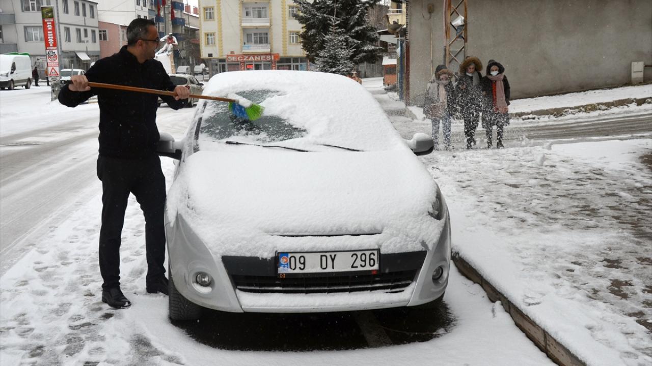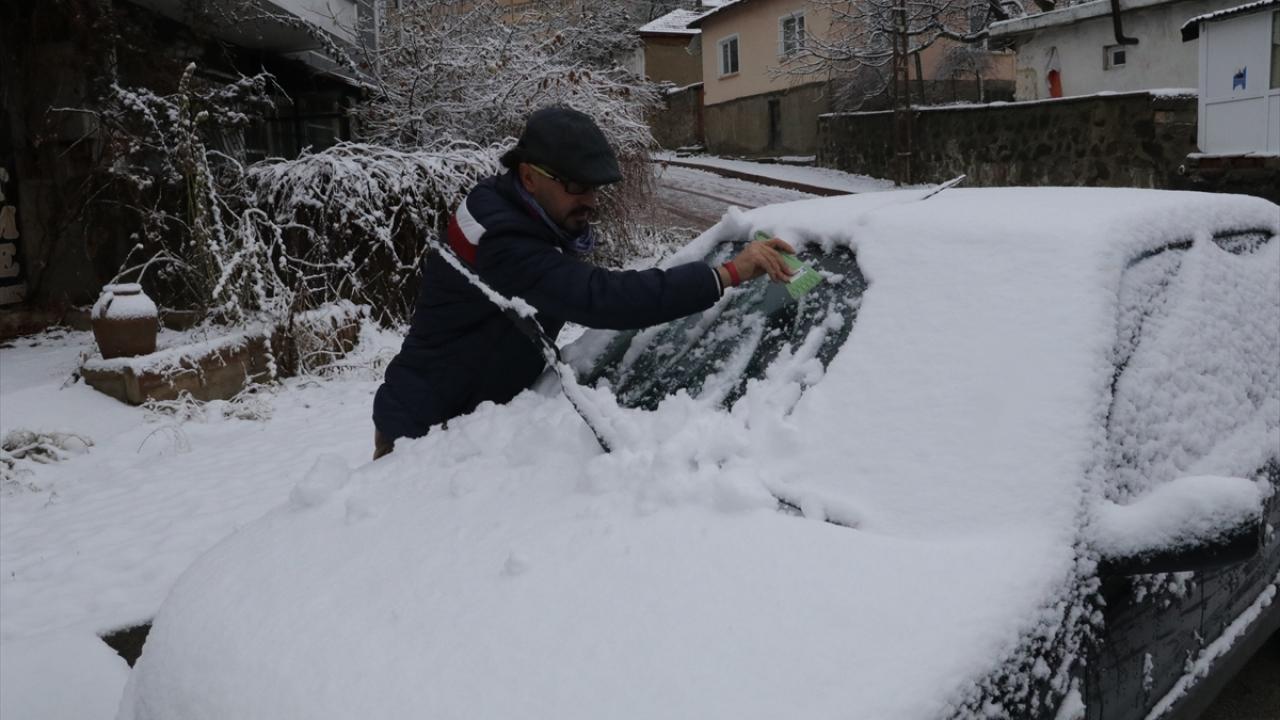 Cadde ve sokakların karla kaplandığı kentte sabah iş yerine giden vatandaşlar, araçlarının üzerindeki karı temizledi.