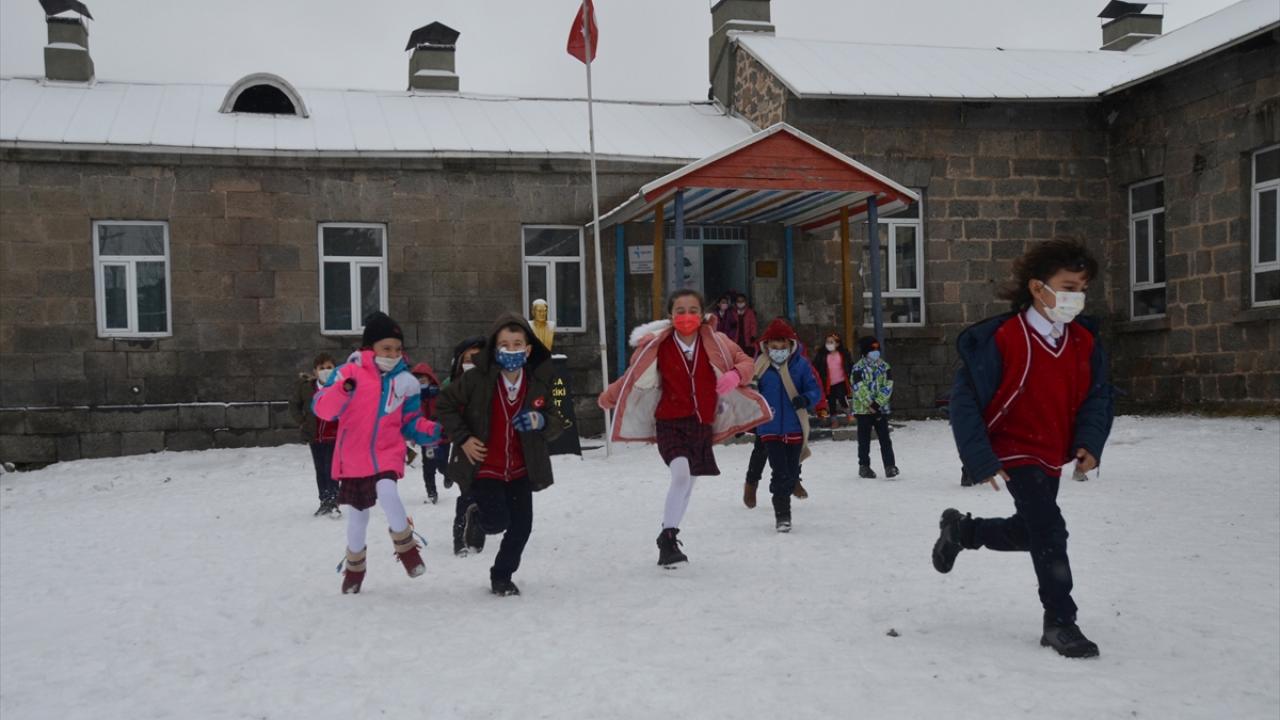 Öğrenciler kar yağışına sevindi.