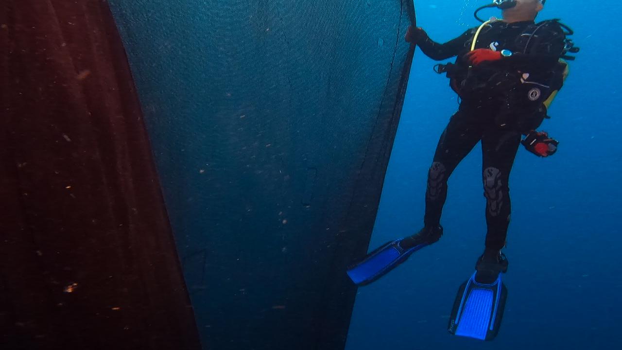 Üstü tamamen ağ ile kaplı olan yaklaşık 50 metre uzunluğundaki 9 Eylül vapurunu temizlemek için ekipler 25 metreye daldı.