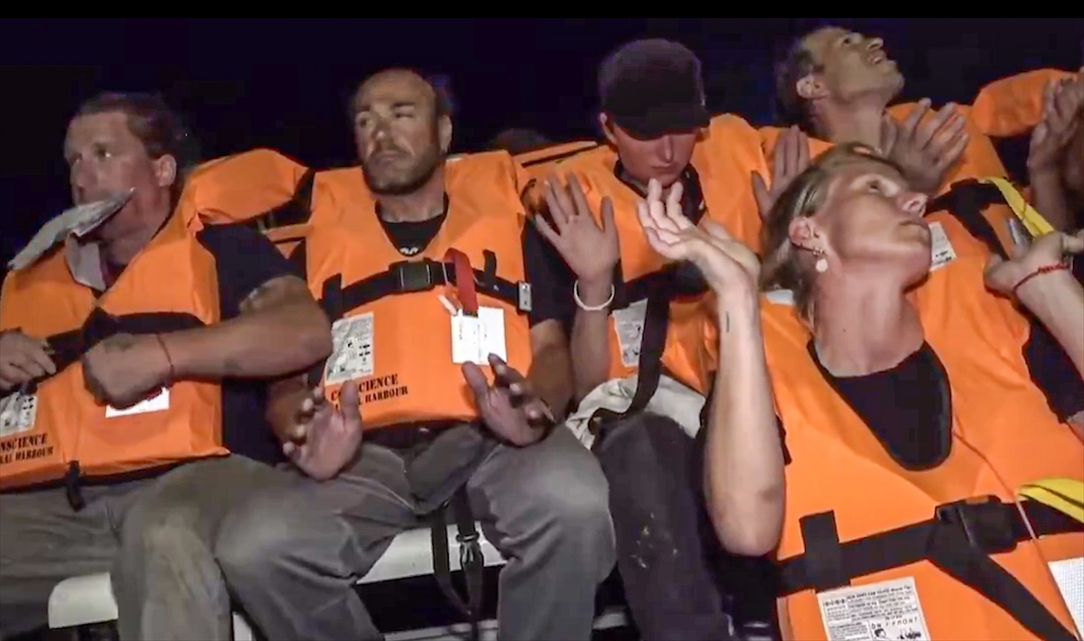 Filonun açıklamasında, "Vicdan gemisi şu anda bir İsrail askeri helikopteri tarafından saldırı altında. Gemide 93 gazeteci, doktor ve aktivist bulunuyor." ifadesi kullanıldı.