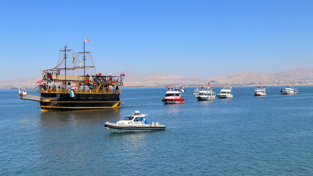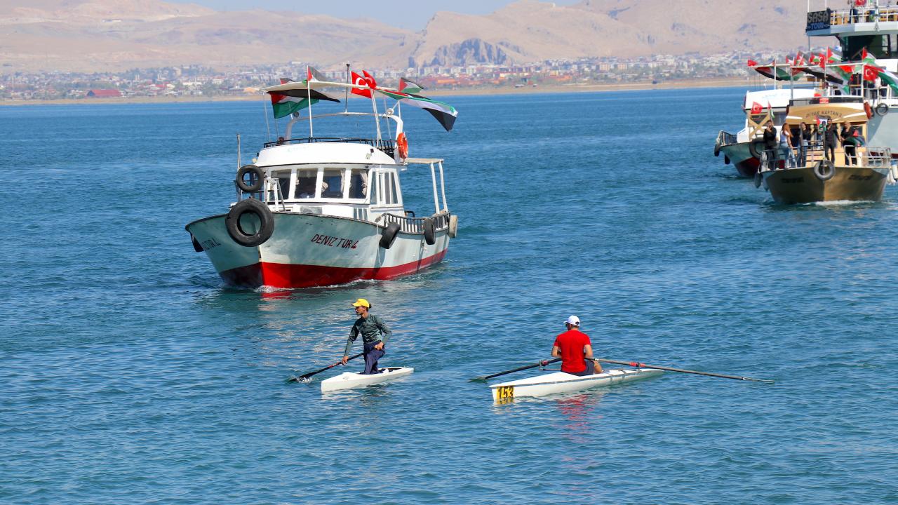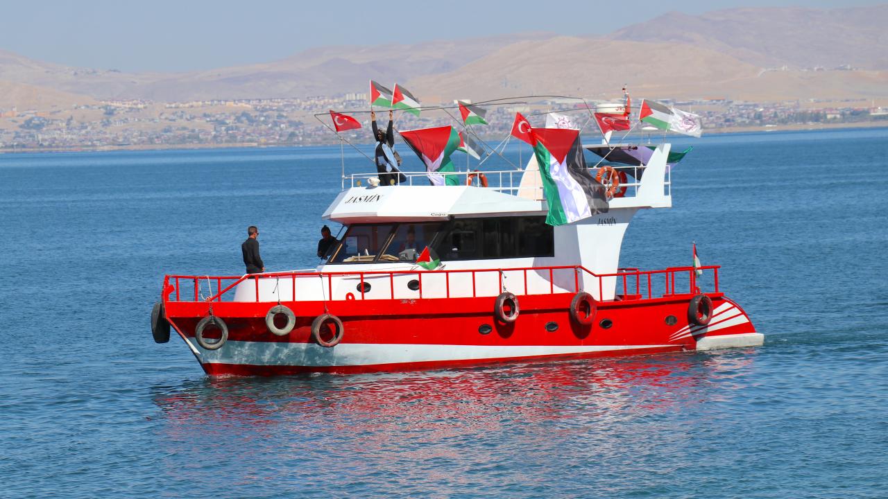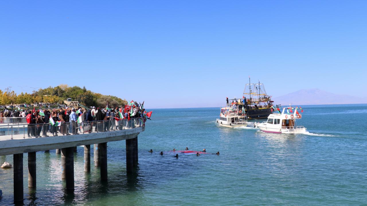 Van'da, soykırımcı İsrail ablukasını kırmak ve insani yardım ulaştırmak amacıyla Gazze'ye giden Küresel Sumud Filosu'na destek amacıyla bir araya gelenler, tekne ve kanolarla Van Gölü'ne açıldı, dalgıçlar da göle dalarak Türk ve Filistin bayrakları açtı.