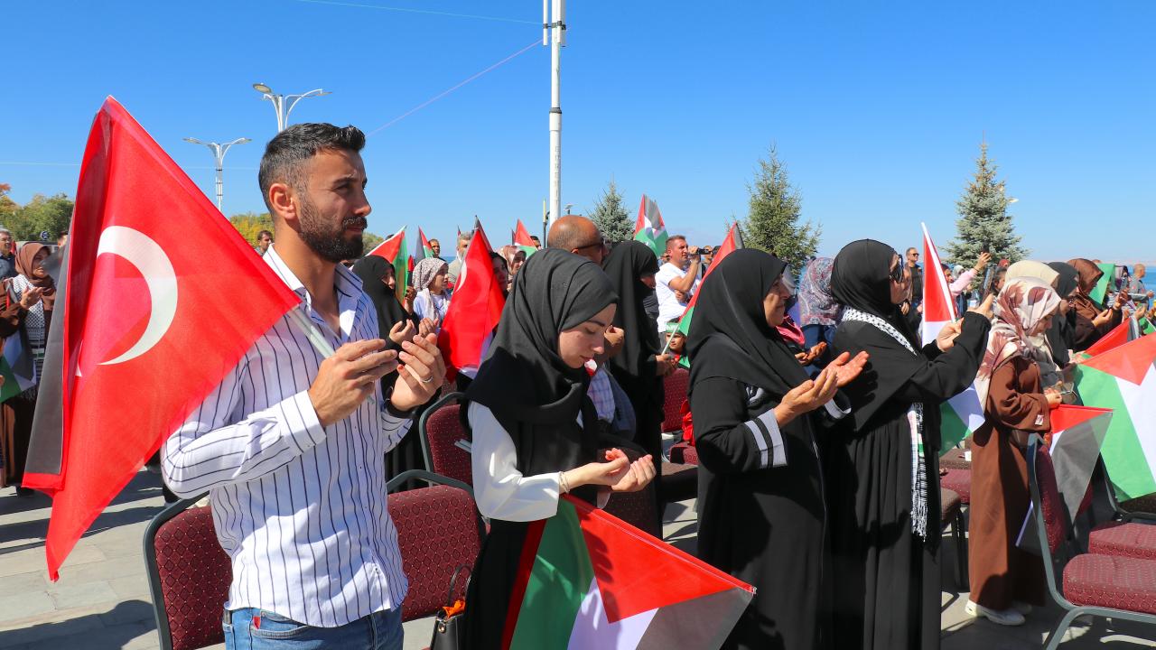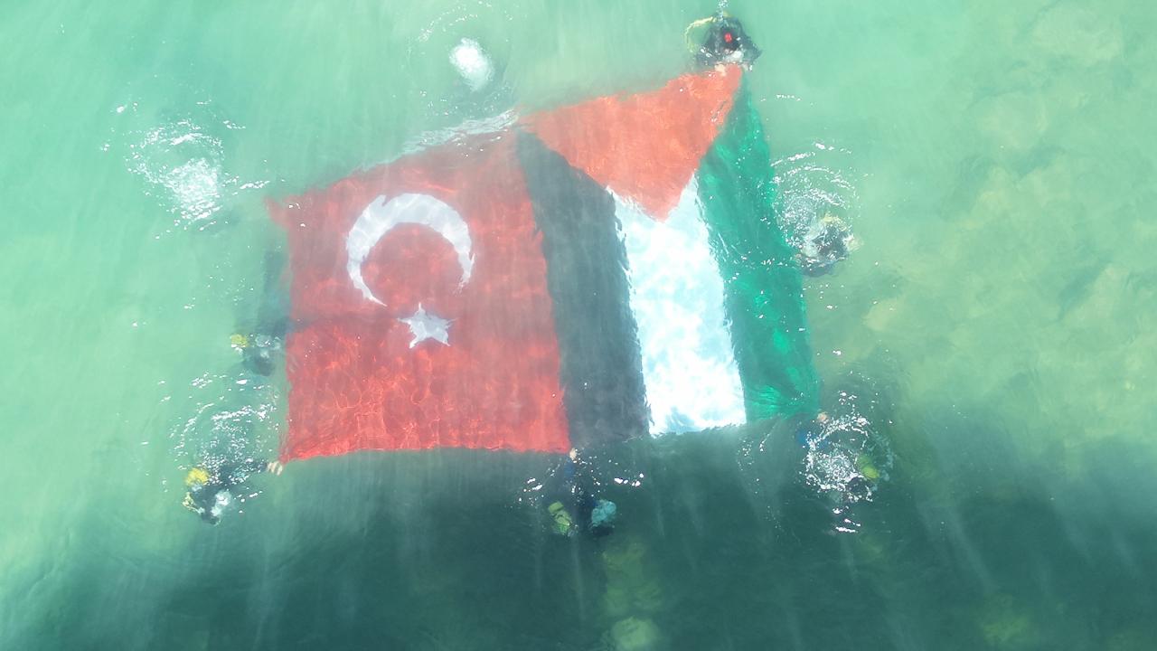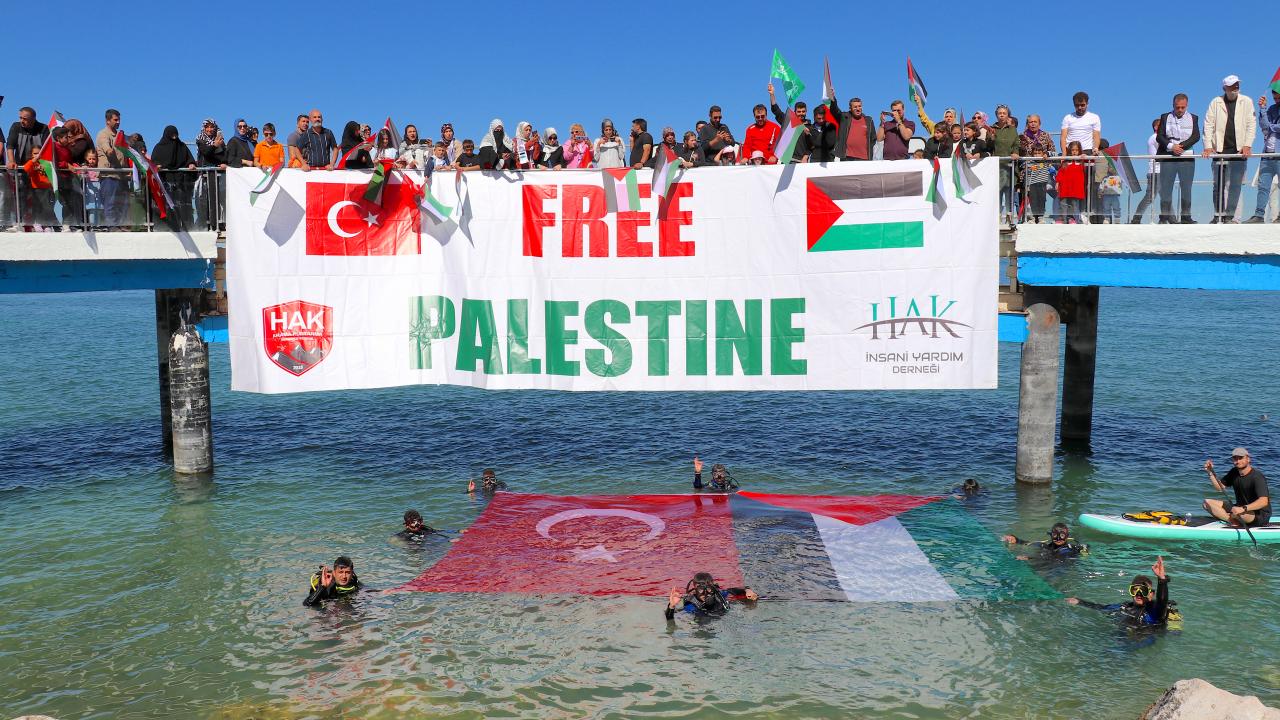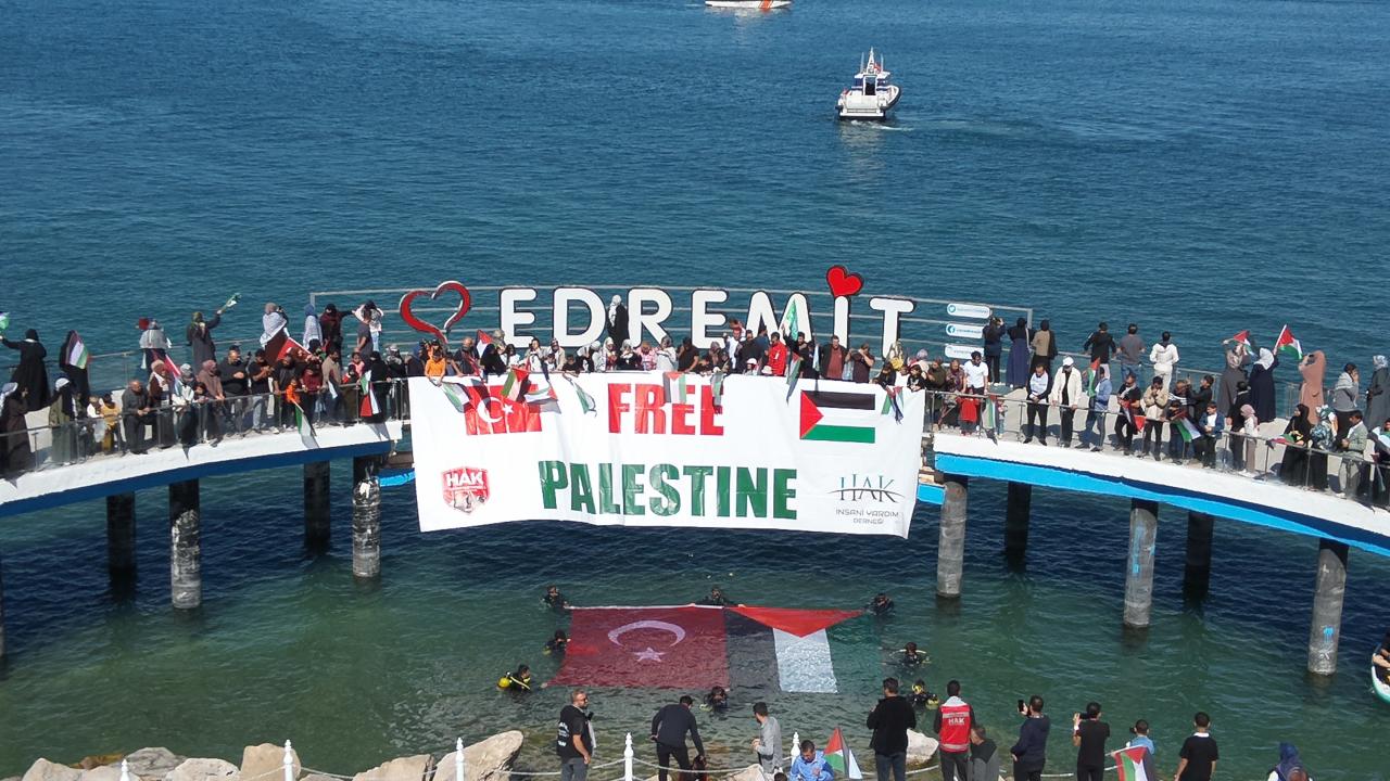 Van'da, soykırımcı İsrail ablukasını kırmak ve insani yardım ulaştırmak amacıyla Gazze'ye giden Küresel Sumud Filosu'na destek amacıyla bir araya gelenler, tekne ve kanolarla Van Gölü'ne açıldı, dalgıçlar da göle dalarak Türk ve Filistin bayrakları açtı.