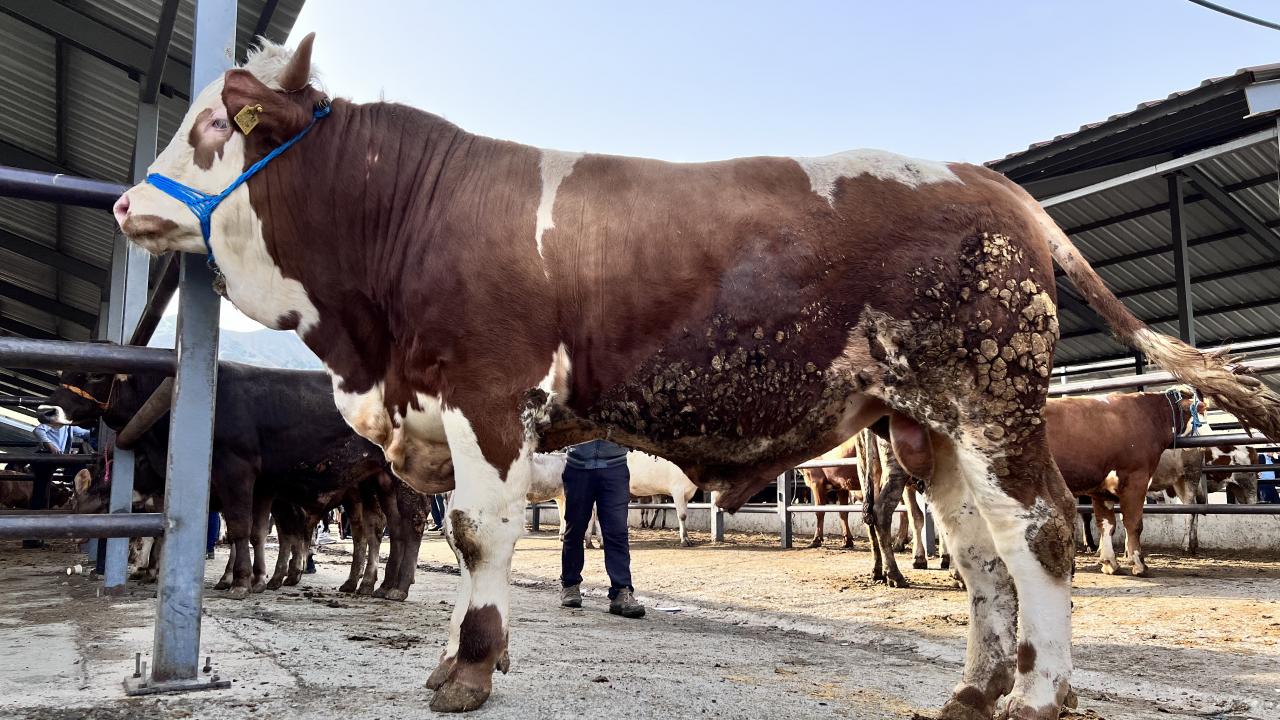 Küçükbaş kurbanlıkların henüz getirilmediği hayvan pazarında, yaklaşık 1 ton ağırlığındaki Polat isimli boğa, pazarın gözdesi oldu.