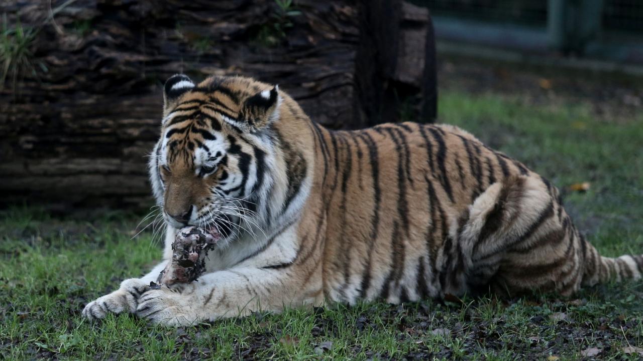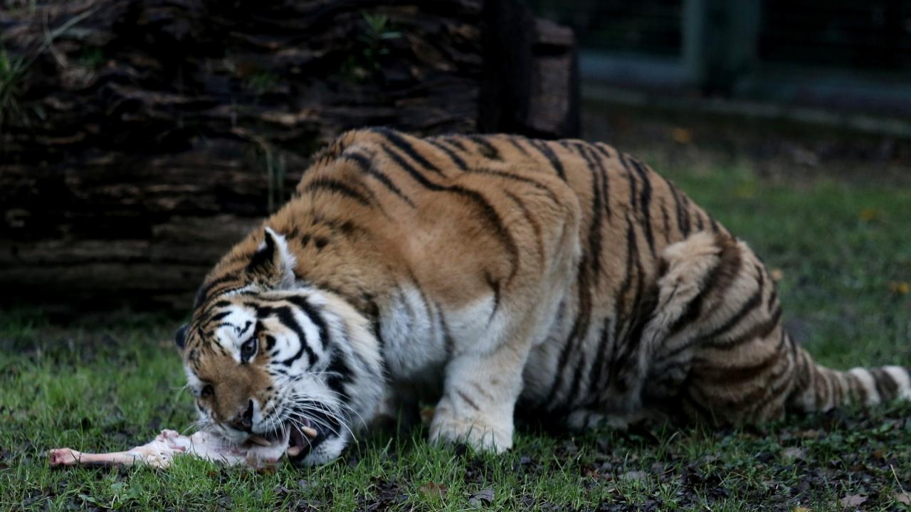 Direğin üzerine bakıcısı tarafından asılan etin kokusunu alan amur kaplanı, gözüne kestirdiği eti tek hamlede kaptı.