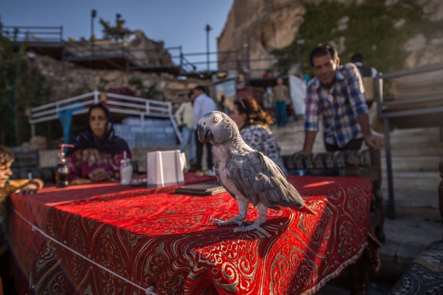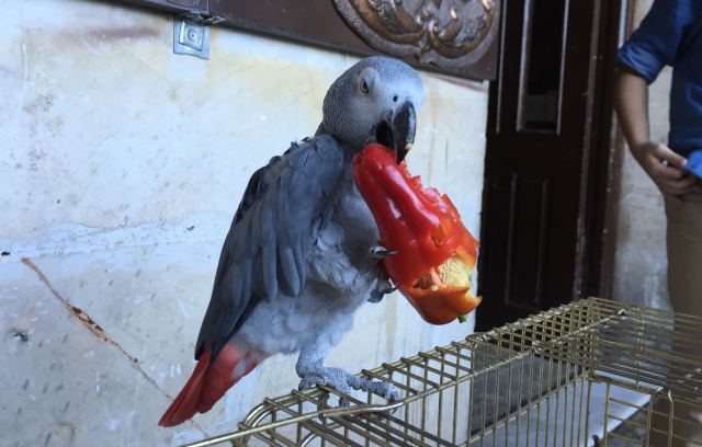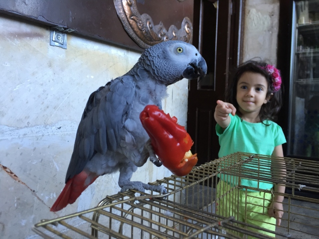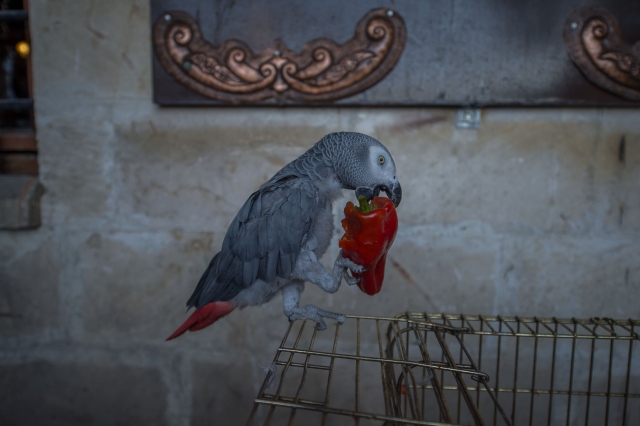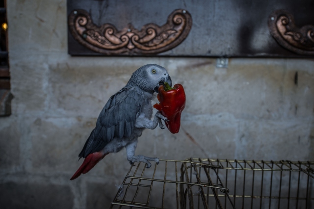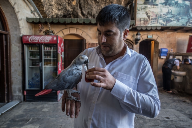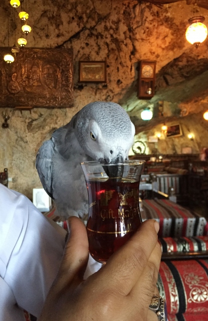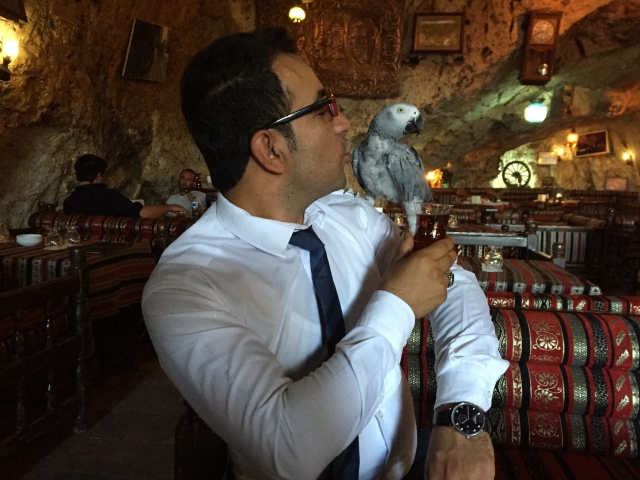 Şanlıurfa'da kafe-restoran olarak hizmet veren bir mağarada çalışanların baktığı Jako türü "Paşa" adlı papağanın isotla beslenmesi müşterilerin de ilgisini çekiyor.