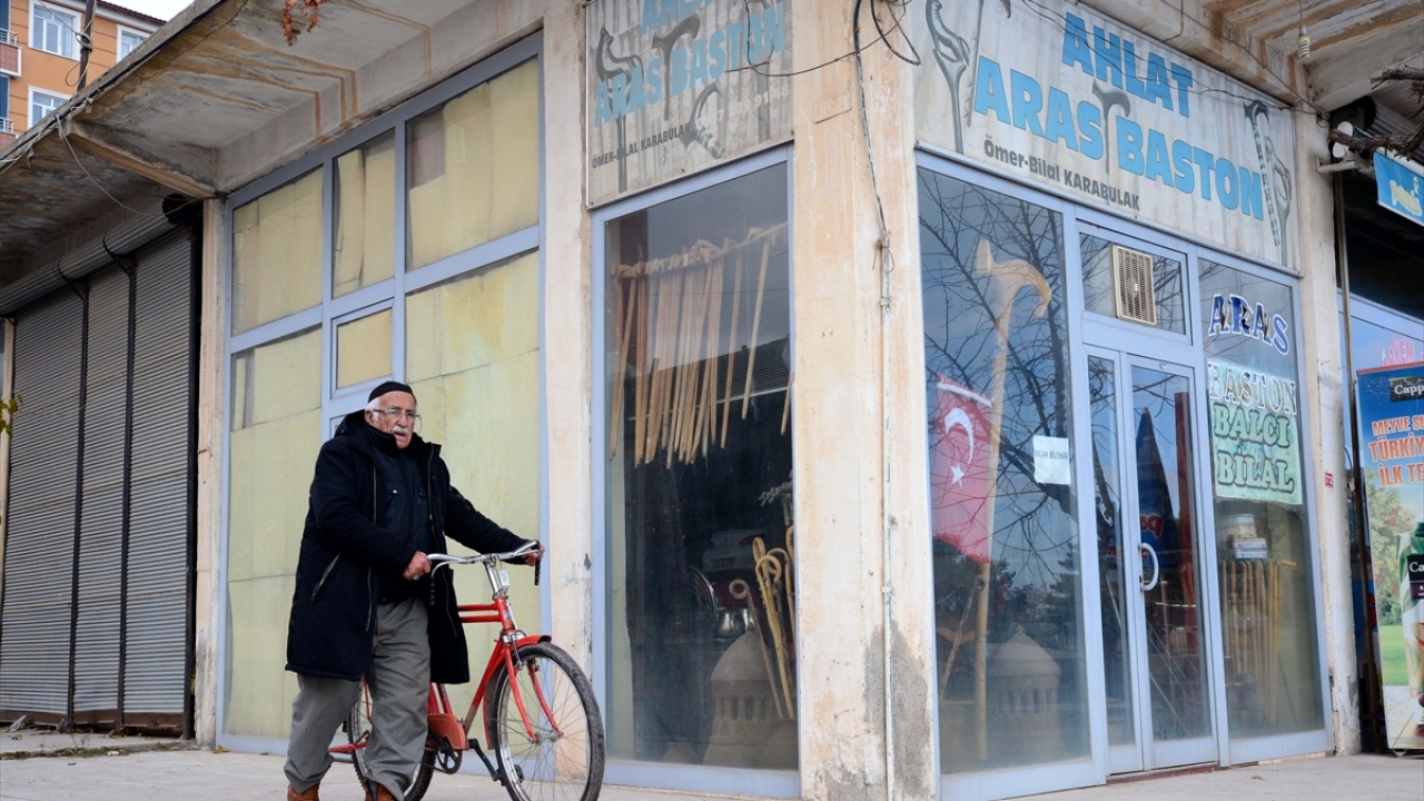 Bitlis'in Ahlat ilçesinde 75 yaşındaki Ömer Karabulak, bisikletiyle her gün 10 kilometre katederek gittiği atölyesinde 35 yıldır ceviz ağaçlarından baston üretiyor.