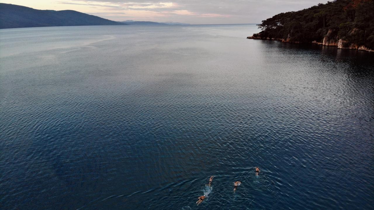 Muğla`da yüzlerce kuş türü, çok sayıda balık ve bitki türüne ev sahipliği yapan doğal akvaryum görünümündeki Kadın Azmağı Deresi ile Gökova Körfezi`nin eşsiz manzarasını sunan Akyaka`da bir araya gelen 10 kişi, soğuk suya aldırış etmeden yüzüyor.