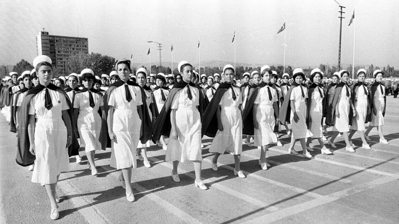 Hemşire okulu öğrencileri, 29 Ekim Cumhuriyet Bayramı dolayısıyla 27 Ekim 1981`de Hipodromda yapılan geçit töreni provalarına katıldı. (Arşiv)