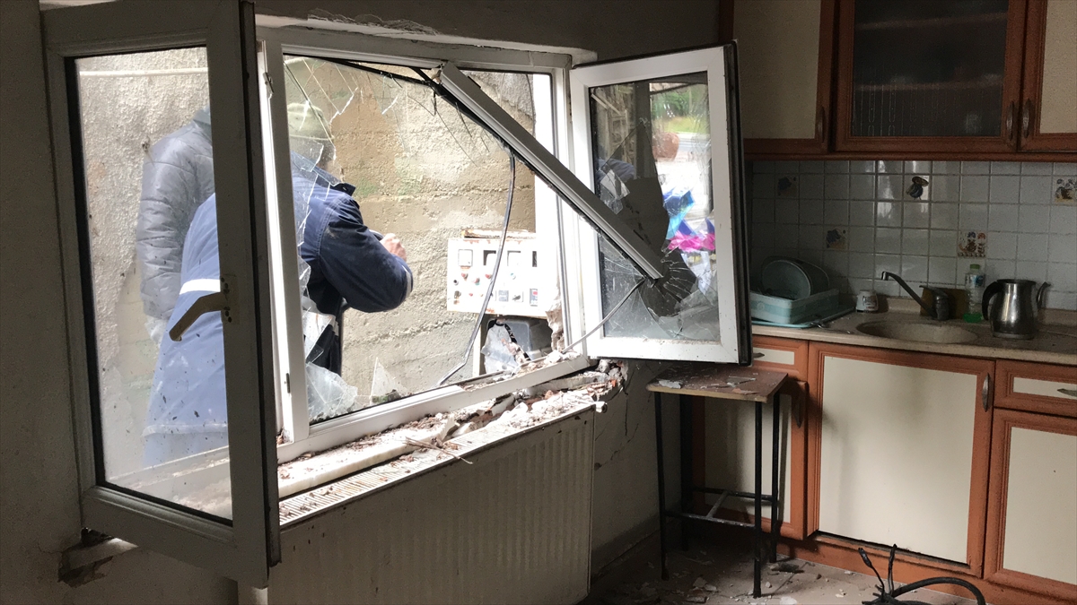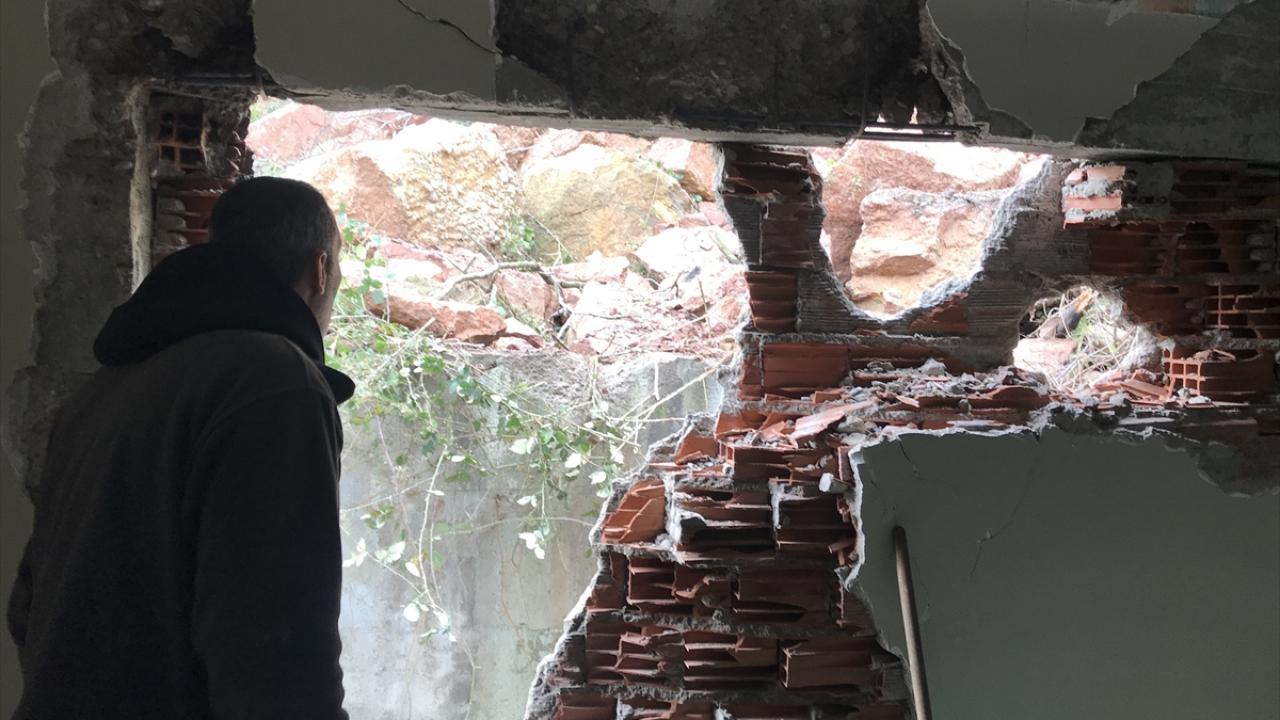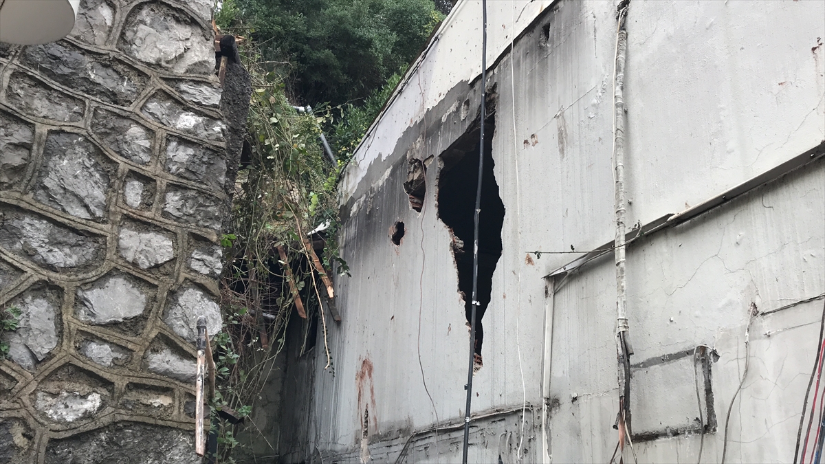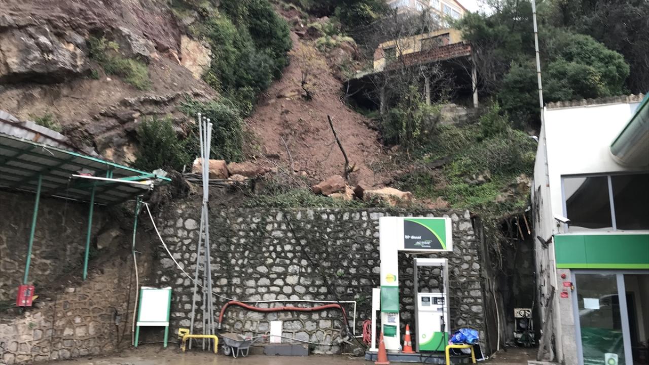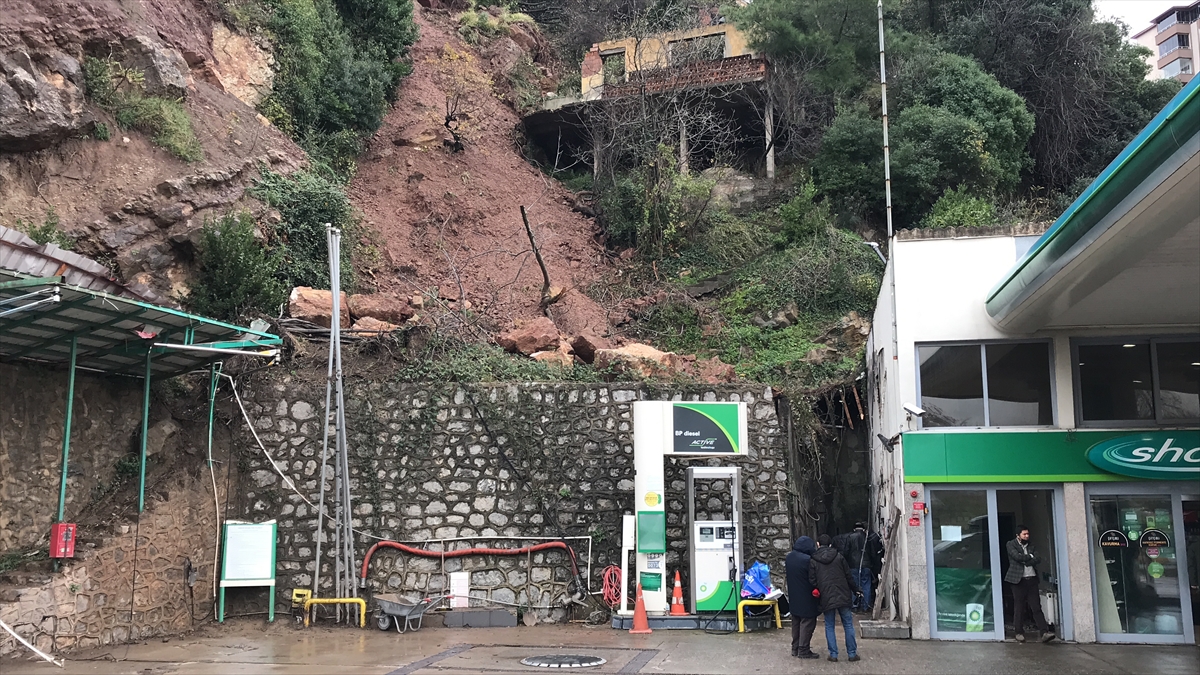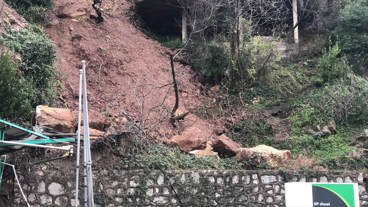 Heyelan nedeniyle kopan kaya parçaları, akaryakıt istasyonu binasının duvarını yıkarak hasara yol açtı.