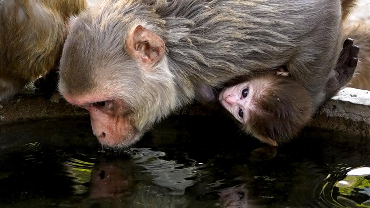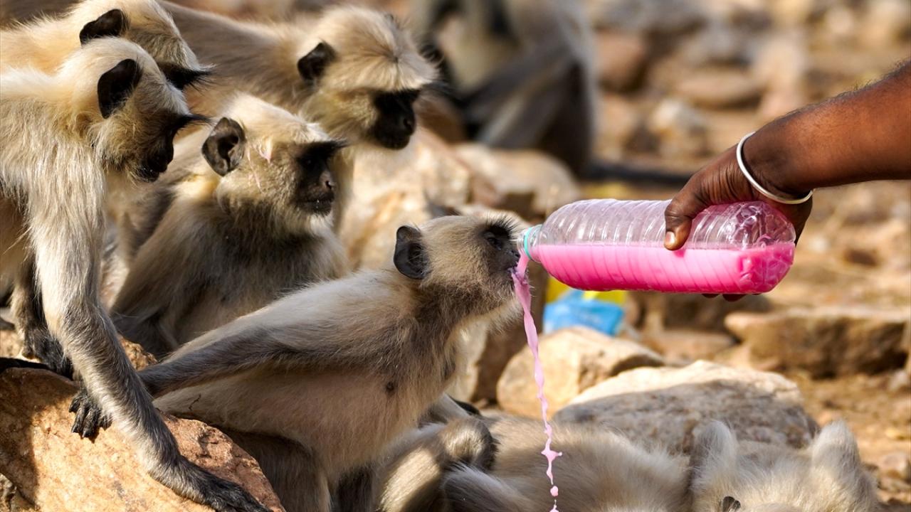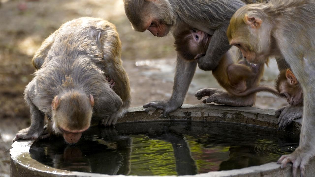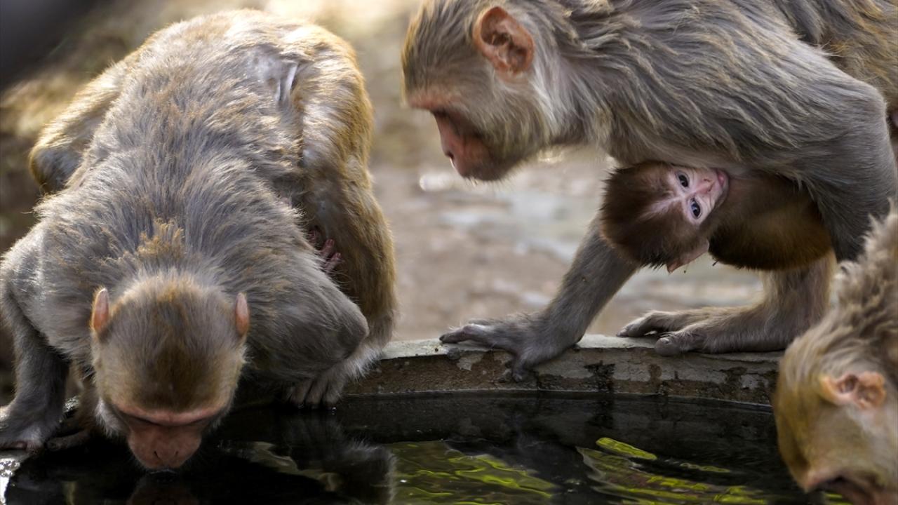 Hindistan'ın Rajasthan eyaletindeki Pushkar kentindeki Geyik (deer) parkında yaşayan makak maymunları, kentte etkili olan sıcak havadan korunmak ve kendilerini serinletmek için su kaynaklarına yöneliyor.