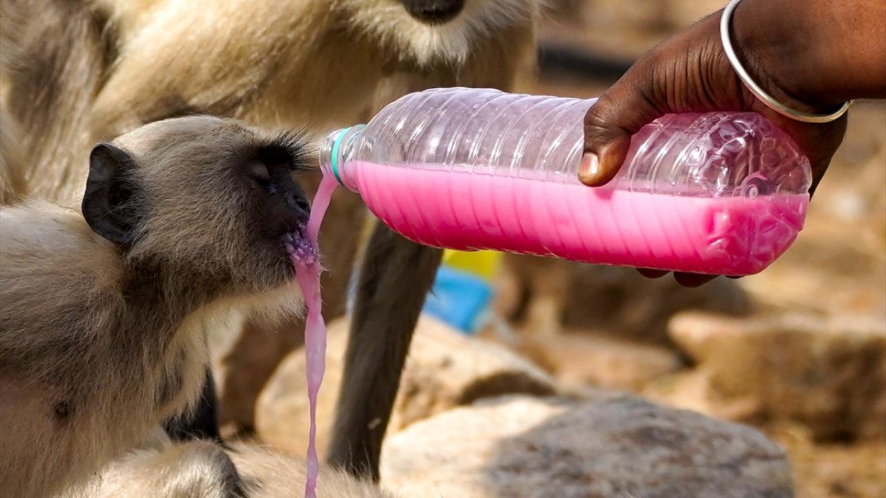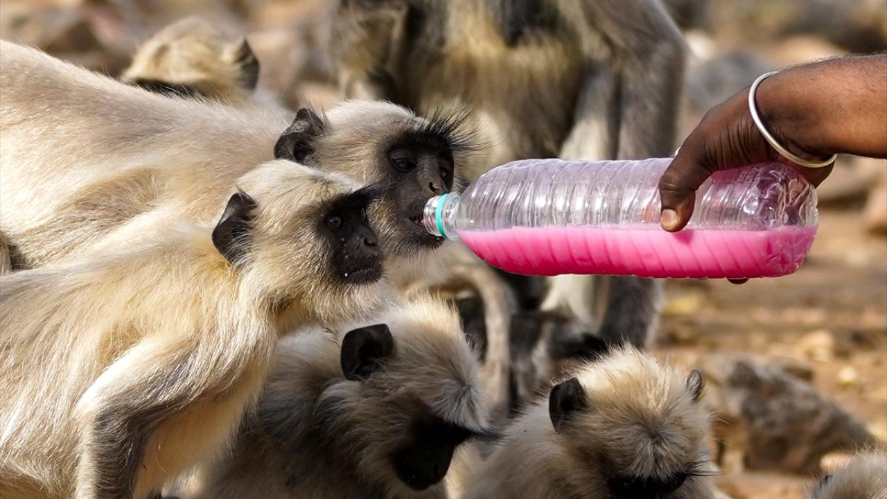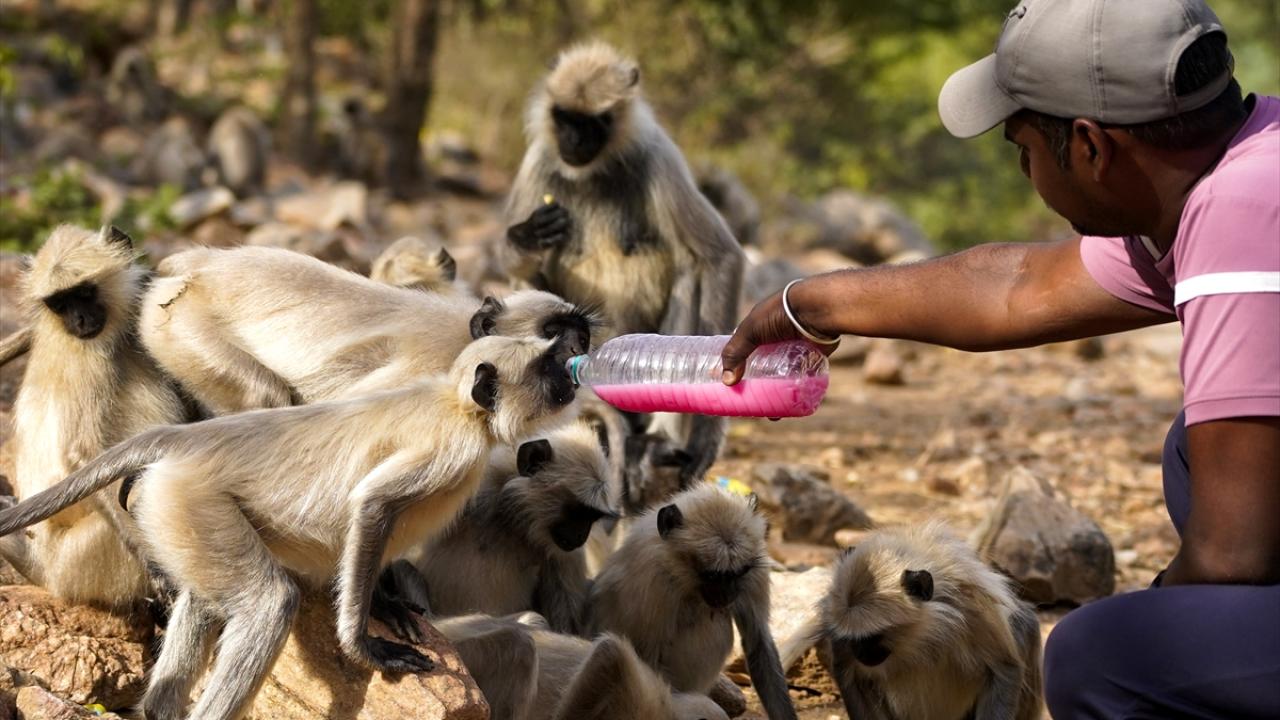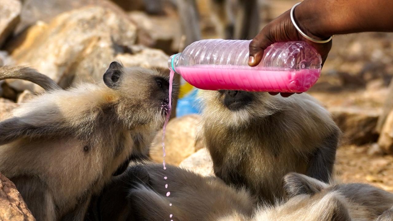 Hindistan'ın Rajasthan eyaletindeki Pushkar kentindeki Geyik (deer) parkında yaşayan makak maymunları, kentte etkili olan sıcak havadan korunmak ve kendilerini serinletmek için su kaynaklarına yöneliyor.