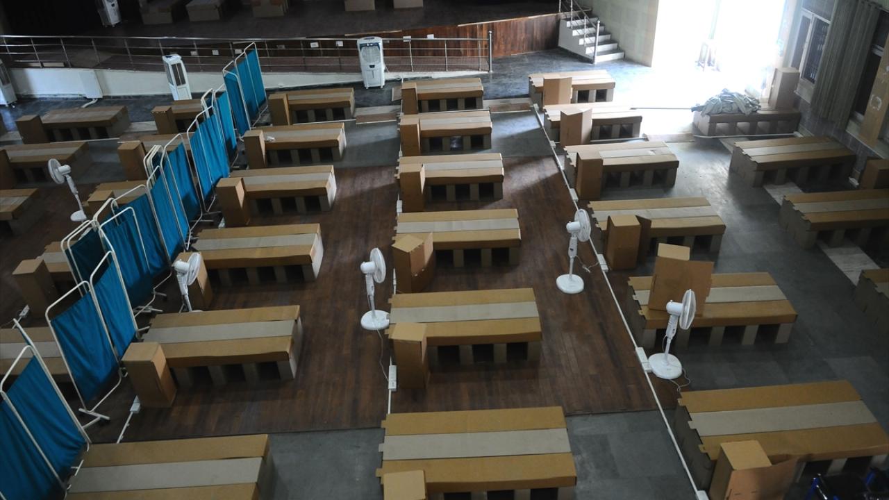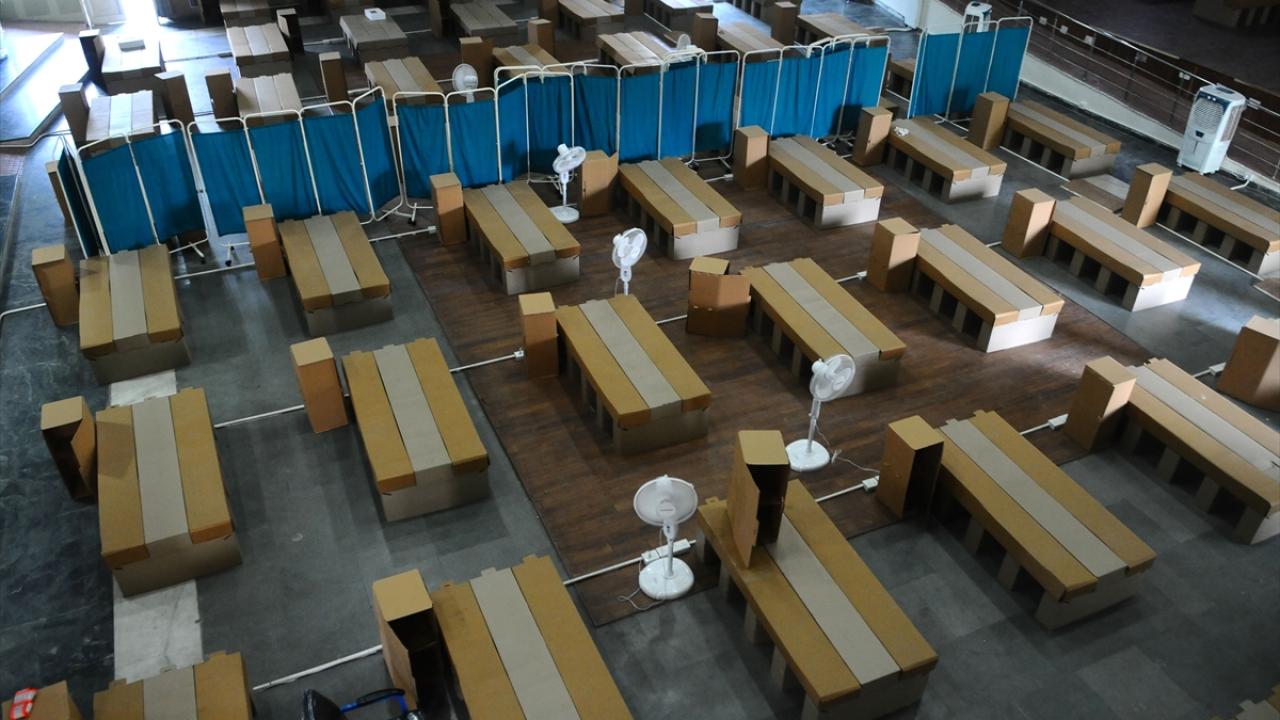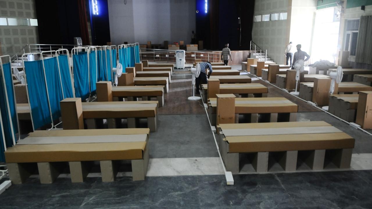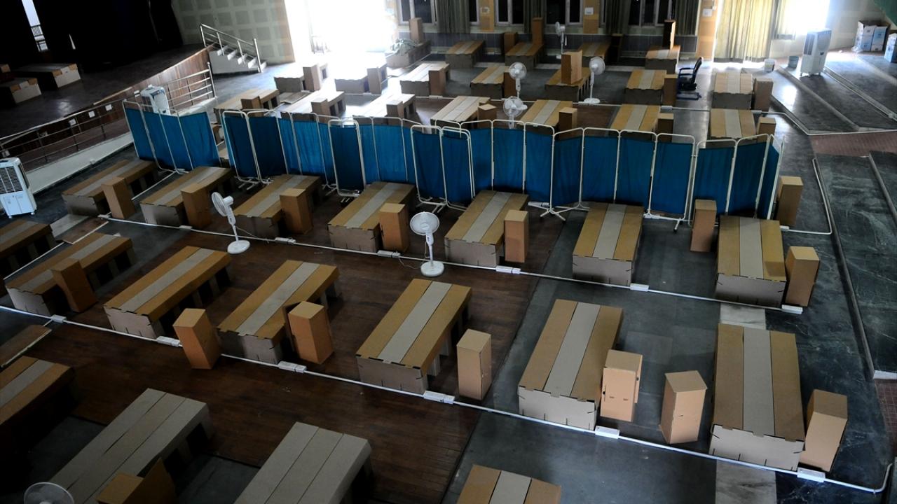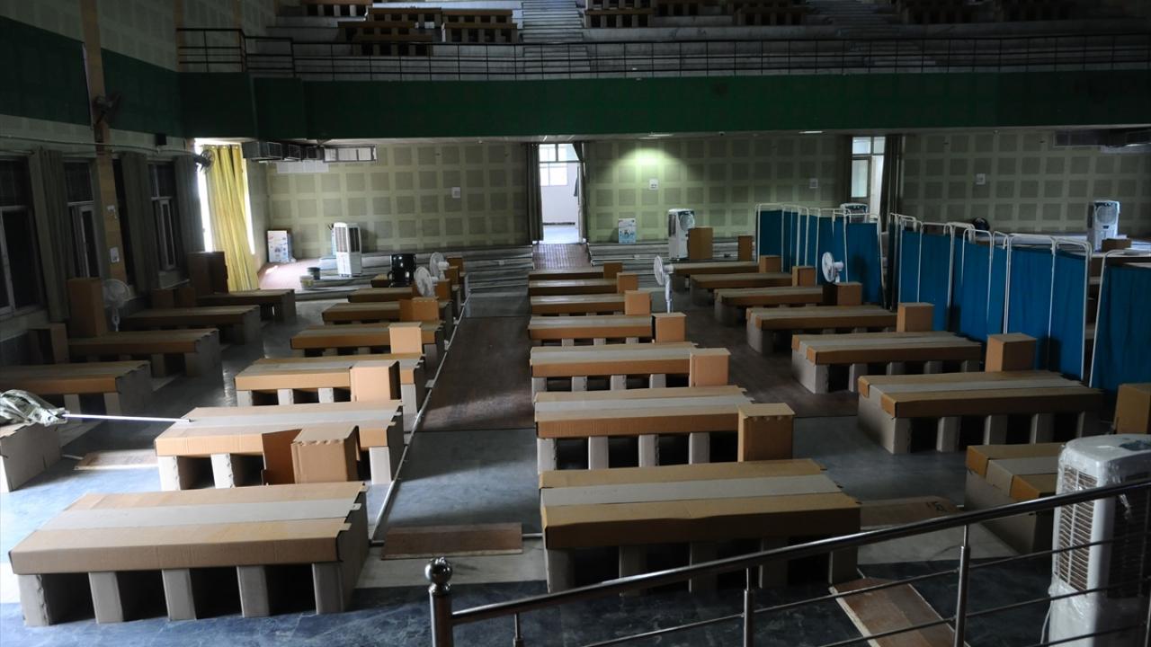 Hindistan'ın Haryana eyaletinin Gurugram şehrinde bulunan bir kız yurdu, koronavirüs bakım merkezine dönüştürüldü. Bakım merkezine karton yataklar kuruldu.