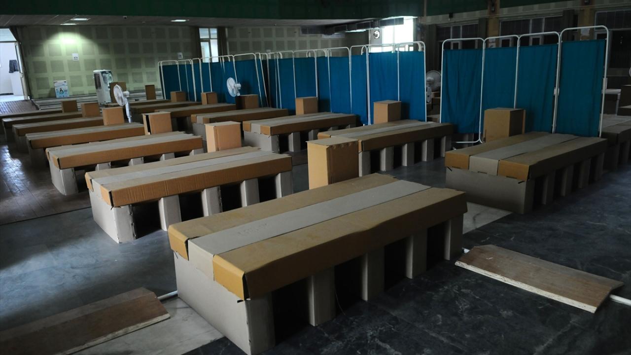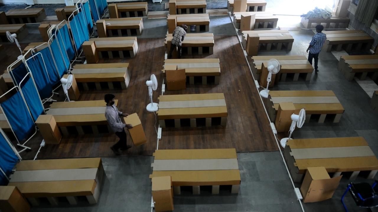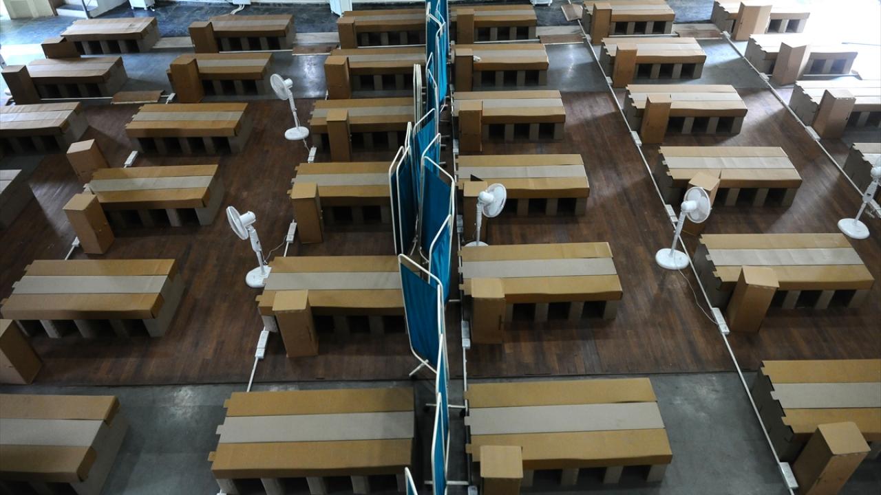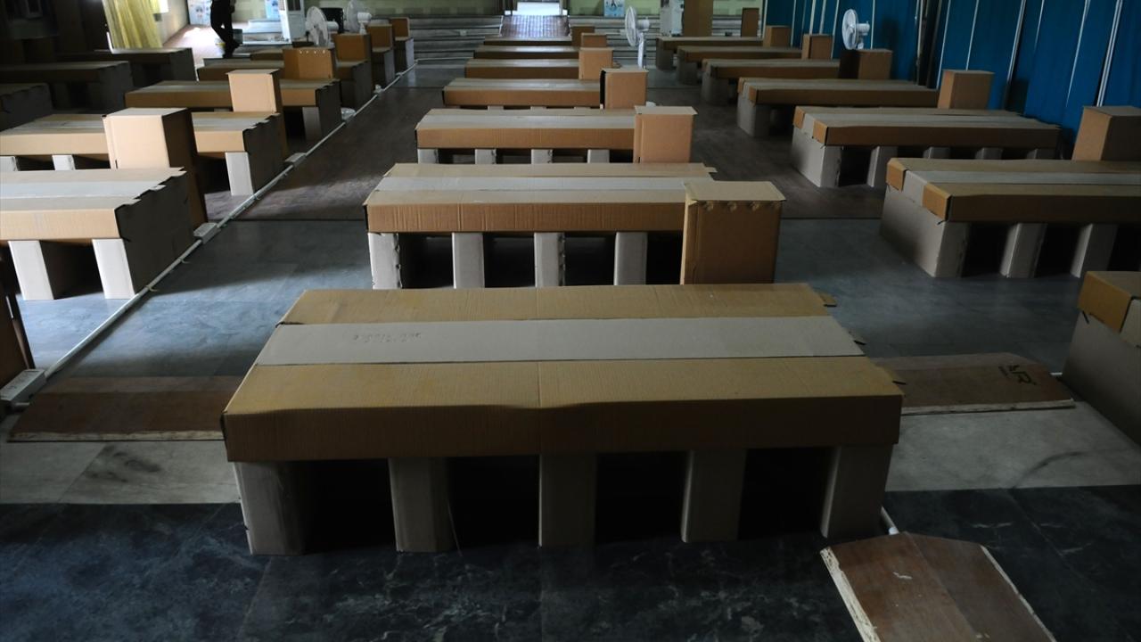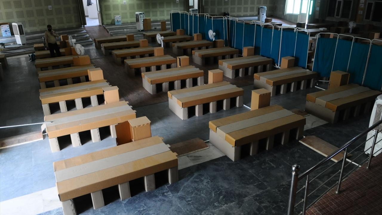 Hindistan'ın Haryana eyaletinin Gurugram şehrinde bulunan bir kız yurdu, koronavirüs bakım merkezine dönüştürüldü. Bakım merkezine karton yataklar kuruldu.