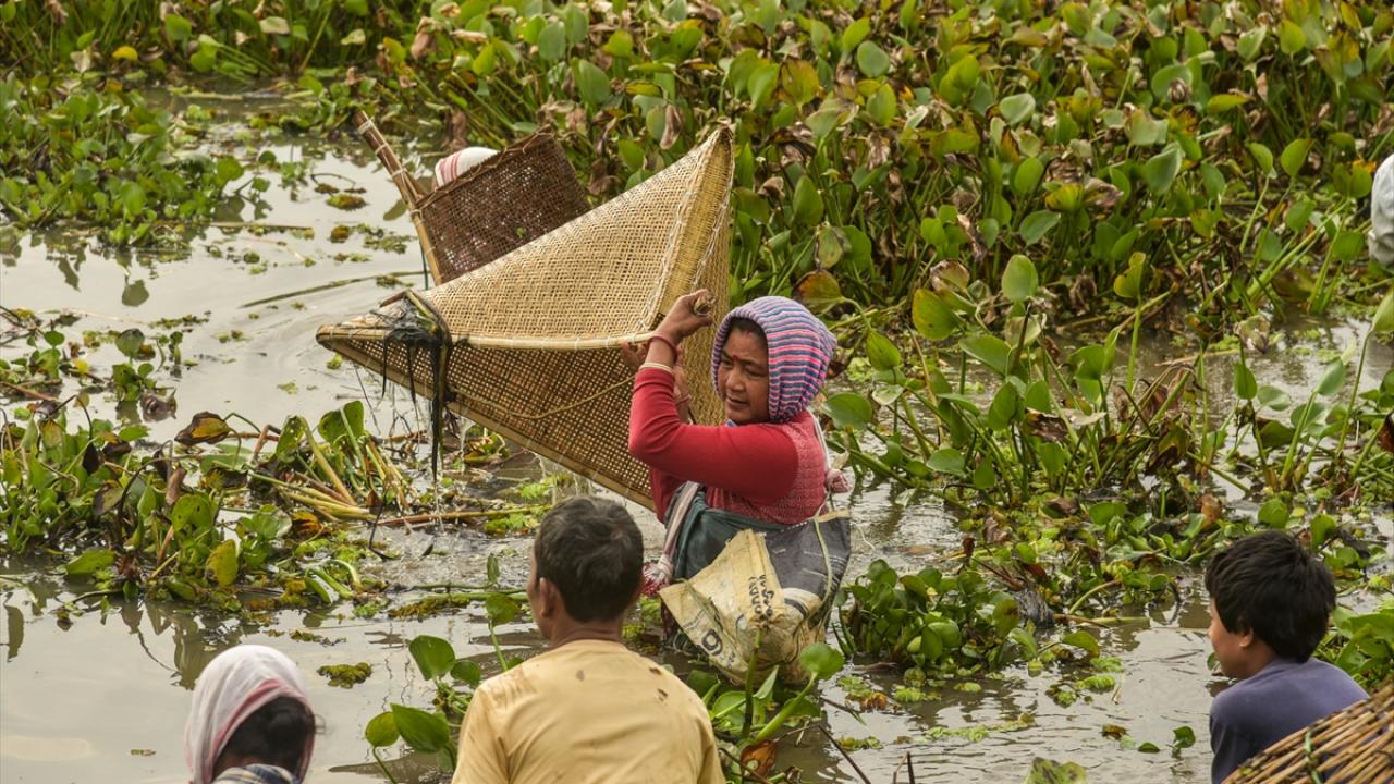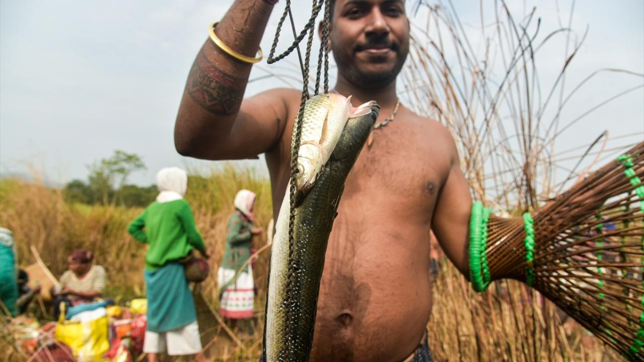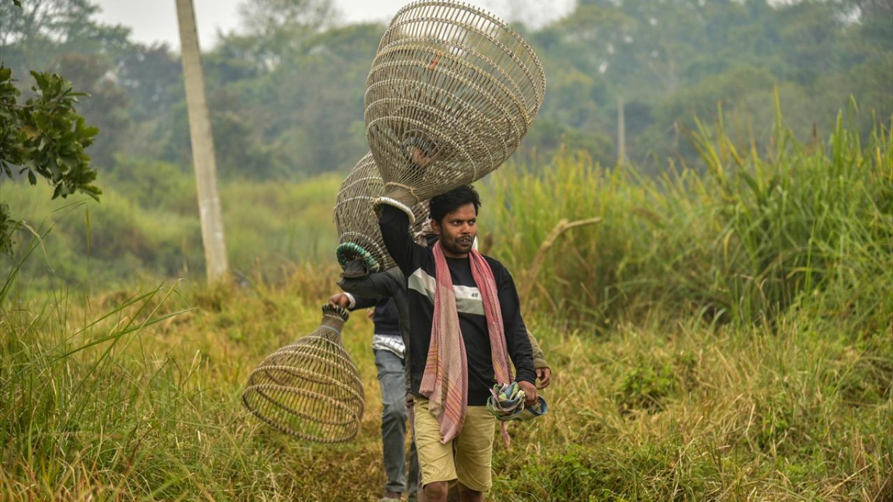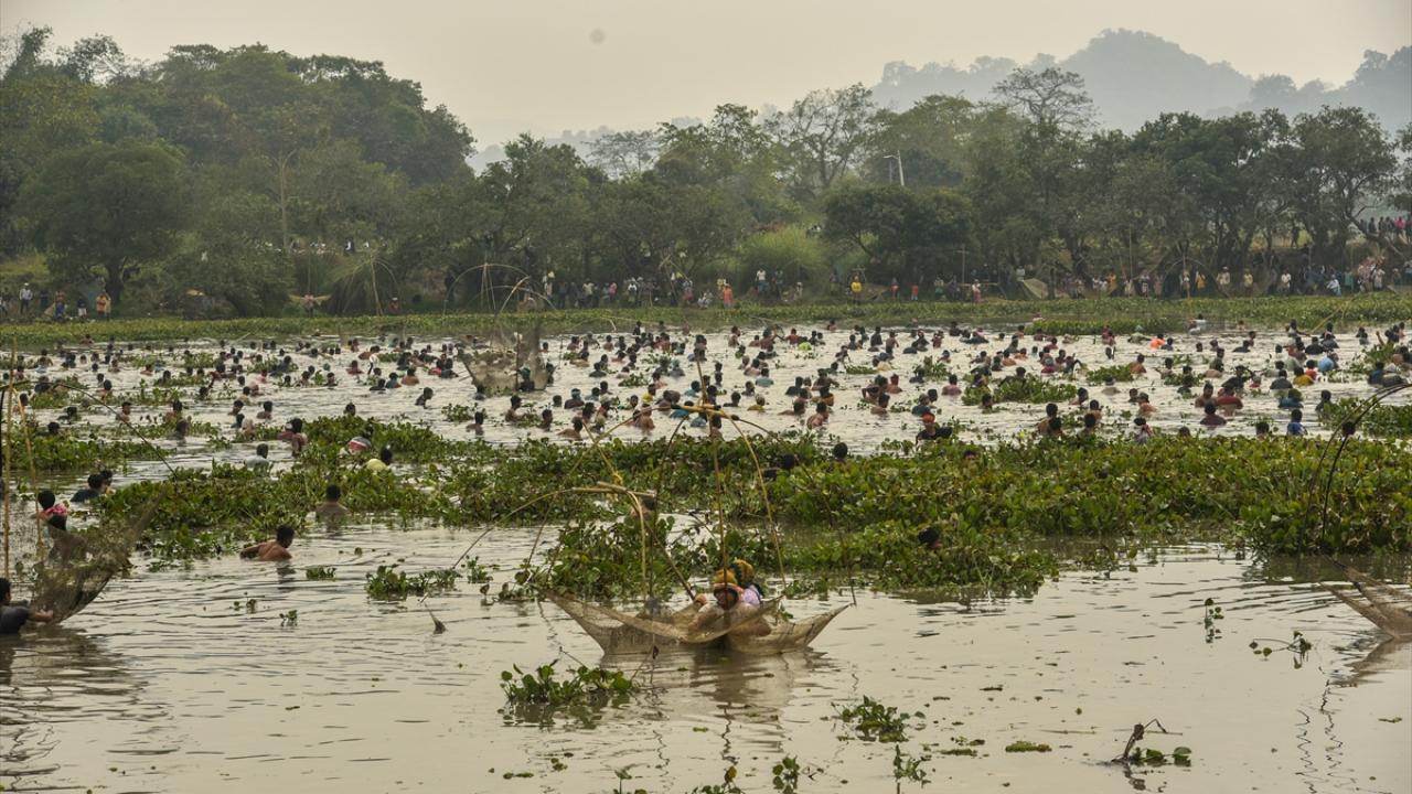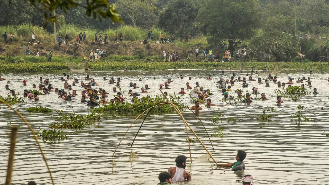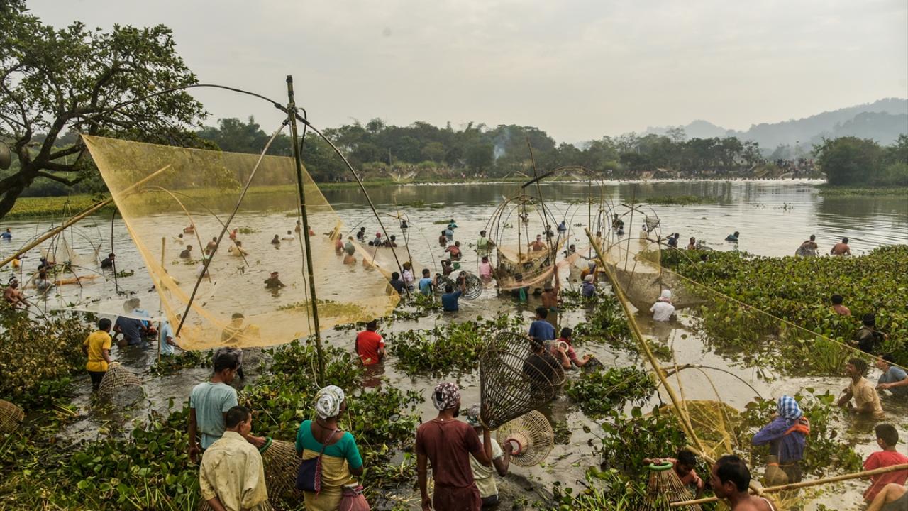 Hindistan'ın Kamrup kentinde, hasat sezonunun sonunu işaret eden ocak ayında kutlanan Magh Bihu kapsamında geleneksel ekipmanların kullanıldığı balıkçılık etkinliği devam ediyor.