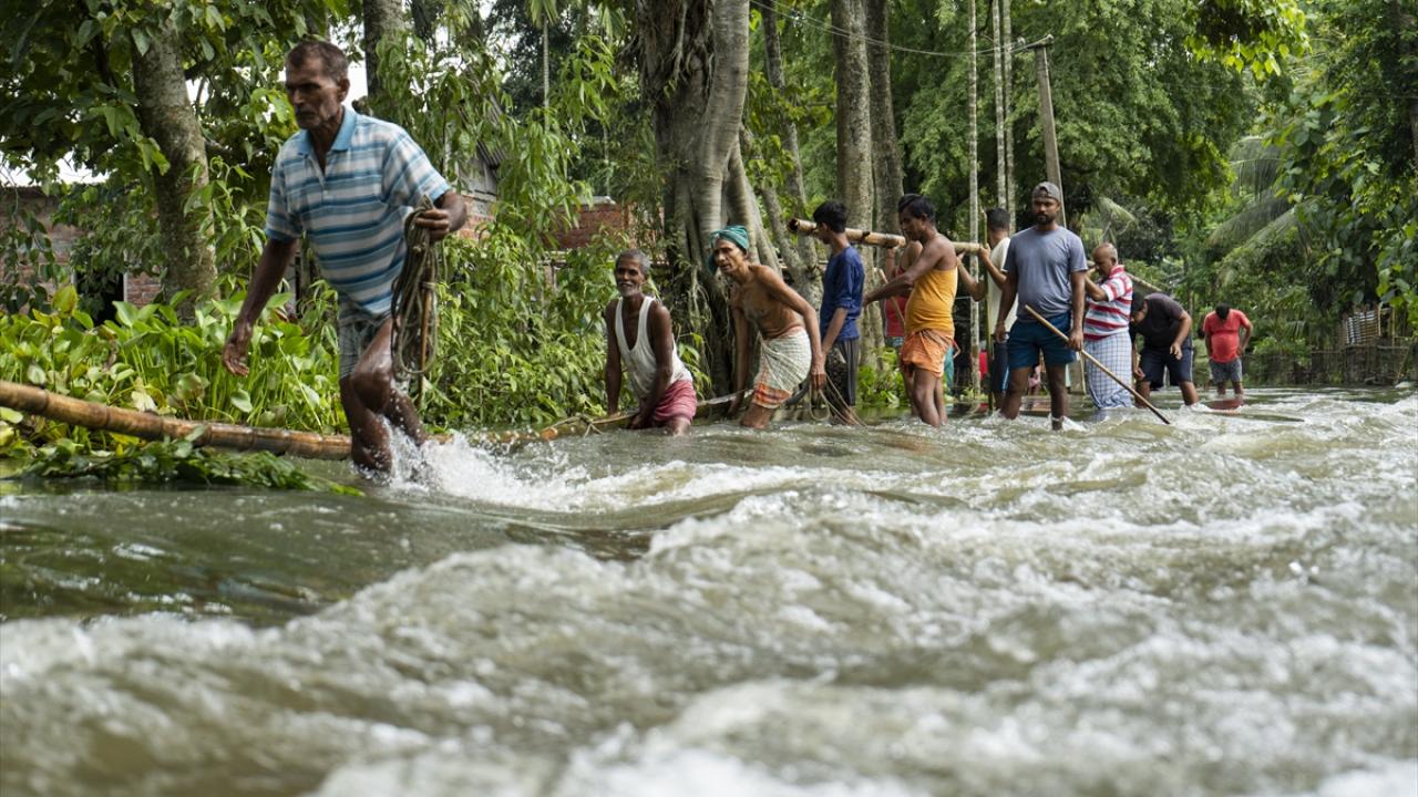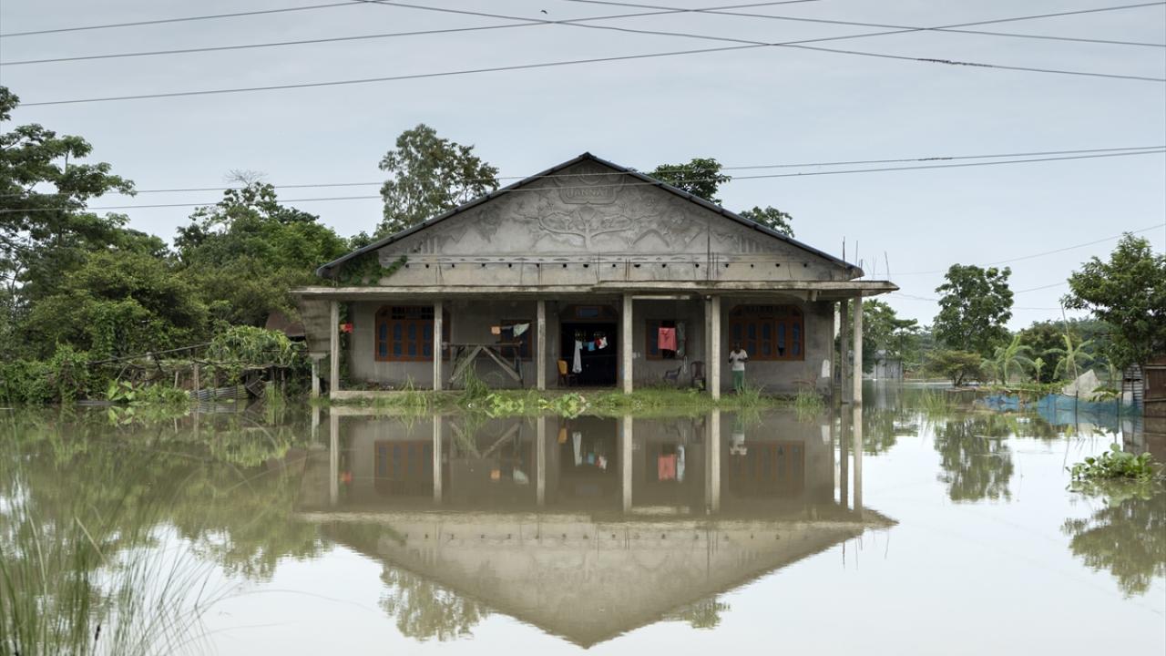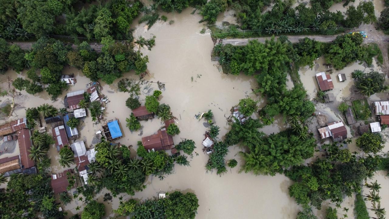 Hindistan'ın Barpeta kentinde Pahumara nehrinin taşması sonucu yıkılan setin yakınında köy sular altında kaldı.
