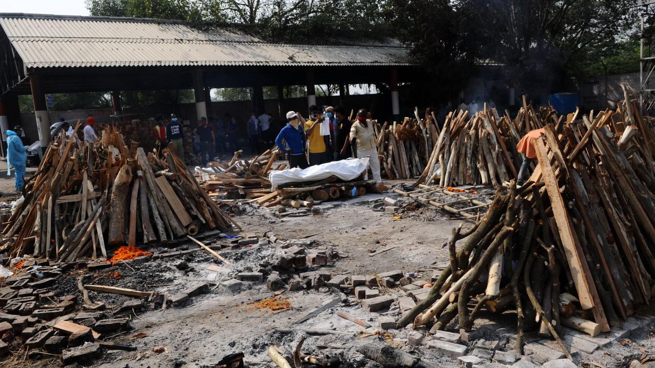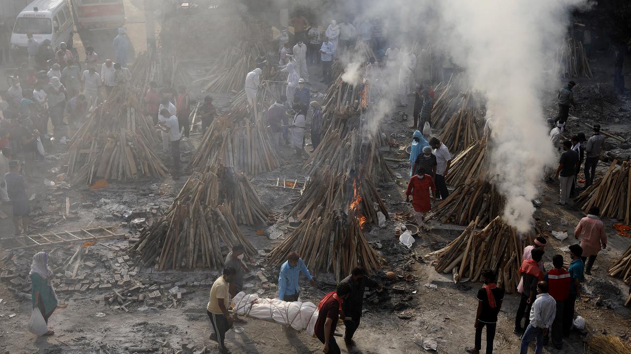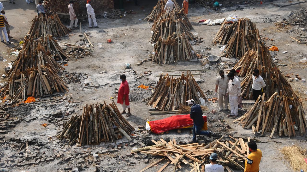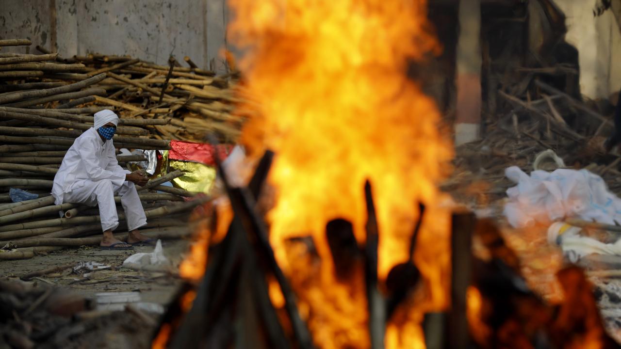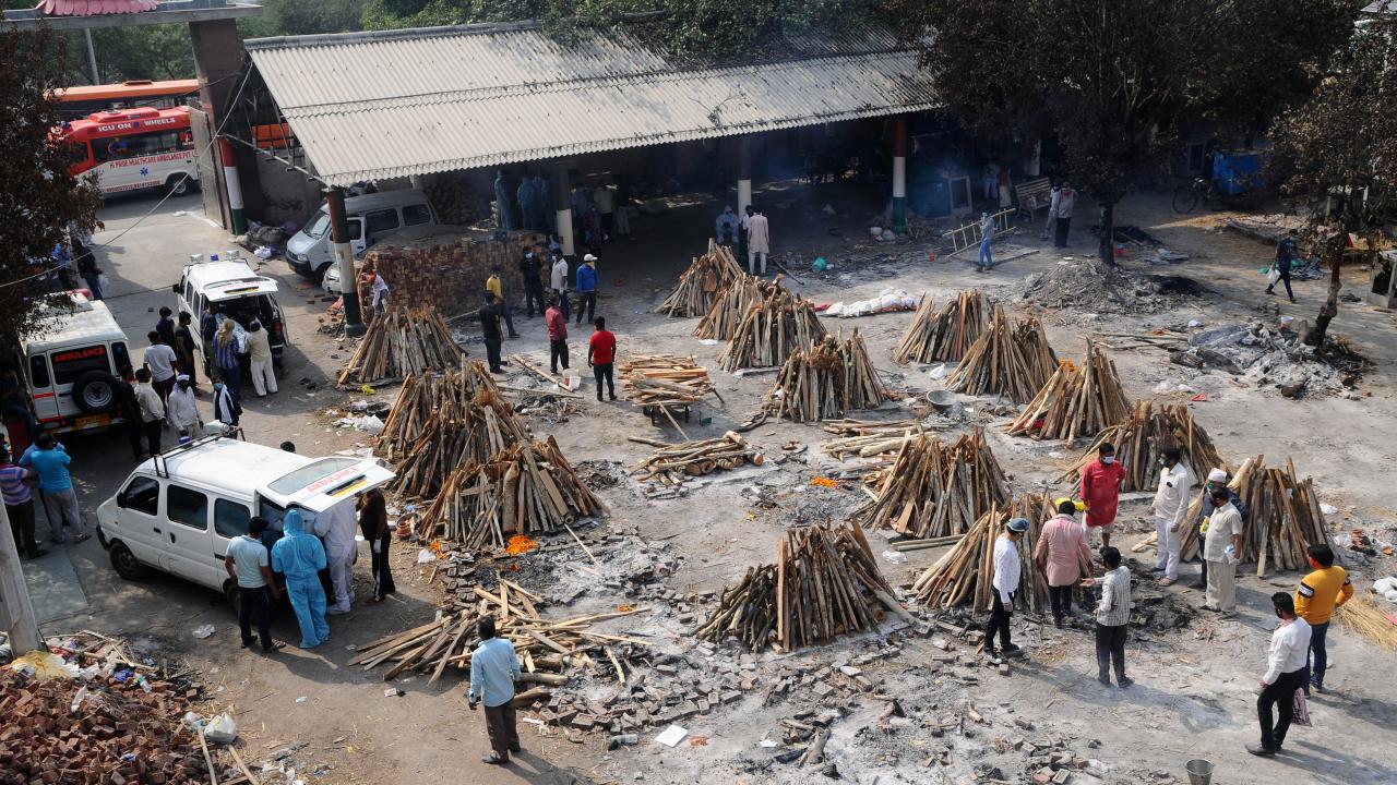 Başkent Yeni Delhi`de toplu krematoryumda cenaze işlemleri devam ederken koruyucu kıyafetler giyen görevliler, koronavirüs nedeniyle ölen kurbanları Hindu geleneklerine göre yakma işlemleri için hazırlıyor.
