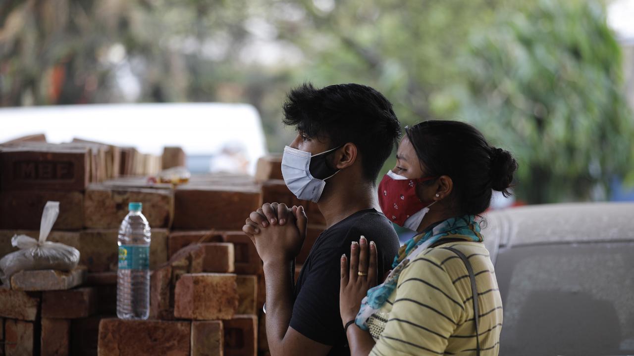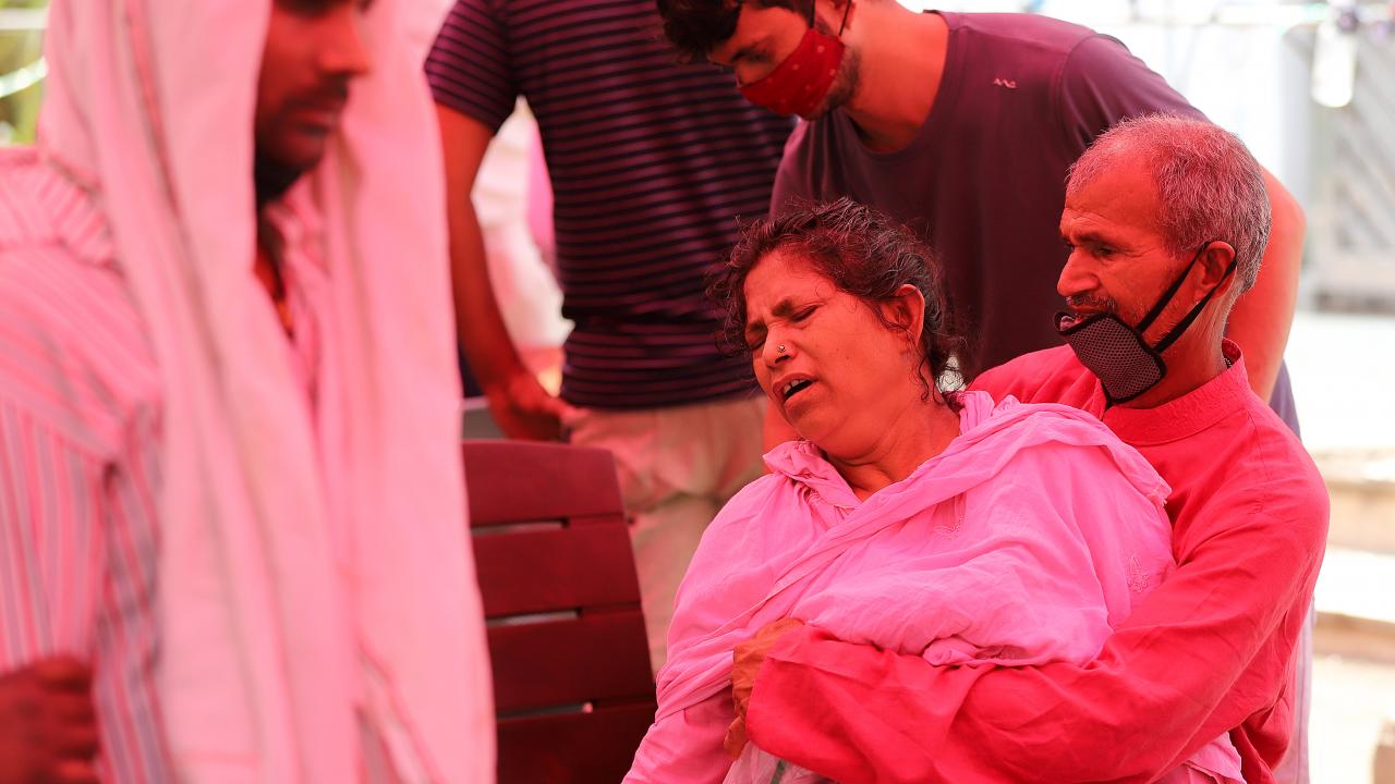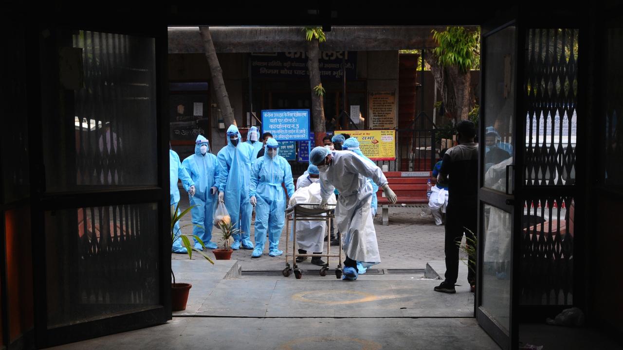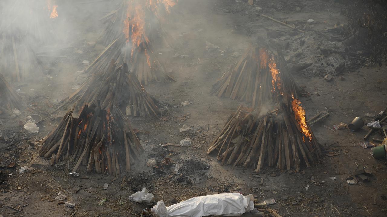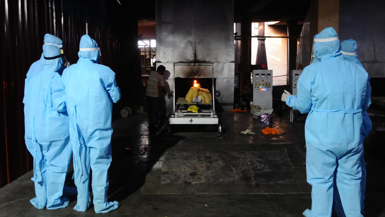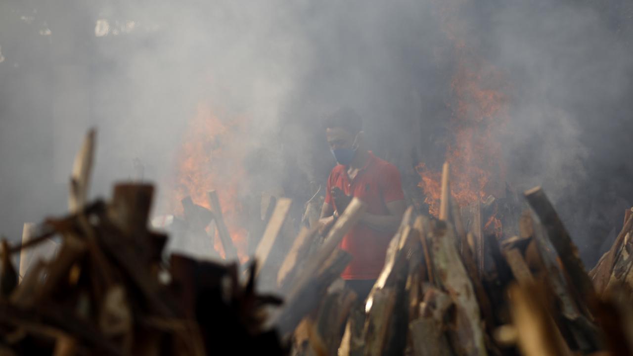 Başkent Yeni Delhi`de toplu krematoryumda cenaze işlemleri devam ederken koruyucu kıyafetler giyen görevliler, koronavirüs nedeniyle ölen kurbanları Hindu geleneklerine göre yakma işlemleri için hazırlıyor.