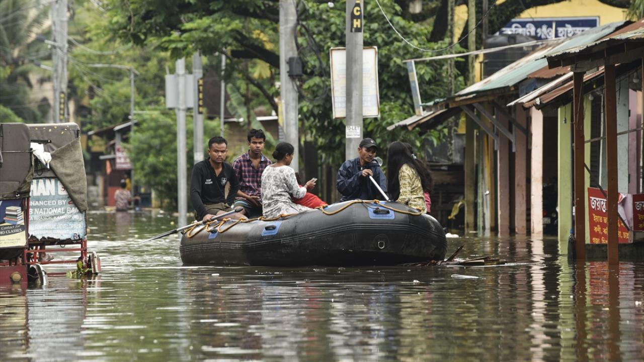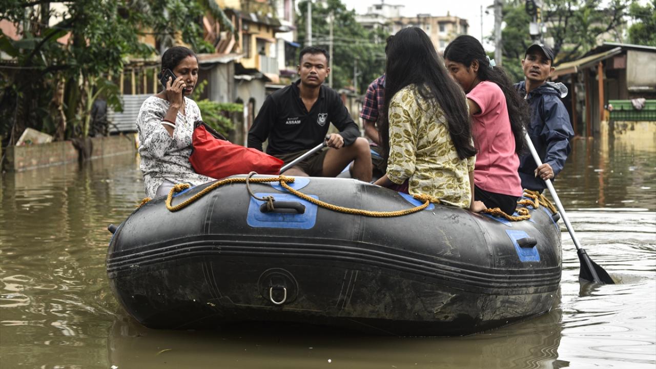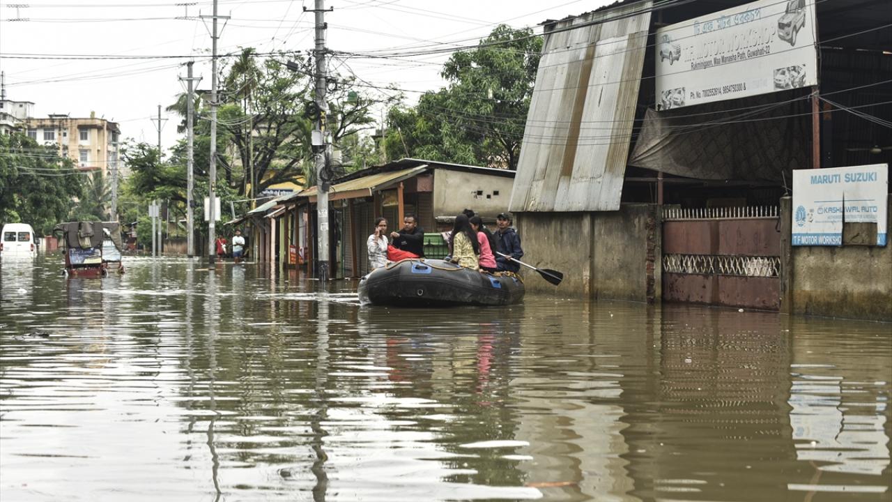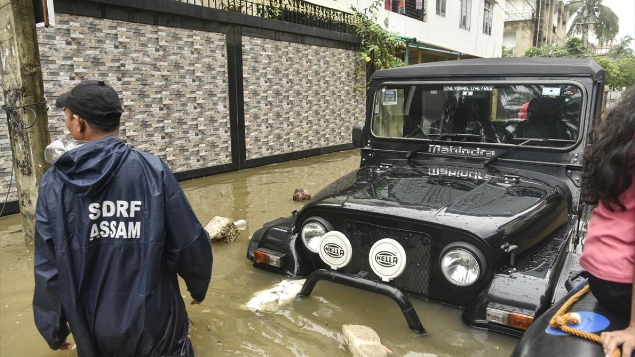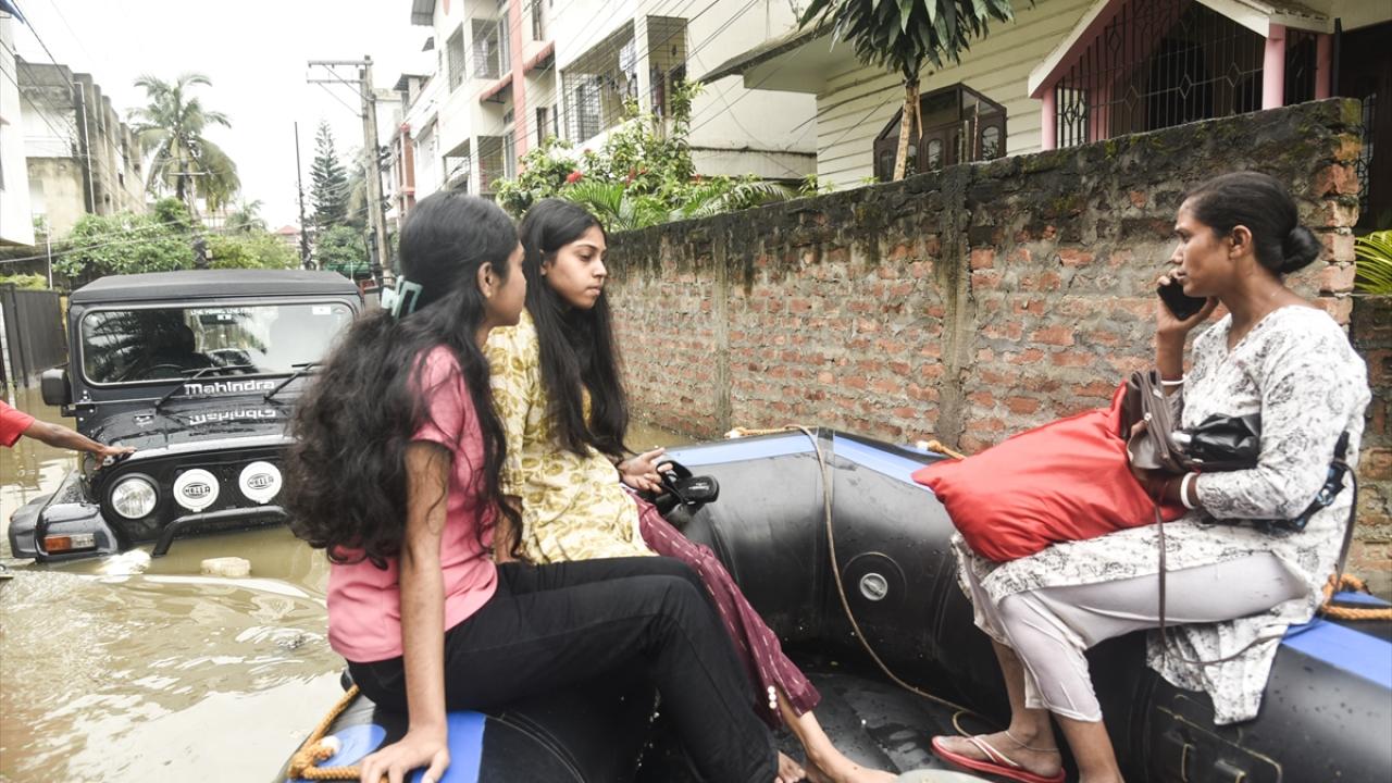 Afet müdahale ekipleri (SDRF) Rukminigaon bölgesinde su baskını altında kalan caddelerde mahsur kalan vatandaşları ve araçları kurtarma çalışması yaptı.