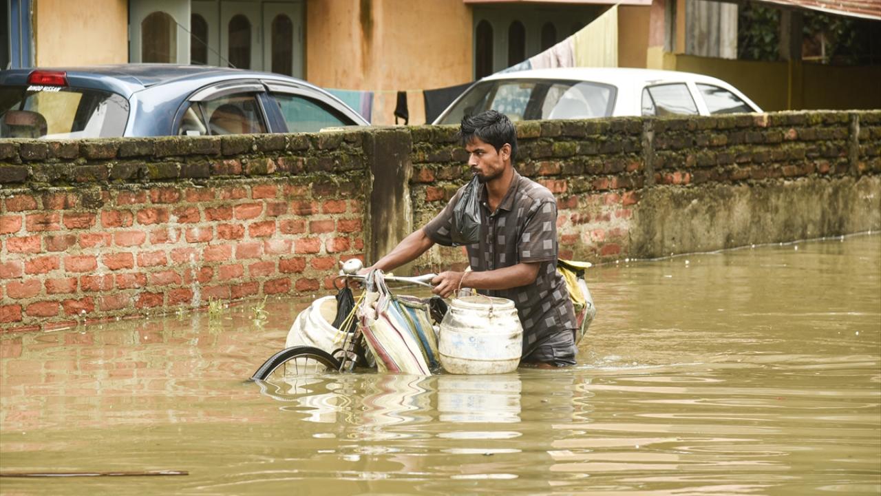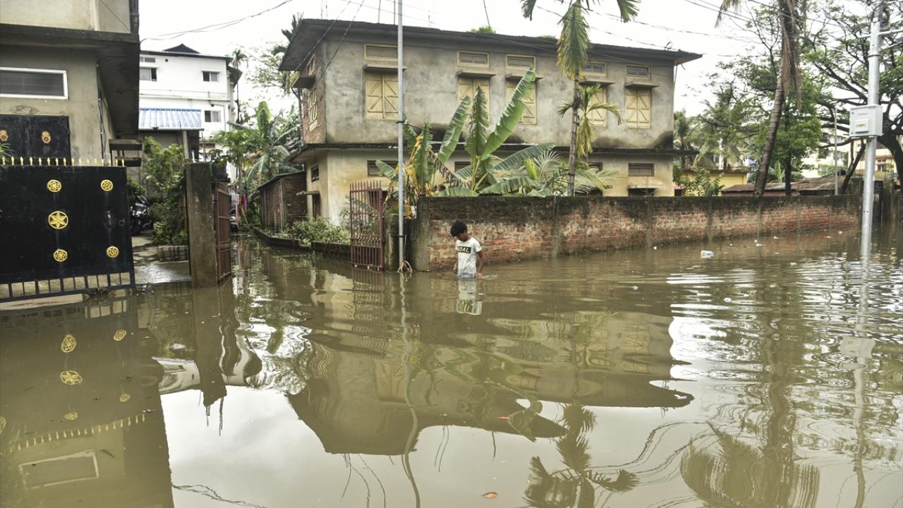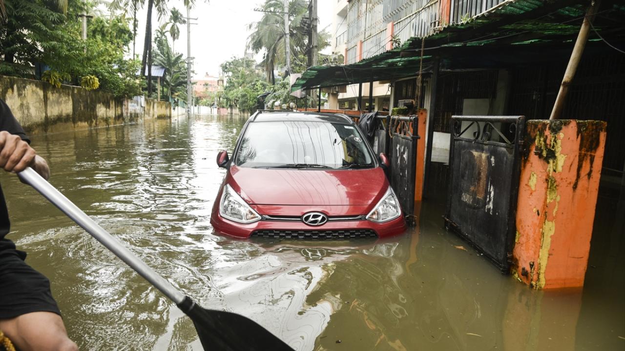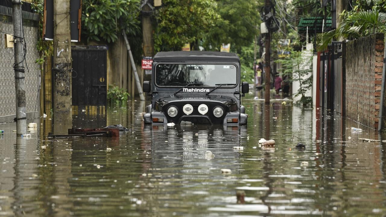 Afet müdahale ekipleri (SDRF) Rukminigaon bölgesinde su baskını altında kalan caddelerde mahsur kalan vatandaşları ve araçları kurtarma çalışması yaptı.