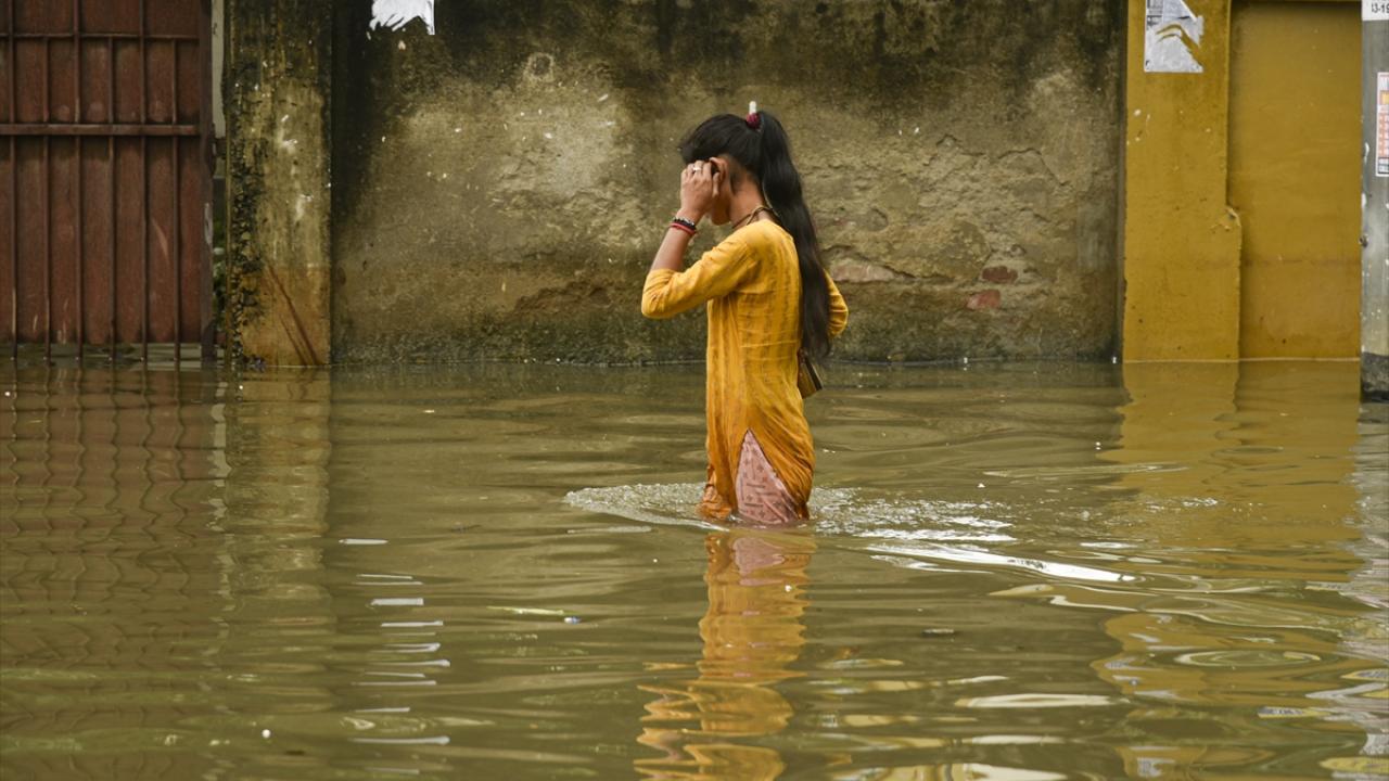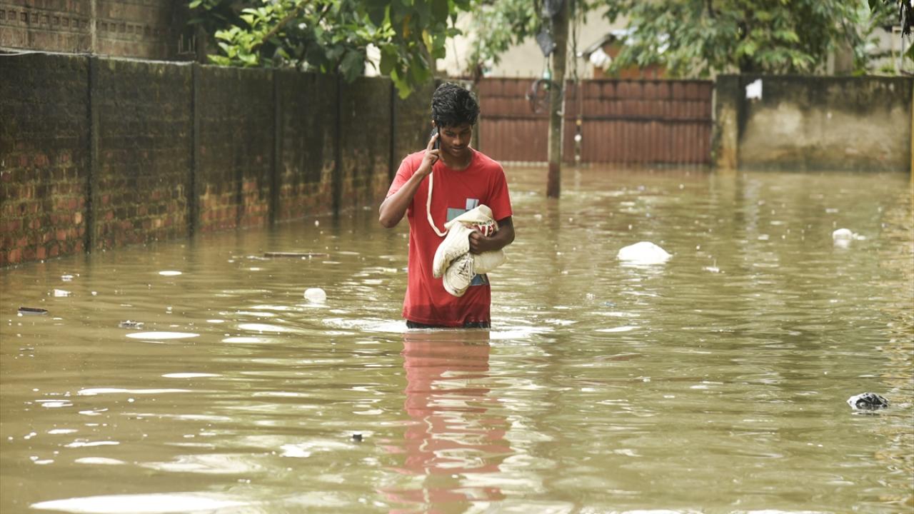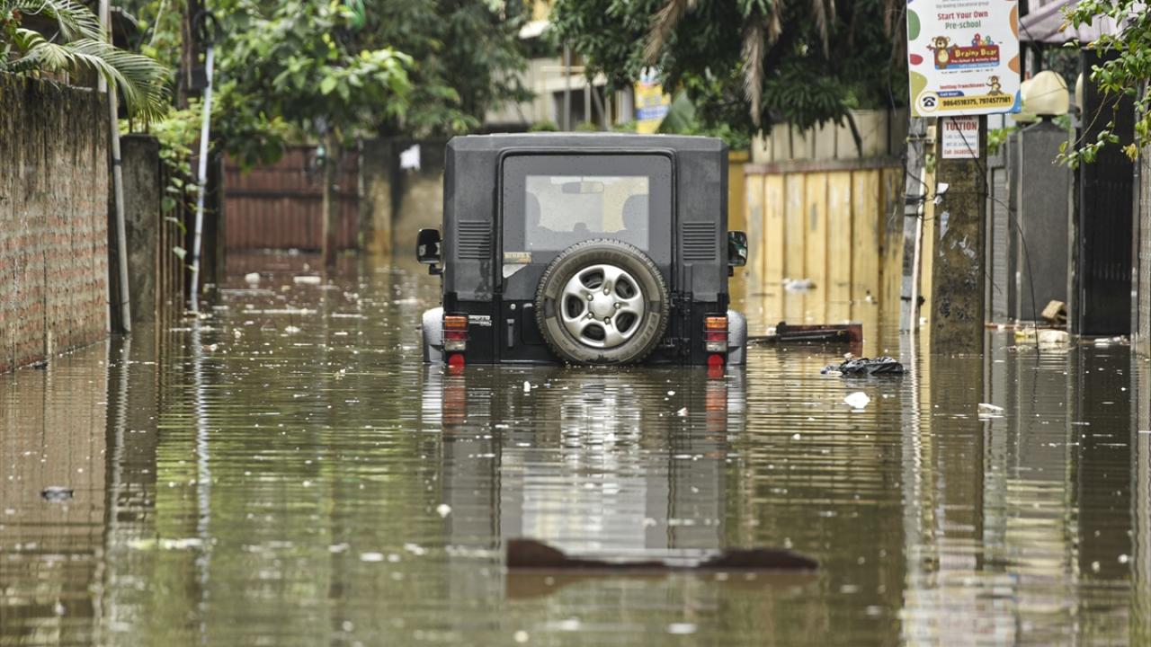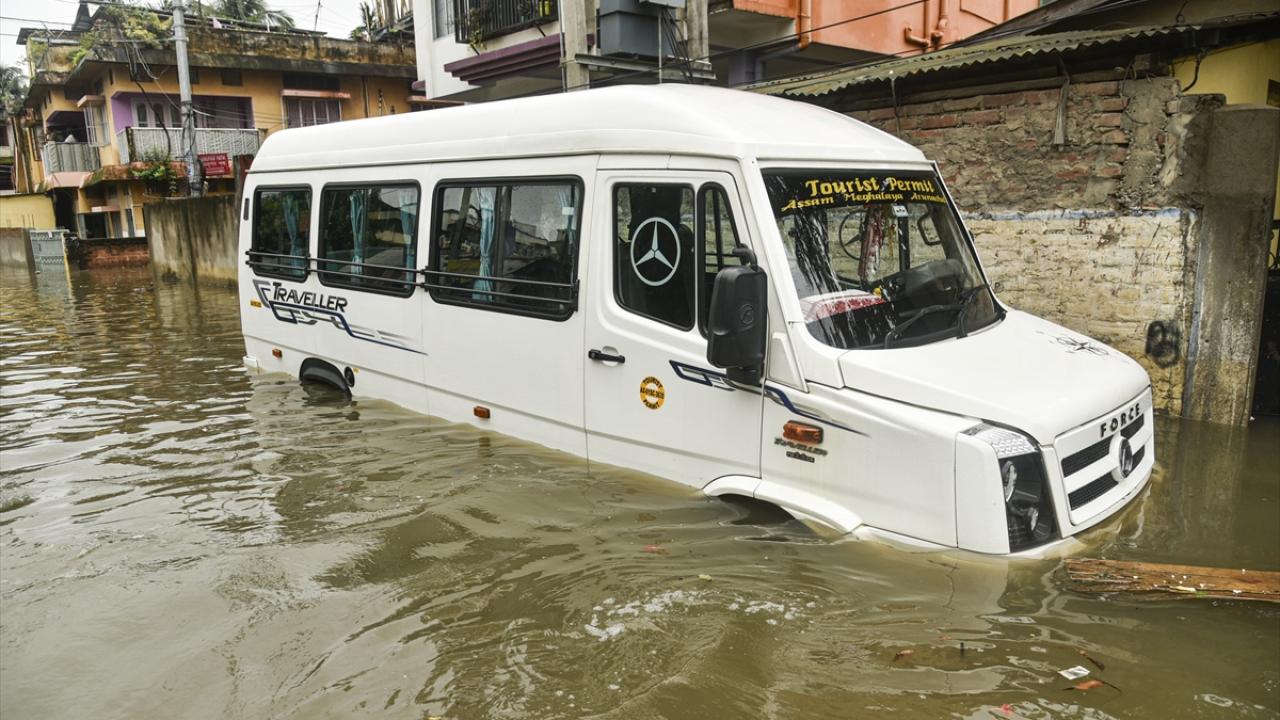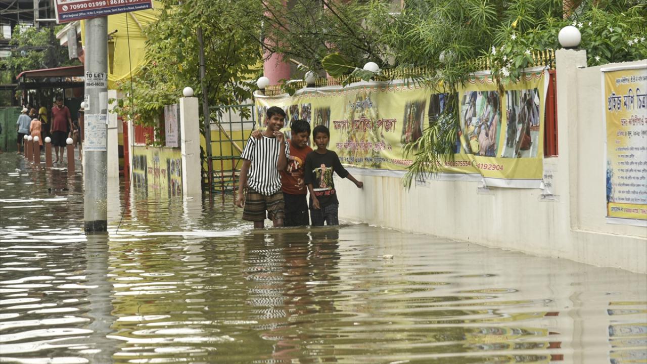 Afet müdahale ekipleri (SDRF) Rukminigaon bölgesinde su baskını altında kalan caddelerde mahsur kalan vatandaşları ve araçları kurtarma çalışması yaptı.