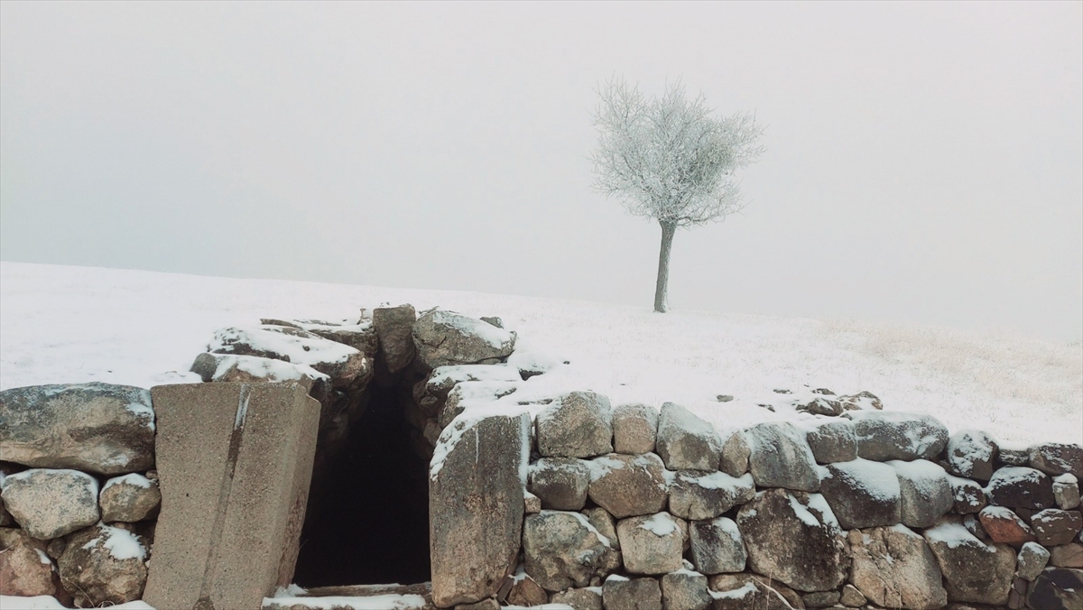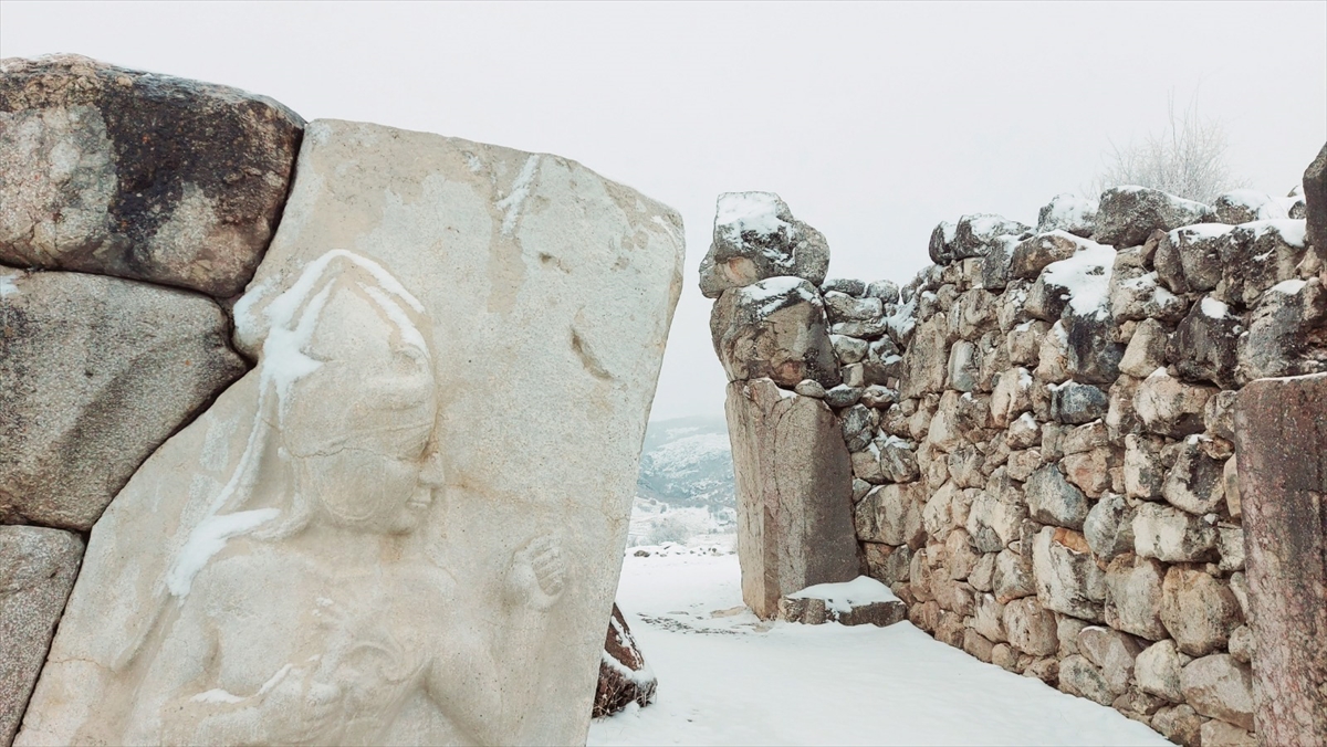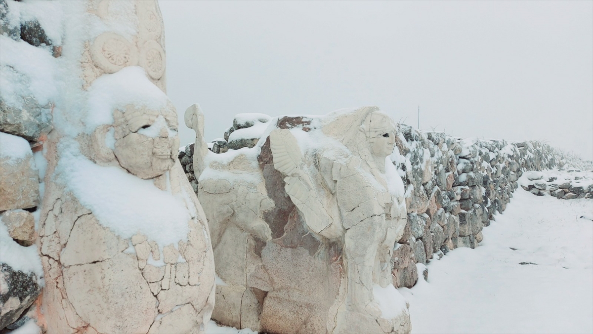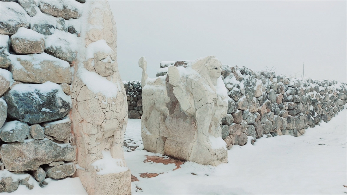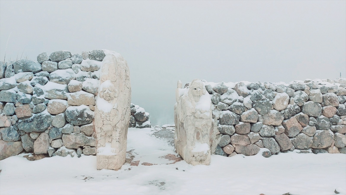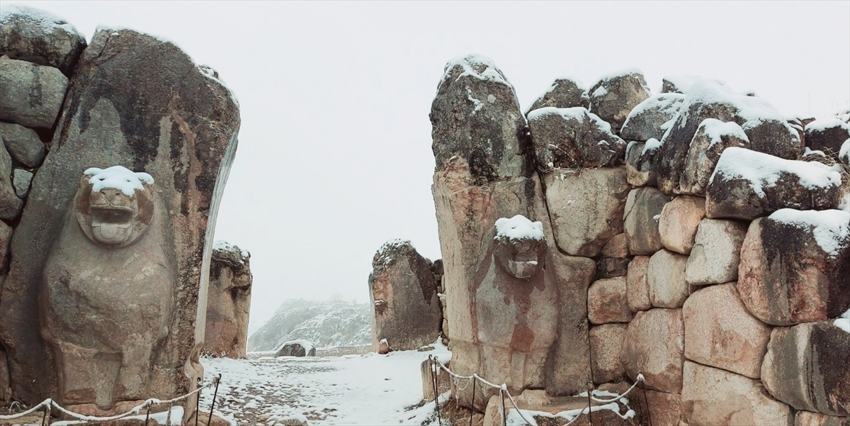 Ören yerinin simge eserleri Boğazköy Sfenksleri ve Aslanlı Kapı, kar yağışıyla güzel görüntüler oluşturdu.